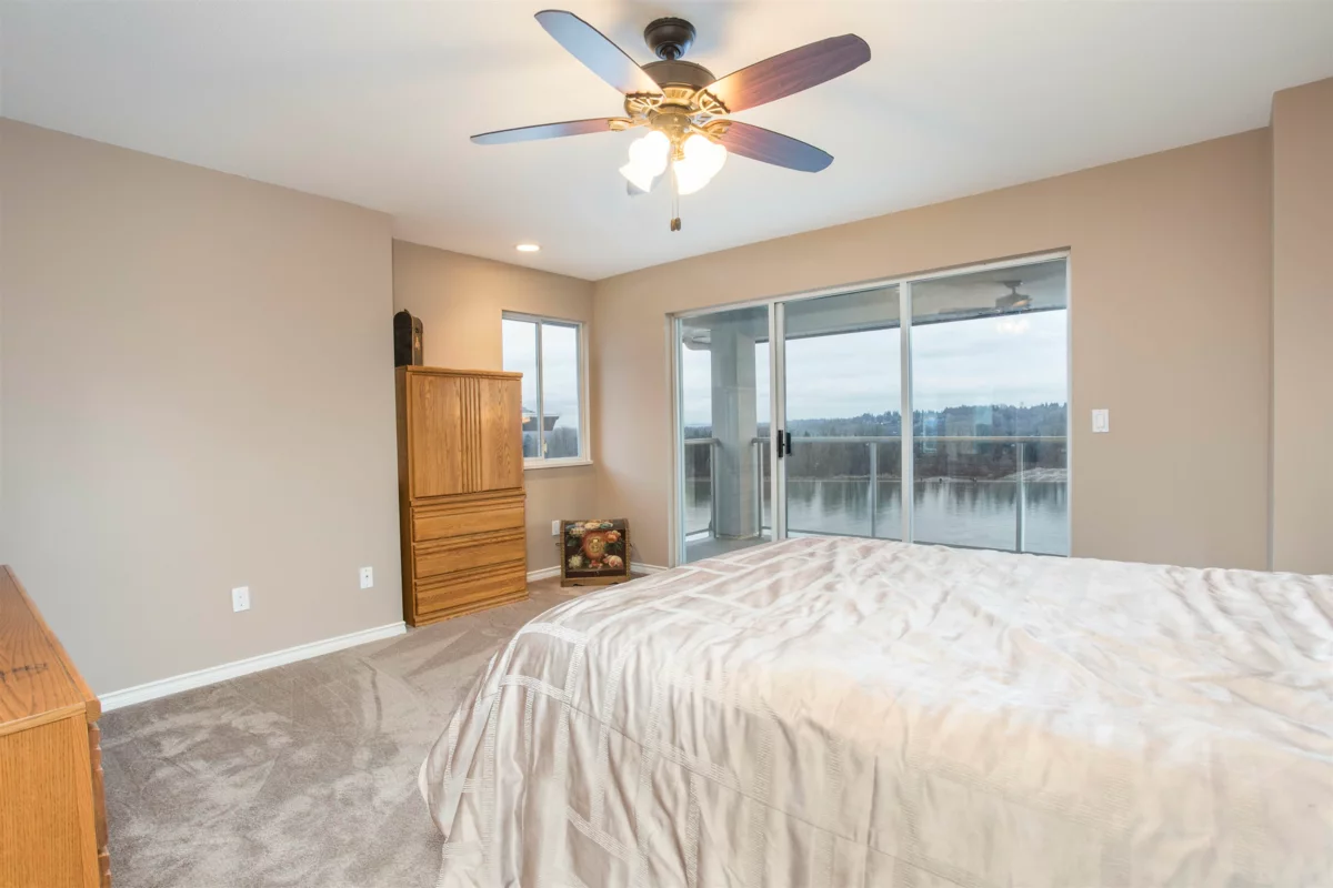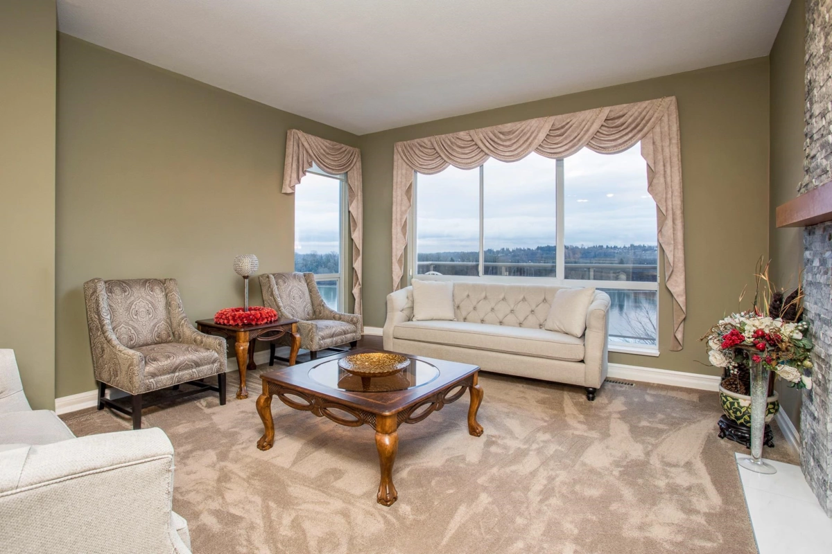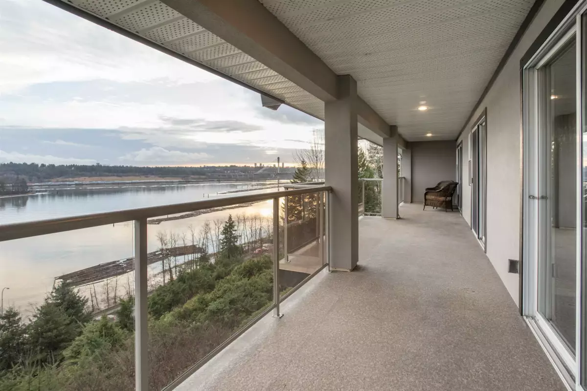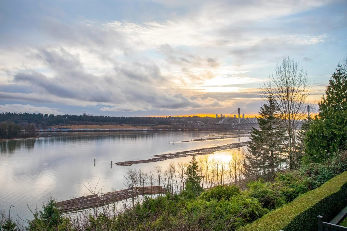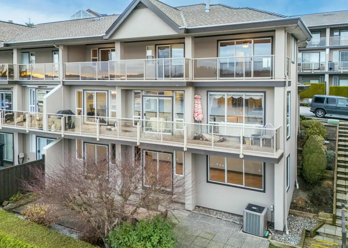 Incredible, Oversized, View, Townhouse in Citadel Bluffs. Front row with expansive balconies with views of Fraser River, Surrey skyline, Port Mann Bridge and Douglas Island. Spacious principal suite features an updated five-piece ensuite with double walk-in shower, Jacuzzi soaking tub, and walk-in closet. Four bedrooms up, fourth ideal as a vaulted office with built-ins. Updated LG laundry, quartz counters, skylights, and a circular staircase in a travertine-tiled grand foyer. Renovated kitchen with all new matching Samsung stainless appliances opens to eating area and family room with balcony access. Fully finished, over-height basement with rec room, wet bar, gas fireplace, bath, storage, and patio access. Side-by-side garage. Three gas fireplaces, four baths, light-filled throughout.