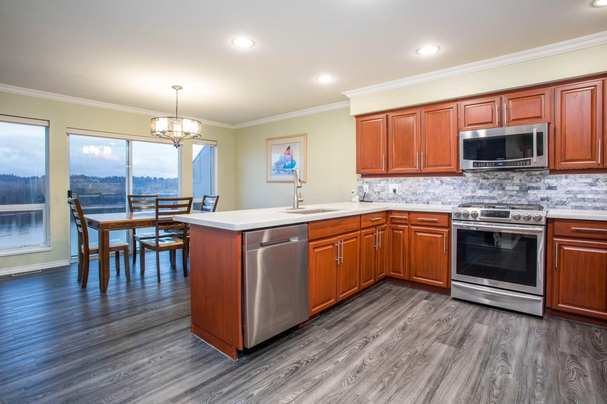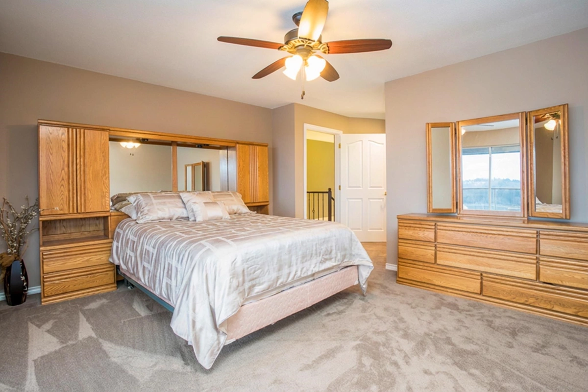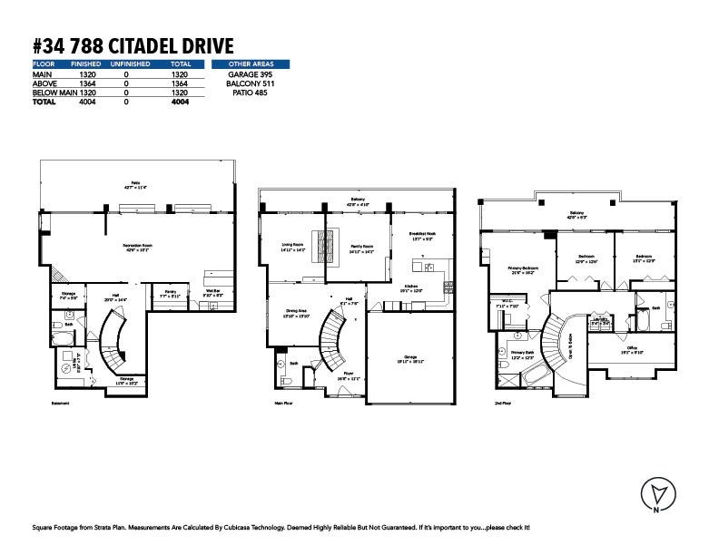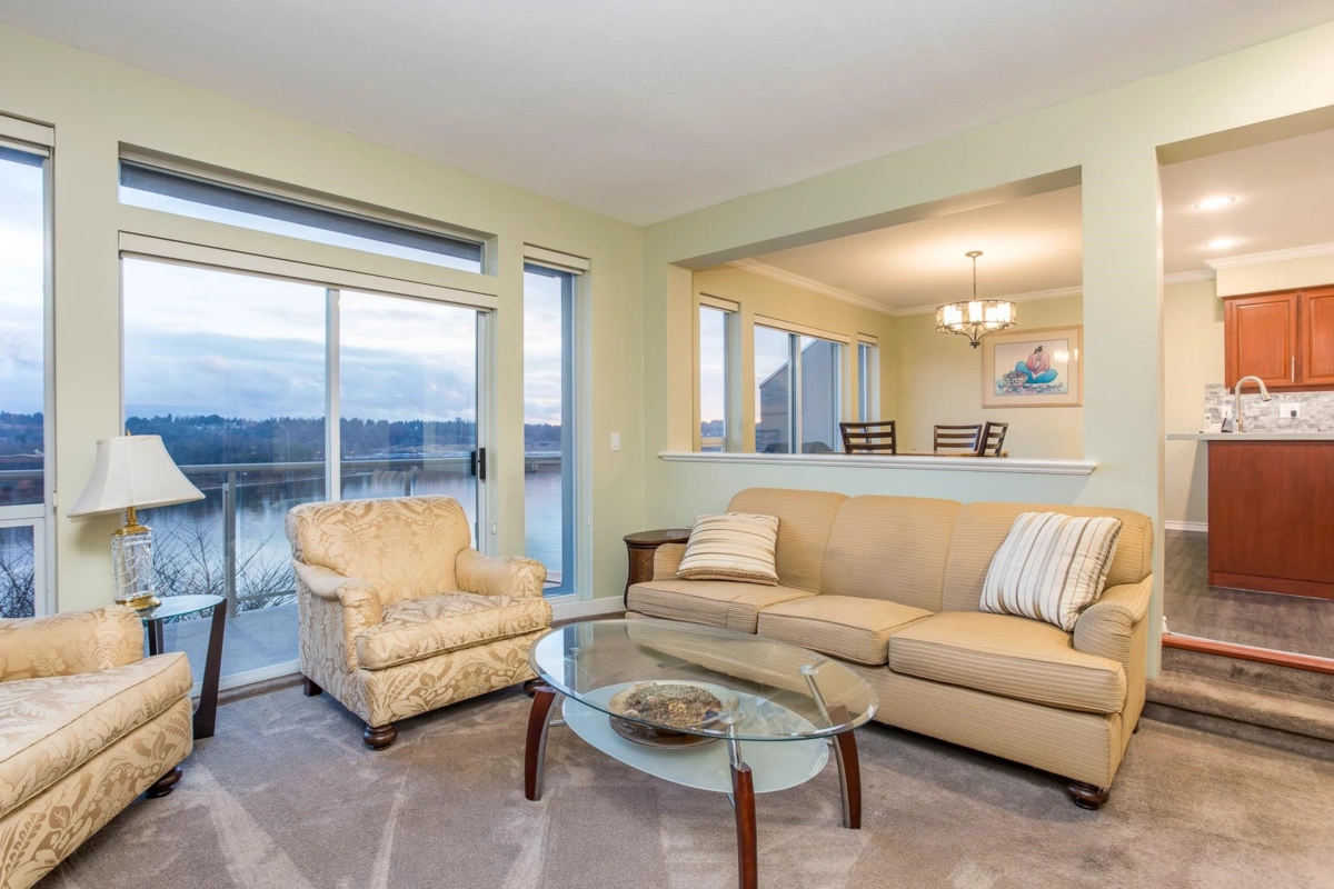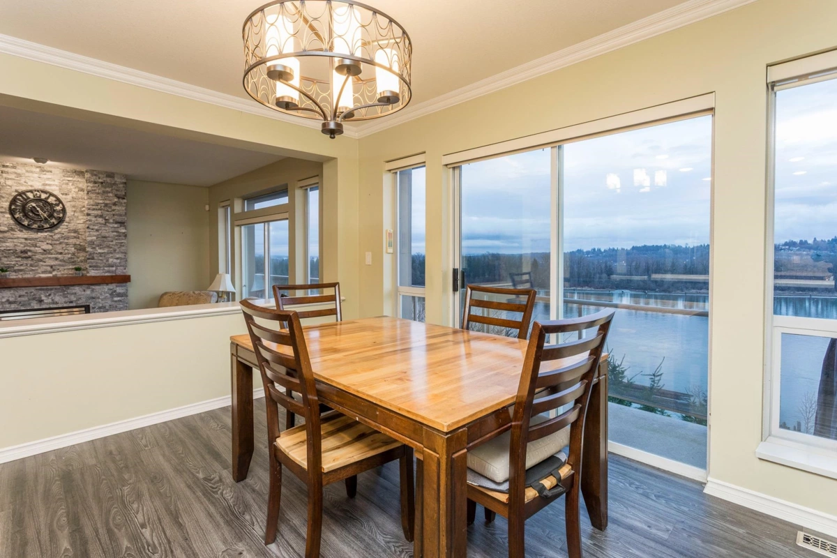 Incredible, Oversized, View, Townhouse in Citadel Bluffs. Front row with expansive balconies with views of Fraser River, Surrey skyline, Port Mann Bridge and Douglas Island. Spacious principal suite features an updated five-piece ensuite with double walk-in shower, Jacuzzi soaking tub, and walk-in closet. Four bedrooms up, fourth ideal as a vaulted office with built-ins. Updated LG laundry, quartz counters, skylights, and a circular staircase in a travertine-tiled grand foyer. Renovated kitchen with all new matching Samsung stainless appliances opens to eating area and family room with balcony access. Fully finished, over-height basement with rec room, wet bar, gas fireplace, bath, storage, and patio access. Side-by-side garage. Three gas fireplaces, four baths, light-filled throughout.