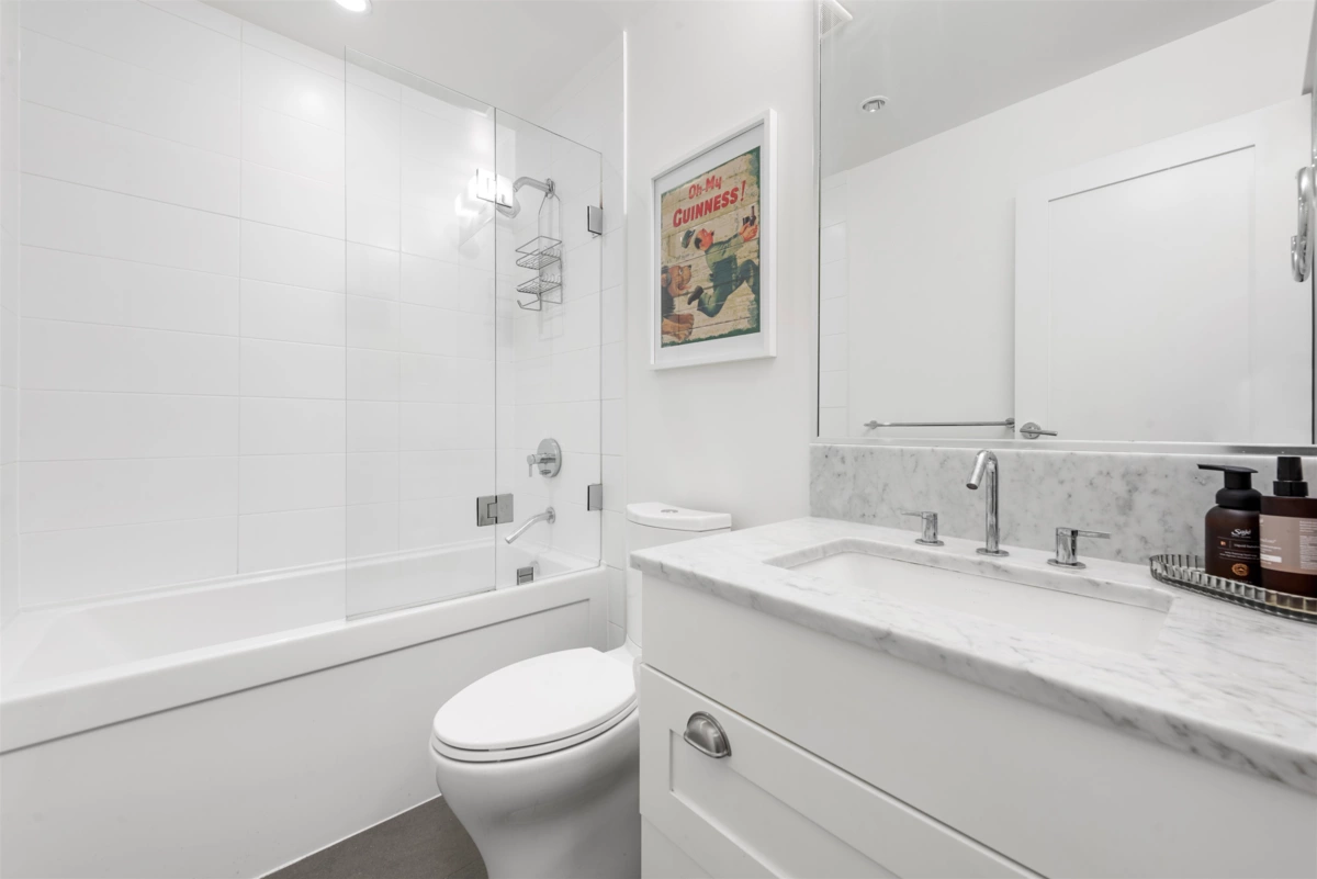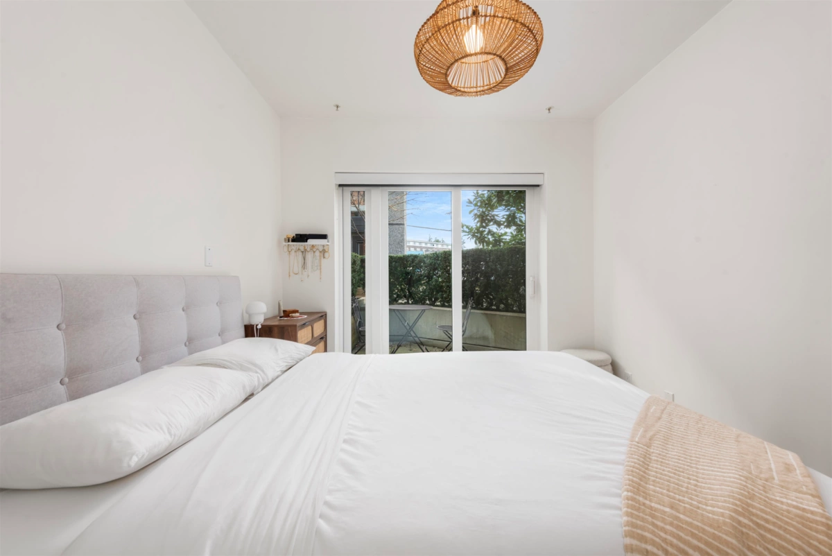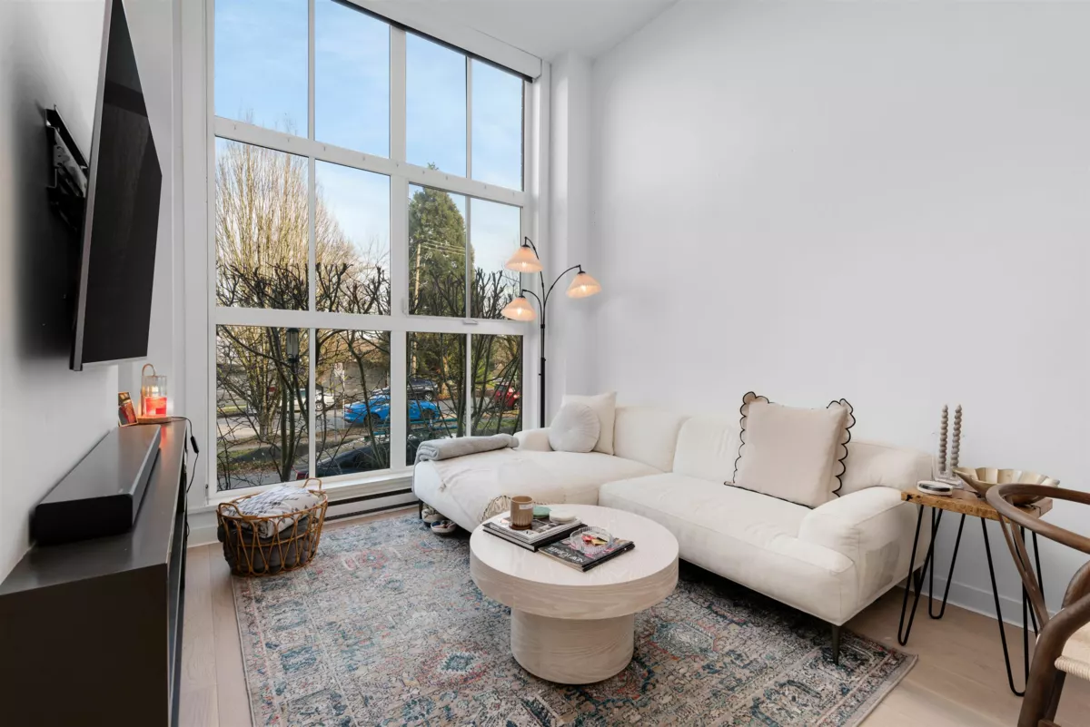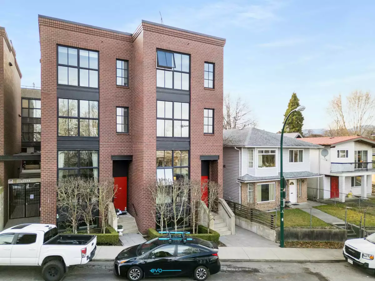 Welcome to Mason by Boffo, a boutique collection of modern townhomes located across from Trout Lake Park. This bright, stylish home features private street entry, soaring 12-foot ceilings, oversized windows, and open-concept living. The sleek kitchen includes quartz counters, marble tile backsplash, matte lacquer cabinets, and premium appliances. Enjoy a sun-soaked west-facing patio off the primary suite and a second bedroom with space for a home office. Updates include new hardwood floors throughout, custom built-in closets, and a new hot water tank. Includes one secure parking stall, storage locker, and bike storage. Steps to Trout Lake, trails, Commercial Drive, and SkyTrain. A must-see!