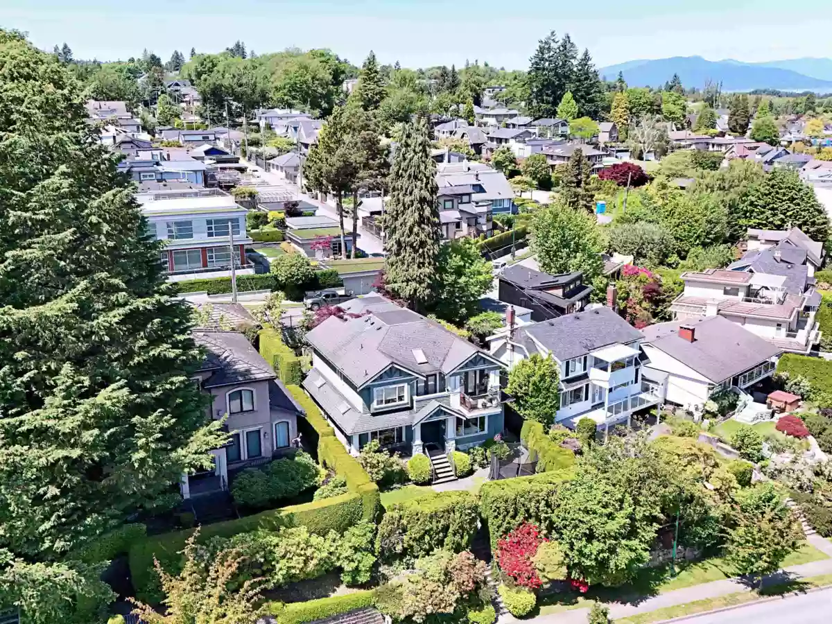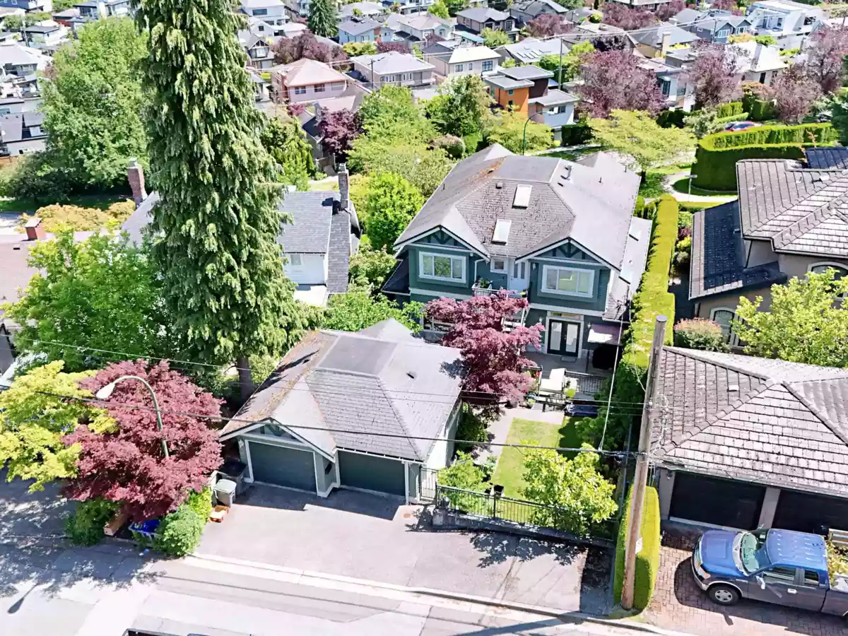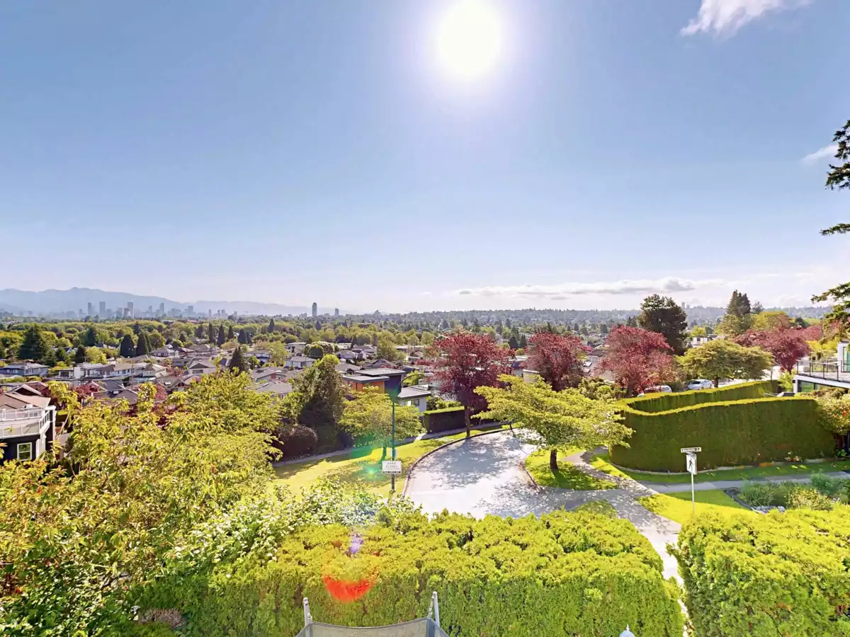 Beautiful Dunbar home built in 1998 Perched on a 50 x 110 ft. maturely landscaped property on the high side of Blenheim St. with expansive city, mtn. and ocean views! The main floor of this reverse floorplan home features a grand foyer entrance, separate liv. rm. open kitch., living, & dining, Flex room or 5th bdrm, + den. Below has 4 large bdrms incl. Primary & 2 baths. The top floor has a separate 2 bdrm, 2 bath suite not internally connected to the main and basement floors. Both living accomm. boast spectacular views, large rooms, hardwood flrs., granite counters, 3 gas fire places, large closets and well appointed en-suite bathrooms. Property has a park. pad and a 2 car garage with storage below. Gated-level front an back yards with mature landscaping. Parking accessed from Quadra St