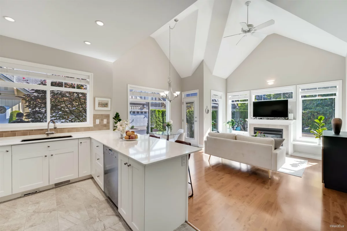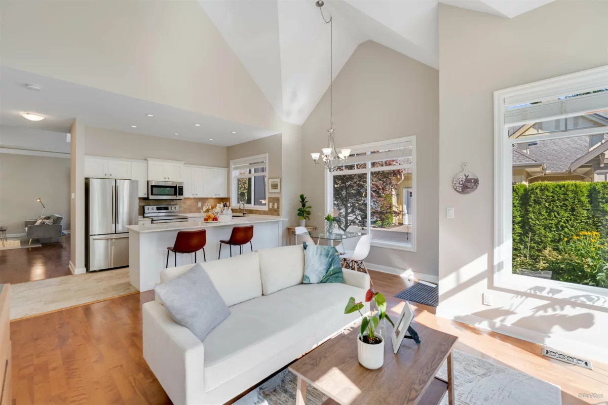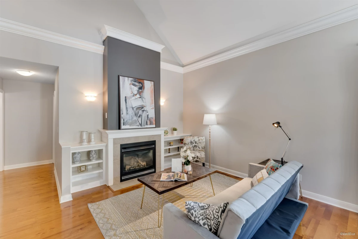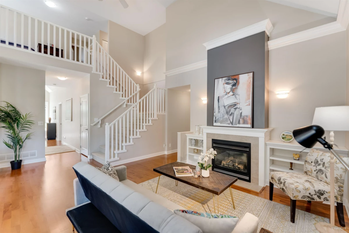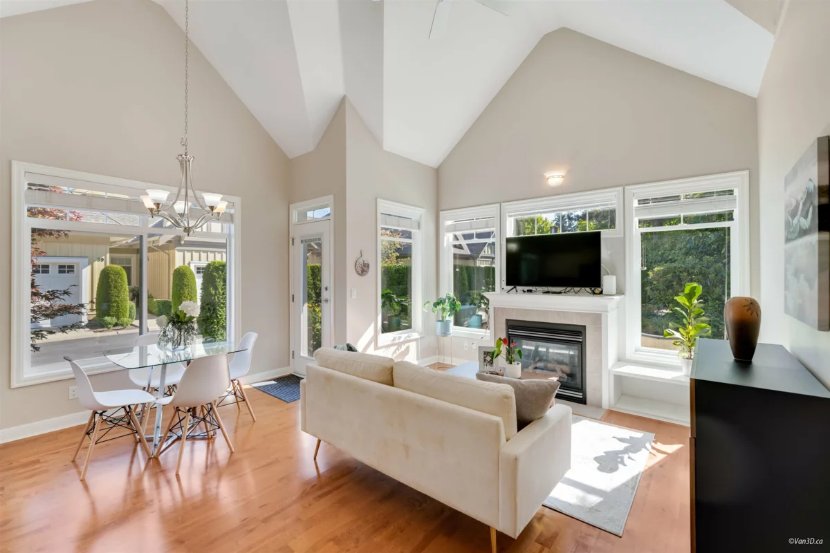 Welcome to Meridian Pointe — a prestigious gated community in South Surrey. This elegant 2,034 sq. ft. craftsman-style townhome features a main-floor primary suite with spa-like ensuite, a second ensuite bedroom, and a versatile loft/den easily converted to a third bedroom. Soaring 22' ceilings, skylights, and two gas fireplaces highlight the bright, open layout. Recent updates include a modern kitchen, hardwood floors, new carpets, and more. Enjoy a private backyard with lush gardens and an extended patio. Double garage, ample storage, and prime location near parks, shops, beaches, and top schools complete the package.