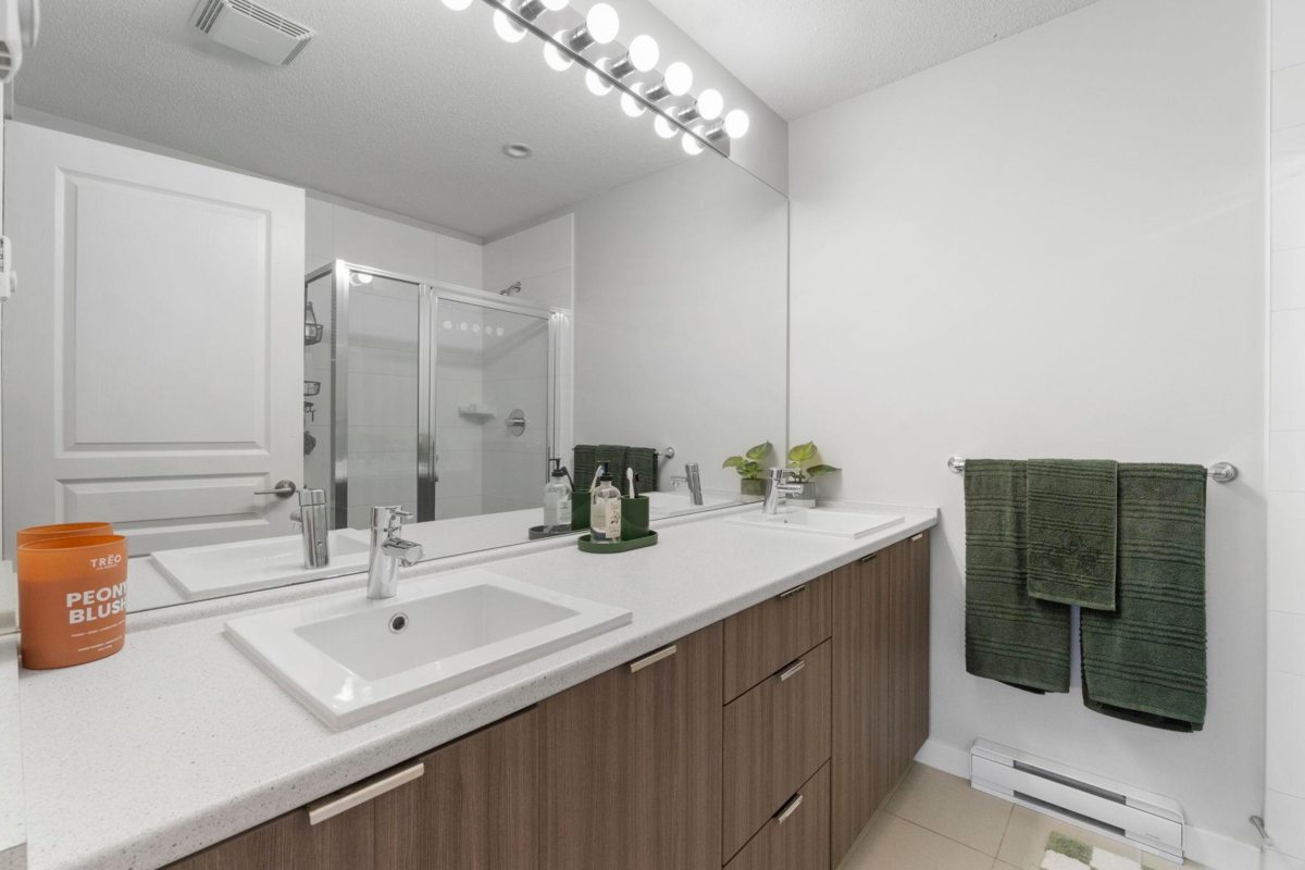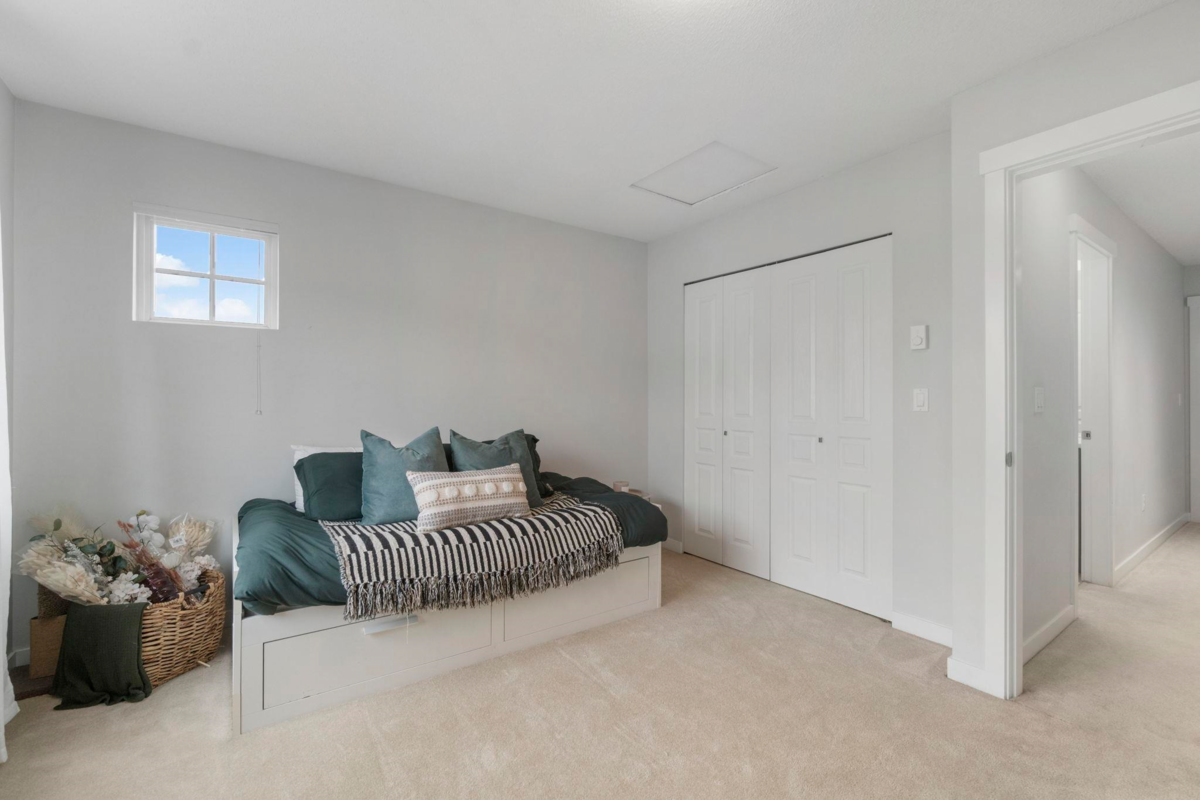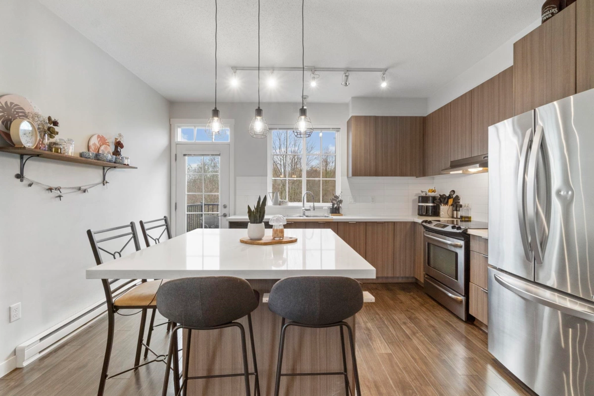 RARE CORNER UNIT with A BIG YARD! Bright and spacious 2-bed, 2-bath townhome at Brighton with tons of NATURAL LIGHT. Main floor features soaring 9' ceilings, a huge island kitchen with stone countertops, stainless steel appliances, and an open-concept living and dining area perfect for entertaining. Upstairs offers two generous bedrooms, including a master suite with walk-in shower and his-and-her sinks. Enjoy a 2-car garage, visitor parking right beside home, and a LARGE private BACKYARD backing the Discovery Trail with serene greenspace views. Access 8,500 SQFT of Club West amenities, including pool & hot tub, gym, hockey room, fireside lounge, pool table and media room, theatre, dog wash station. Minutes to highway, Mall shops, and restaurants. Do not miss out on this opportunity!