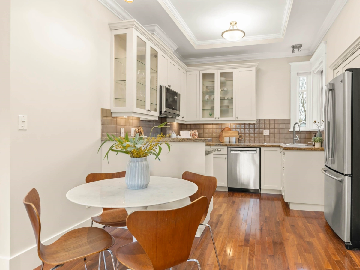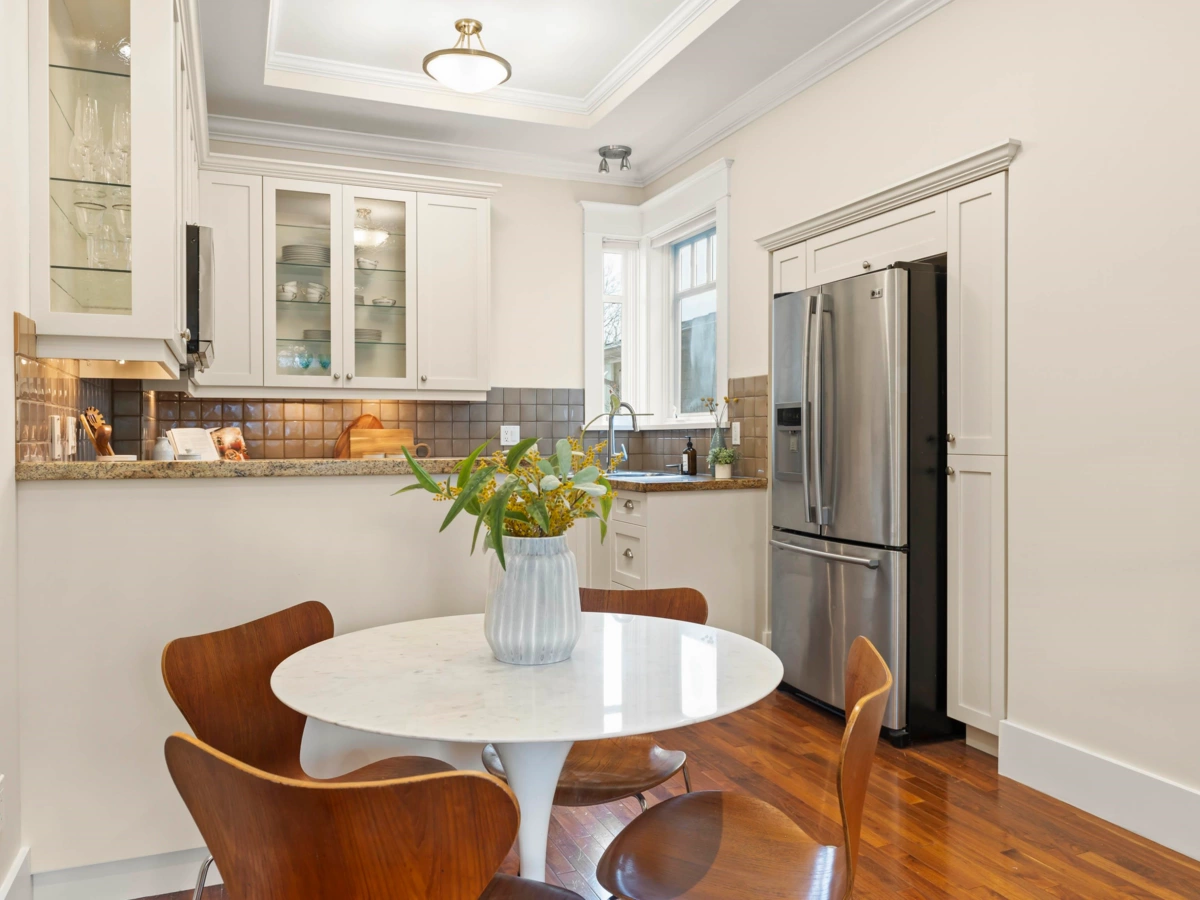 Beautiful Kitsilano craftsman-style 2-level home blending heritage charm with modern updates. Features 9'-12' vaulted ceilings, crown moulding, maple/cherry hardwood floors, vented skylights and a cozy gas fireplace. Updated kitchen with refinished cabinets, granite counters, Samsung gas stove and upgraded appliances. Two bedrooms each with full ensuites plus a handy workspace nook. Enjoy in-floor geothermal radiant heat, built-in speakers, fresh paint and upgraded lighting. Landscaped gardens, private parking pad and an unbeatable walkable location close to schools, parks, shops, transit and the beach. Minutes to UBC and downtown.