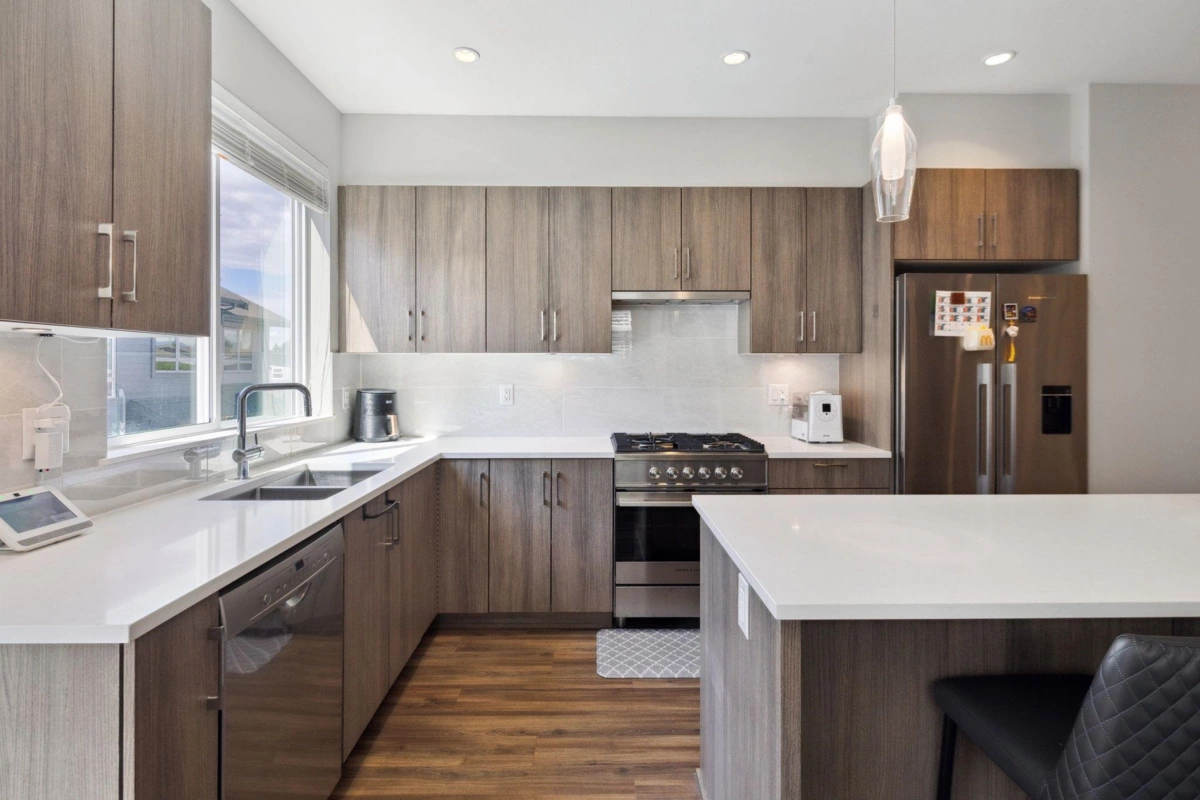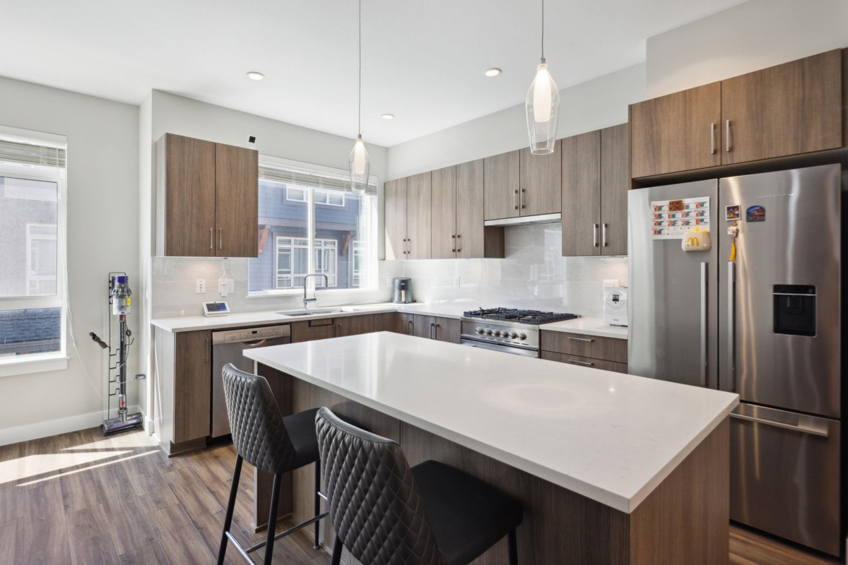 Welcome to WEMBLEY - a collection of 109 modern townhomes built by reputable developer CITIMARK! This CORNER 4 BED + DEN + 3.5 BATH home has been meticulously maintained by original owner. The PERFECT floorplan: bottom floor features a full BED & BATH, ideal for elderly or guests. Main level boasts an open-concept design & high ceilings filled w/ natural light. Gourmet kitchen includes Fisher & Paykel appliances, quartz countertop, large island & premium cabinetry. 3 spacious bedrooms upstairs that can fit KING bed, along with double sinks in the ensuite. Energy efficient GEOTHERMAL heating & COOLING throughout. SideXSide DOUBLE GARAGE upgraded w/ level 2 EV charging. Patio & private yard has gas bib built in for BBQ & entertaining needs. THIS WILL NOT LAST! OPEN HOUSE MAY 11&12 2-4PM.