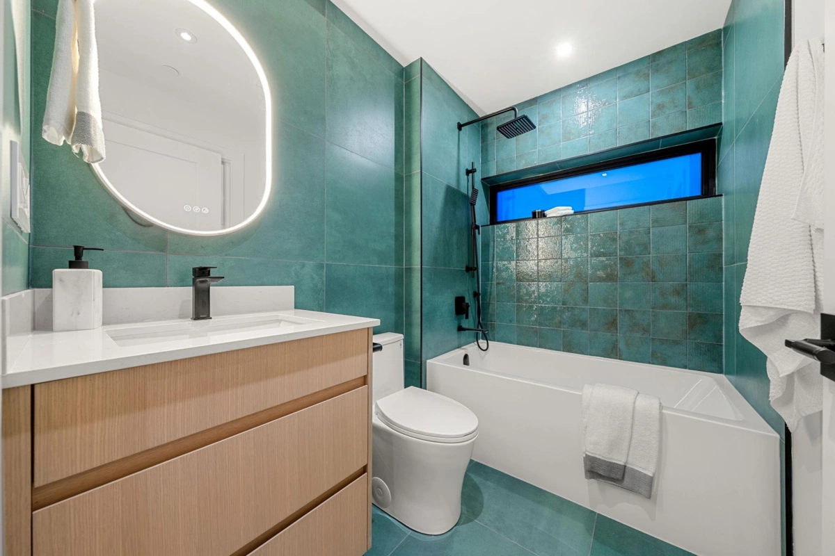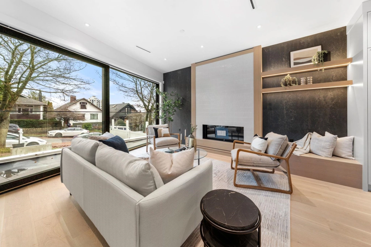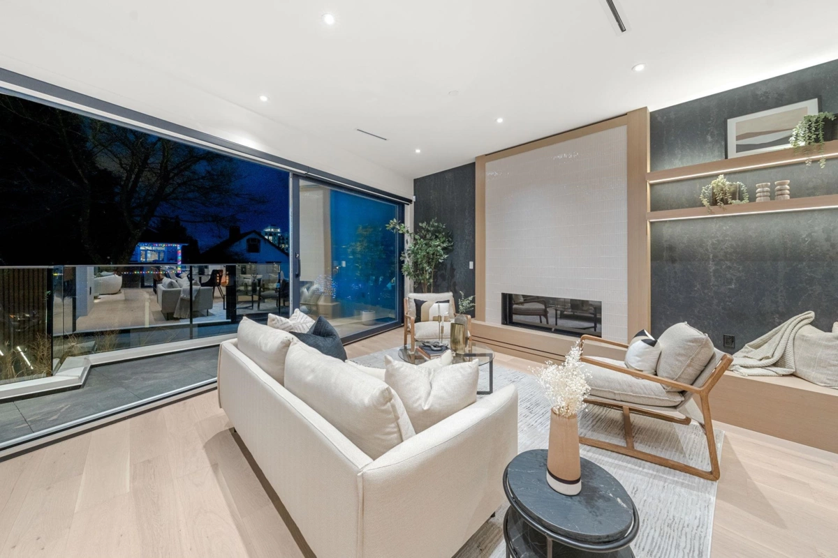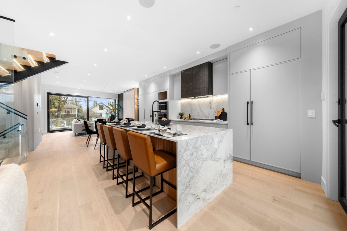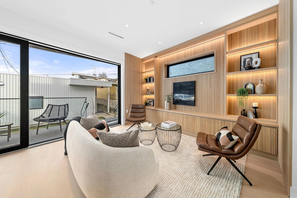 Welcome to the home where your search truly ends. This architectural masterpiece in Hastings Sunrise blends modern luxury, refined craftsmanship, and solar energy efficiency. Designed by Architrix Design Studio and built by award-winning Lat49 Builders, it showcases exceptional quality throughout. The main level features open-concept living with Crestron smart automation, Wolf appliances, custom cabinetry, a gas fireplace, and Dekton countertops. Upstairs offers three bedrooms with ensuites, including a serene primary suite with North Shore views. Enjoy a 360° rooftop deck, plus a lower-level rec room, wet bar, and home gym. A 669 sq.ft. 2-bedroom laneway home and a 1-bedroom legal suite provide ideal flexibility for family or added income. Easy access to SFU, Downtown, HYW 1.