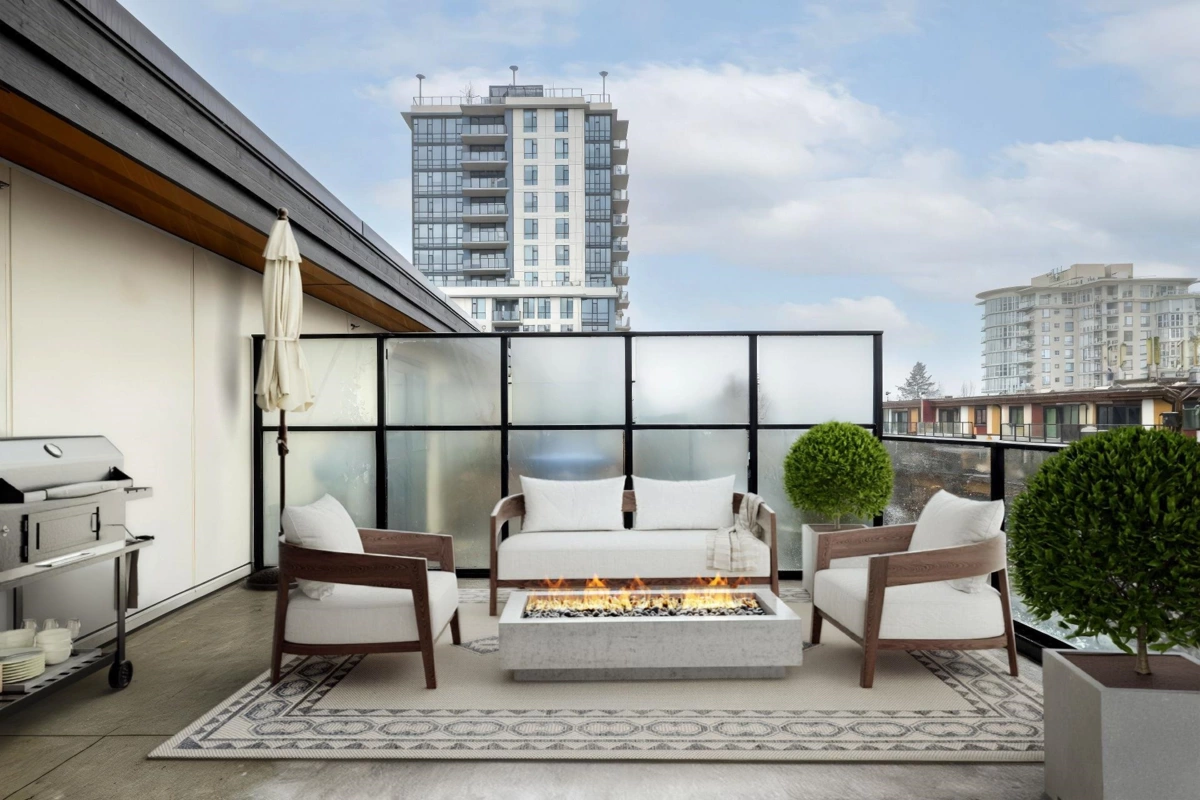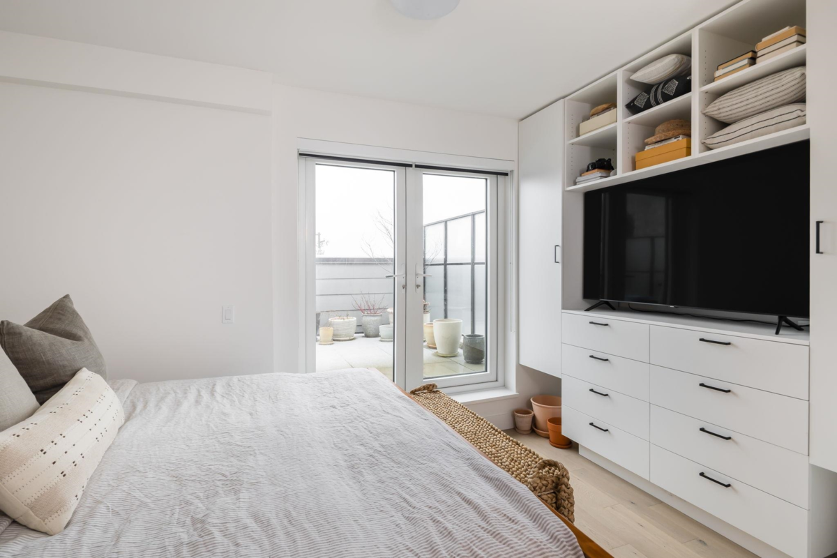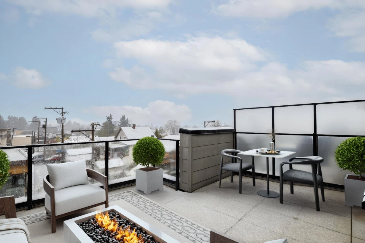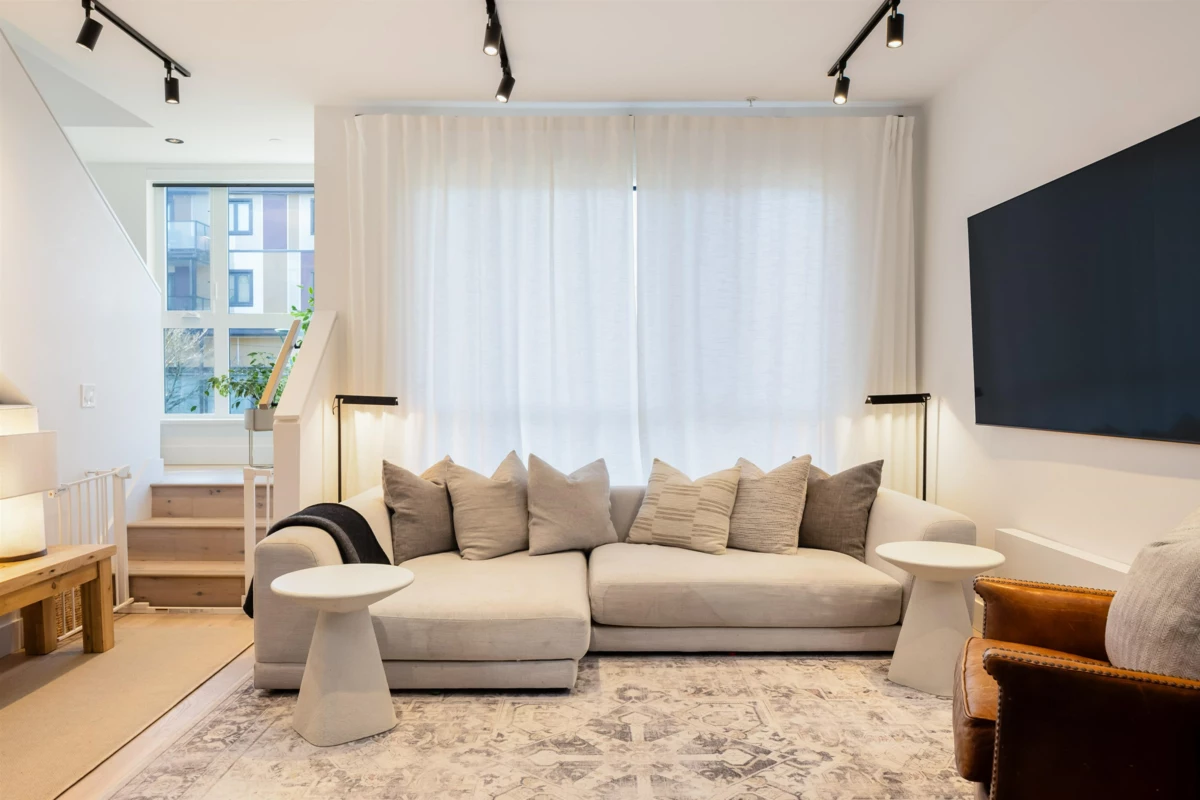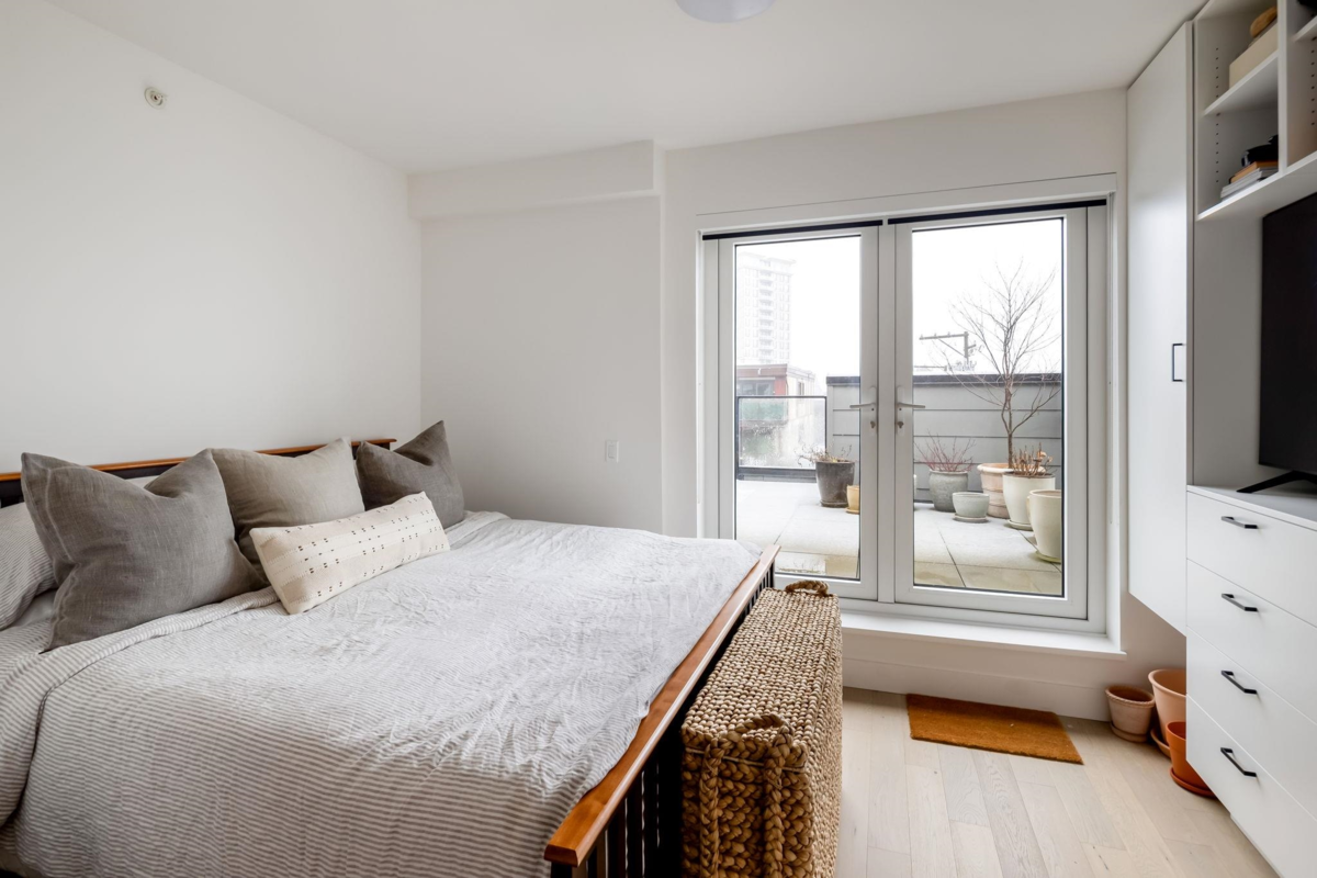 This exceptional 3 bed, 2.5 bath TH at 'Format' by Cressey offers 1,451 sq. ft. of contemporary living space w/ a stunning rooftop terrace overlooking beautiful City & Mountain VIEWS! Ideal for entertaining, features include brushed white oak flooring, bespoke matte black kitchen millwork, integrated Fulgor Milano appliances, A/C and radiant heated bathroom flooring. One of the most prime situated townhomes in the strata, West facing with natural light day to night & evening sunsets! Detached from the 16 story tower w/ street level access, this home offers privacy & quiet. Oversized windows overlook a quaint, tree-lined street w/ ample additional street parking. Premium amenities incl: fitness centre, workshop, co-working spaces & incredible rooftop terrace w/ 360 views, BBQs + playground.