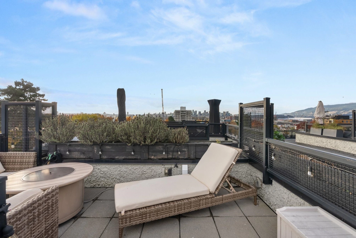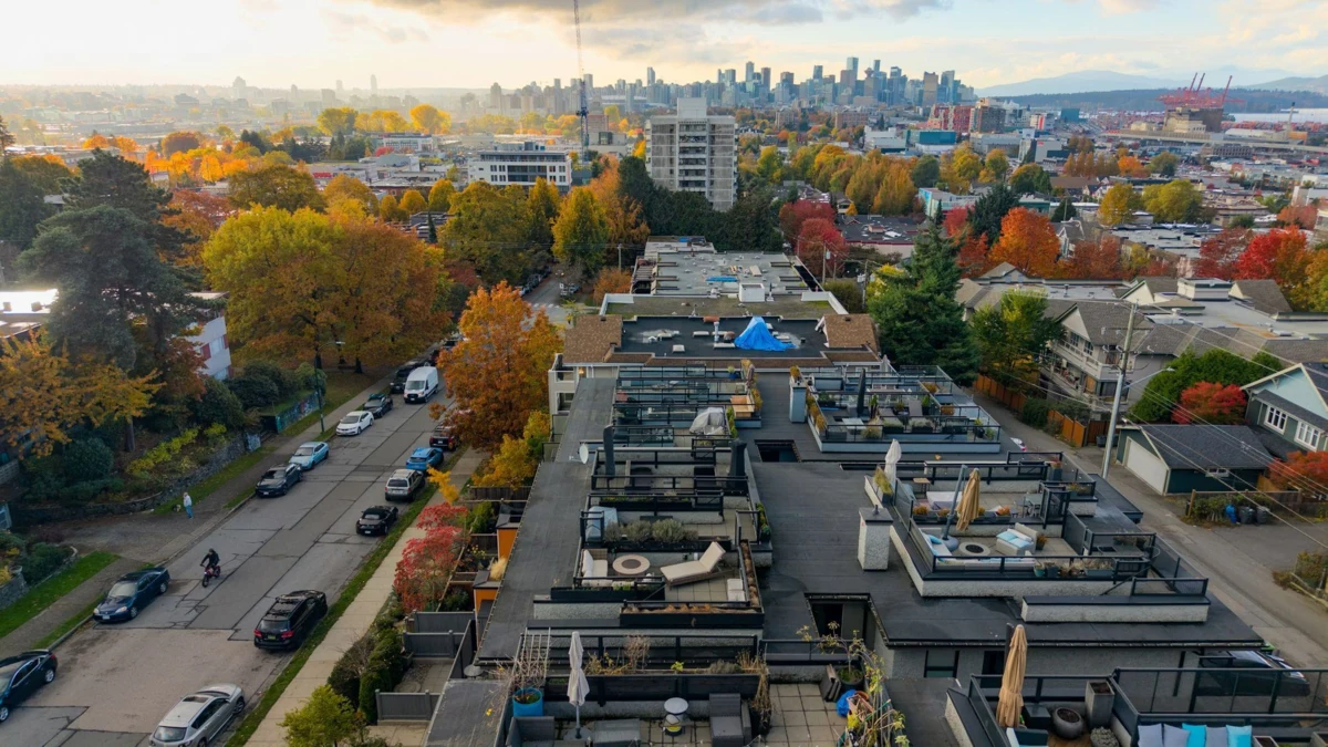 Enjoy breathtaking CITY VIEWS from the show-stopping ROOFTOP PATIO of this spacious 2 Bed (potential 3) + Den END UNIT in a boutique community just off The Drive. Step into a sun-filled living room with walk-out to a beautiful South-facing terrace. The stylish kitchen features S/S appliances, gas range & island, perfect for everyday living and entertaining. A versatile lower level offers a cozy media space or guest area with full bath and ample storage. The second level provides great separation with a bright den/office and generous bedroom with full bath. Retreat to the top-floor Primary Suite with ensuite and private patio. And the crown jewel—an incredible 360° rooftop deck with sweeping mountain & city views. 1 parking + bike lkr. Close to Bosa Foods, Cafes. EV CHARGERS & PARKING AVAIL