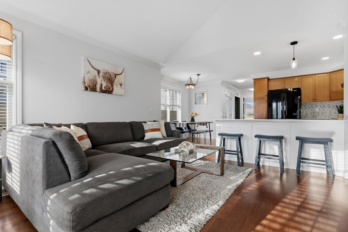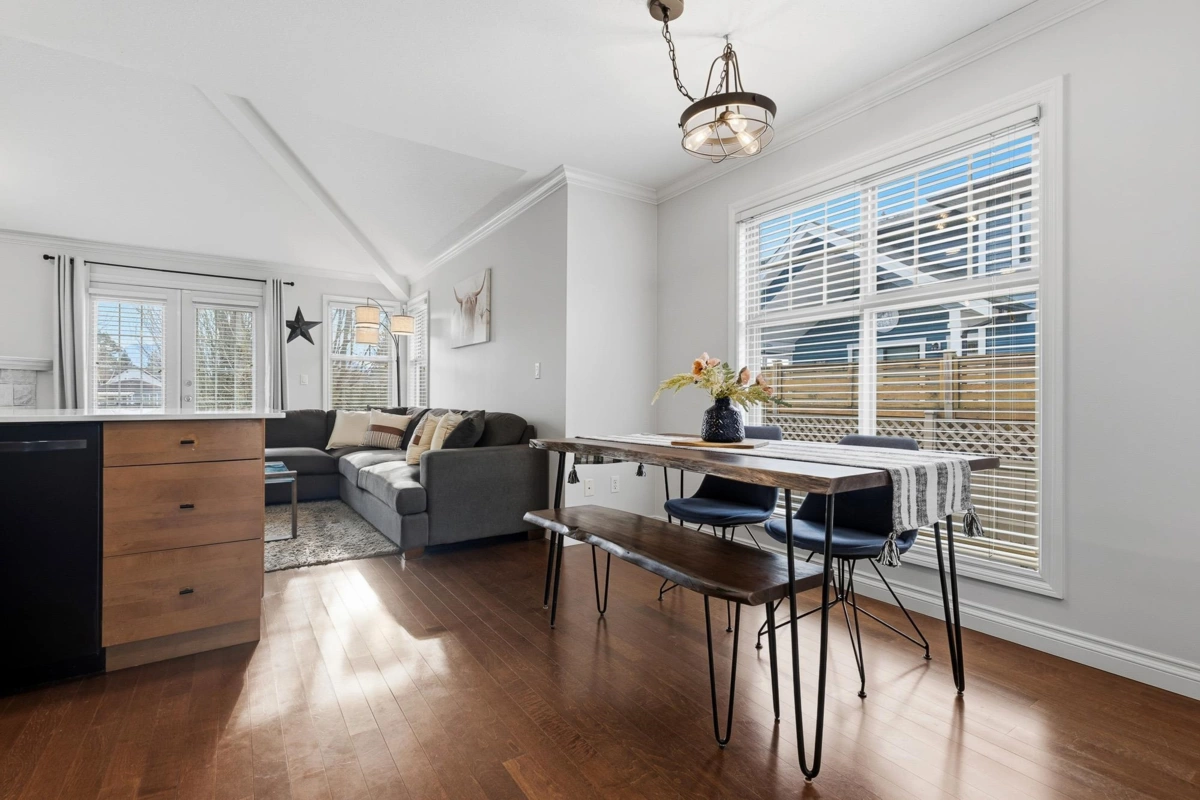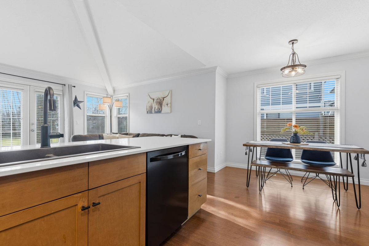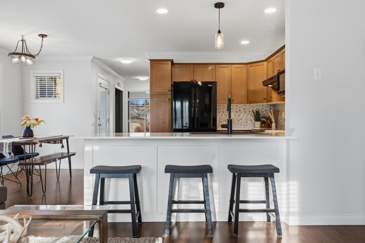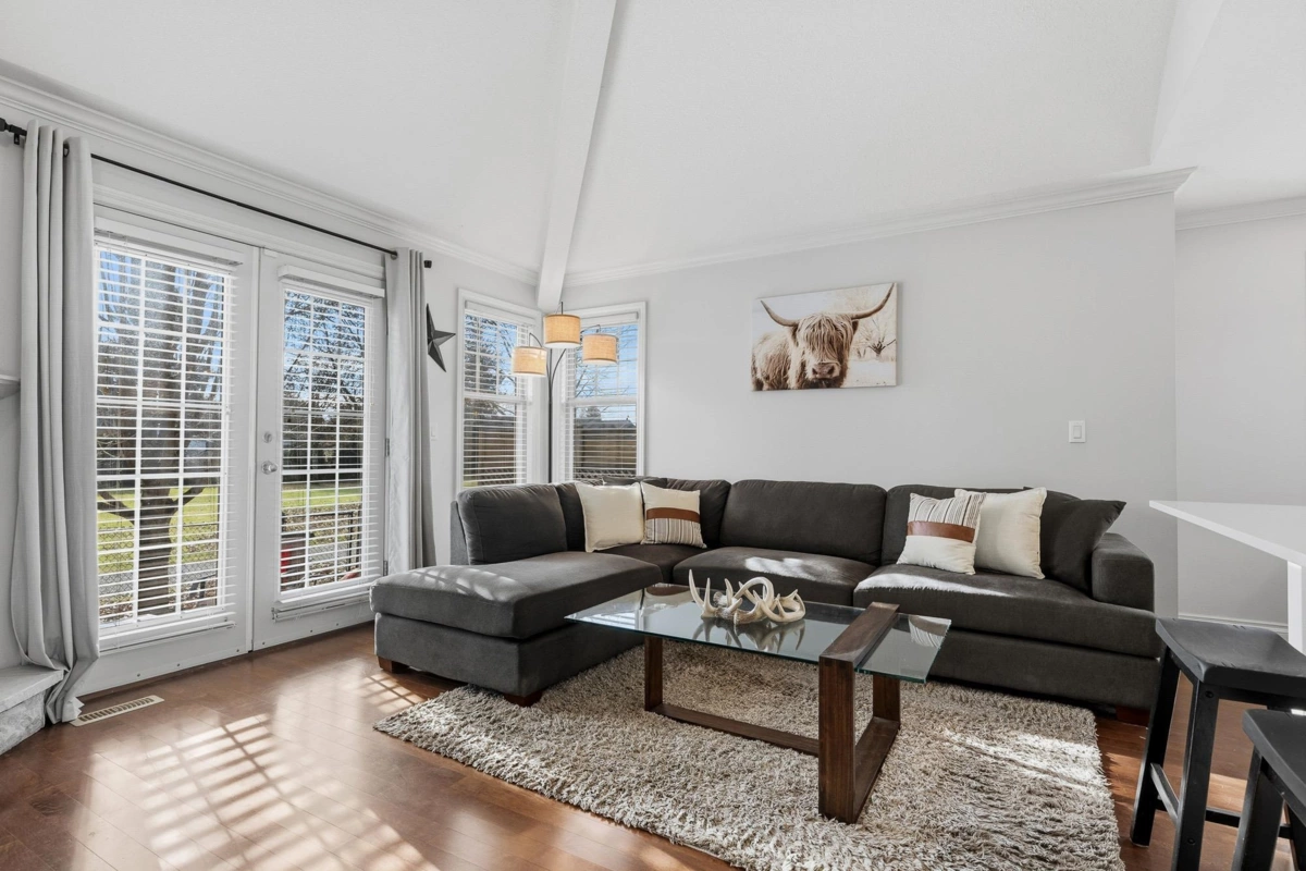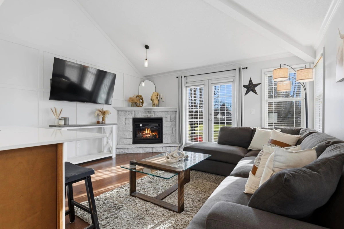 UPDATED MASTER ON MAIN END UNIT townhome backing onto BONNY PARK on QUIET Riverside Drive! All living on ONE LEVEL with an updated KITCHEN (new Quartz C/Tops, Backsplash & Fixtures!), Hardwood floors, Modernized N/G Fireplace all with Sunny SOUTHERN exposure bringing in NATURAL LIGHT! Main floor Primary bedroom featuring a spacious walk in closet + 4 piece ensuite, supported by a second bedroom or Den option for a home office or visitors. Upstairs has a large loft/living area with another 2 beds & FULL bathroom. Recent updates include CUSTOM wainscotting + NEW AC Unit! Great parking available with large Double garage, full length driveway & abundance of visitor parking in this sleepy 9 unit complex. Low density neighbourhood, fantastic access back to District 1881, amenities + HWY 1!