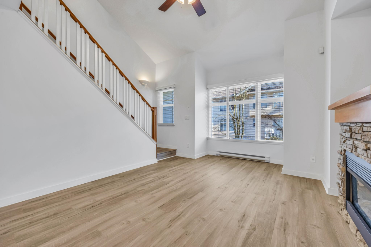 Welcome to The Denim in Willoughby Heights, this bright, stylish corner 2-bedroom offering year-round comfort with a high efficiency Mitsubishi heat pump & A/C throughout to keep you cool all summer and warm all winter. Enjoy extra privacy, less noise, windows on three sides, and vaulted ceilings in the living room and bedrooms. The larger yard features new vinyl fencing, quality synthetic turf, gardens, and built-in lighting perfect for kids, and pets. Inside boasts vinyl plank flooring, fresh décor paint, stainless steel appliances, and a modern kitchen with island. Unwind on the covered deck with remote-controlled sunshade. Well-managed strata with low fees, new roof, plus clubhouse, basketball court, playground, and ample visitor parking. Move-in ready. Call today!