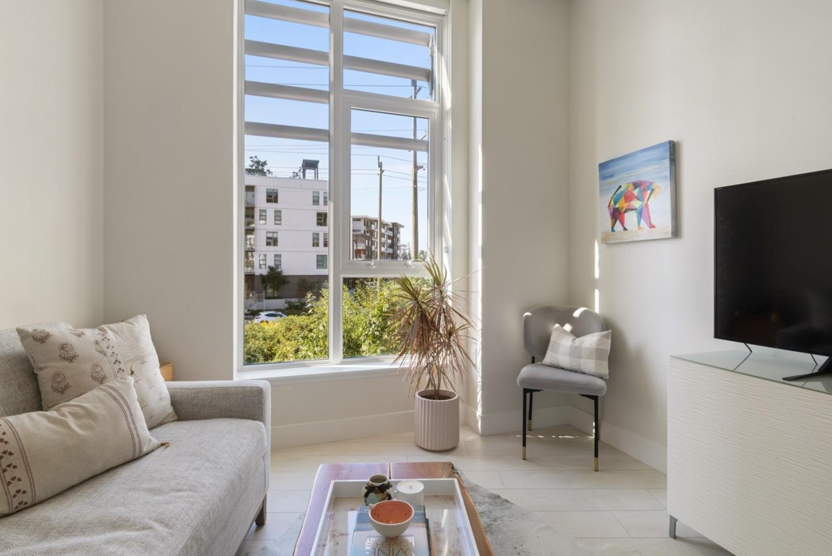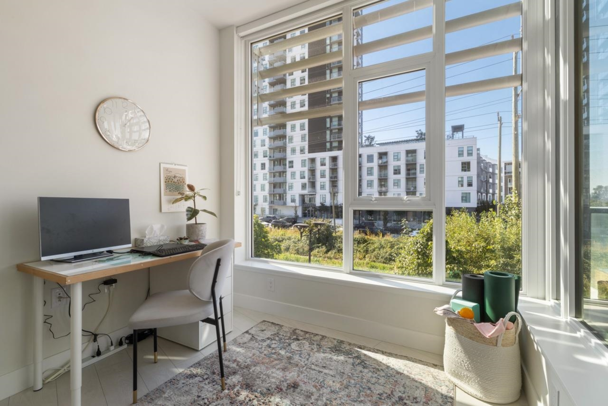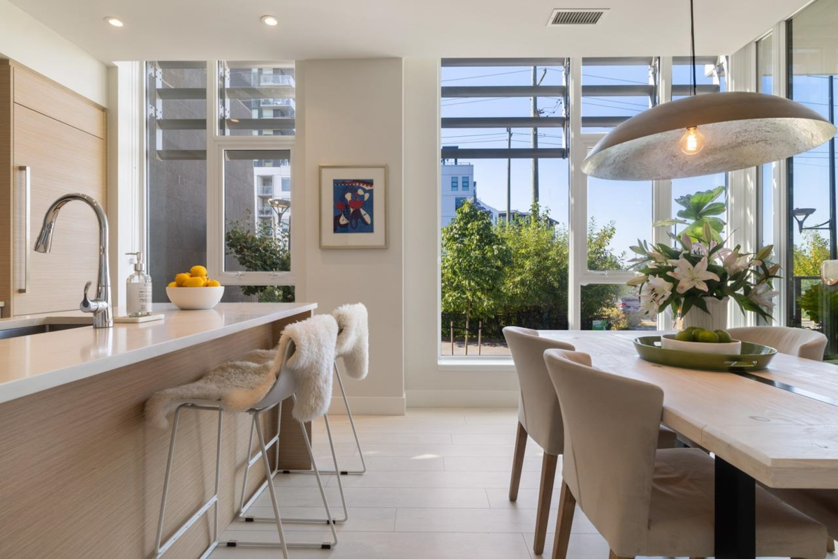 Best townhouse layout at MODE in the River District! Rare corner unit with 3 beds up, 3 baths, flex space, and 1,700+ sqft of smartly designed living. Bright and airy with oversized windows, two balconies, and great natural light. Upgrades include a custom wine bar w/ fridge and built-in coffee station. Gourmet kitchen features gas range, wall oven, integrated fridge/dishwasher, and quartz counters. South-facing with open layout, in-floor heating in primary ensuite, and high-efficiency heating/cooling system. Includes 2 parking and 1 storage. Enjoy resort-style amenities: hot tub, gym, concierge, theater, guest suites, dog wash, co-working hub & more. Steps to Save-On, Starbucks, restaurants, banks, wine shops, riverfront trails & more!