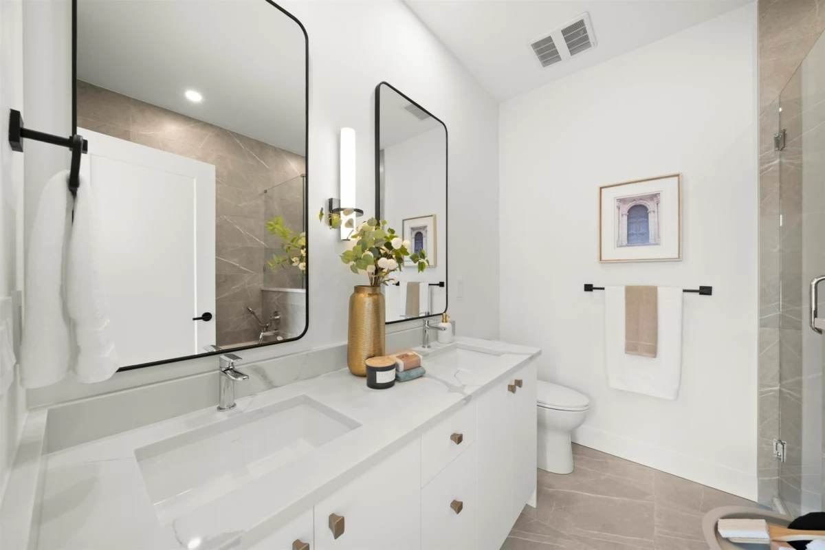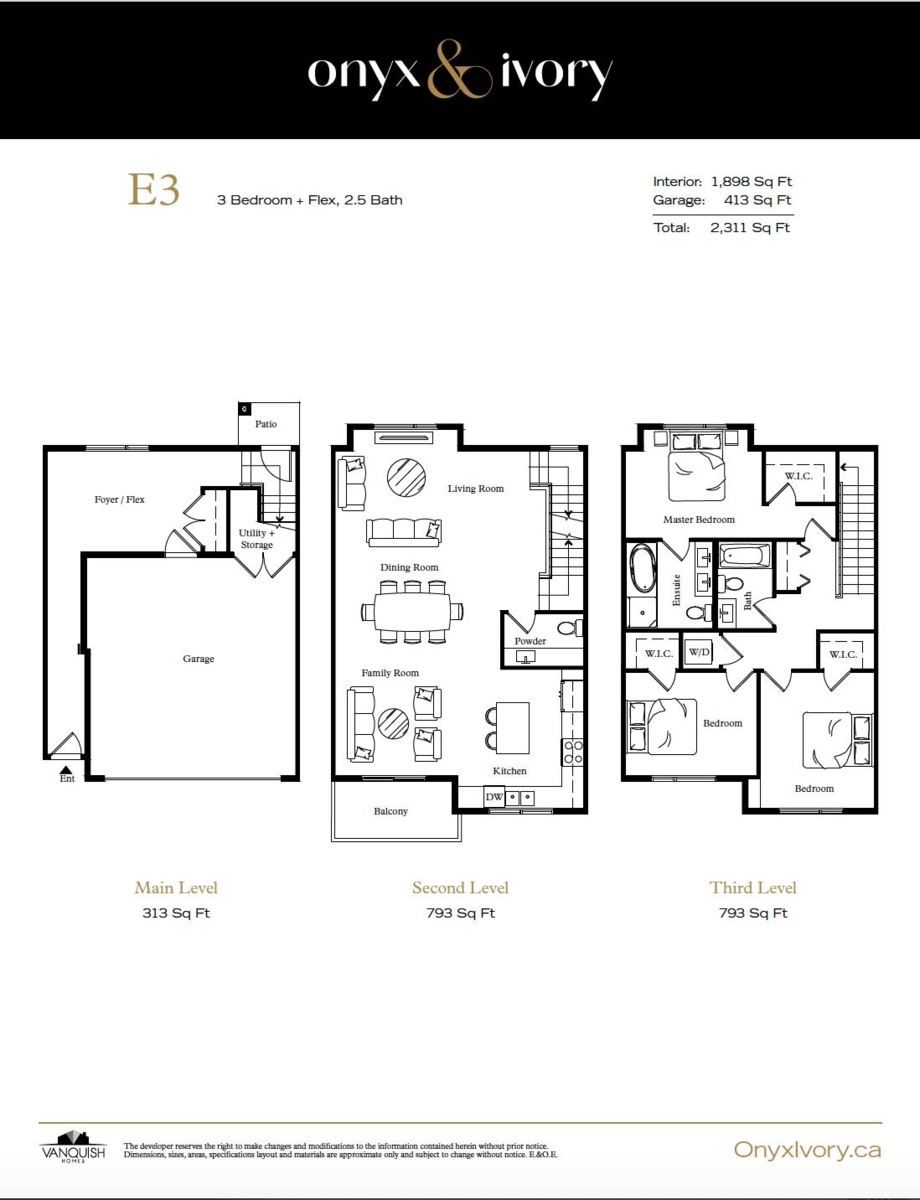 Spacious 3 bed + flex townhouse w/ all of the bells & whistles of a detached home! Dbl garage, low strata fees. Onyx & Ivory: Set in a prestigious neighbourhood, surrounded by greenery. High-end finishes incl: European appliances, gas stove, large island w/ waterfall, quartz counters/backsplash, LED pot lights, designer light fixtures & e-poxy in garage. Flex/office/rec room on lower level + a fenced yard. Open kitchen/living/dining & powder room on main level w/ balcony & bbq gas outlet. Primary bedrm w/ WIC & ensuite w/ duel vanities. 2 more good sized bedrms + bath & laundry upstairs. Wide-plank laminate up & down, forced air, central A/C, & millwork incl. MOVE IN READY - 5% deposit only! Photos are of E2 Plan but the same colour scheme. SHOW HOME OPEN DAILY 12-5 (except Fridays).