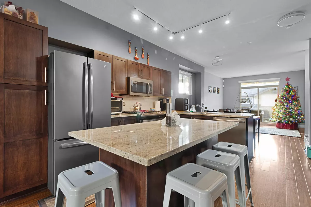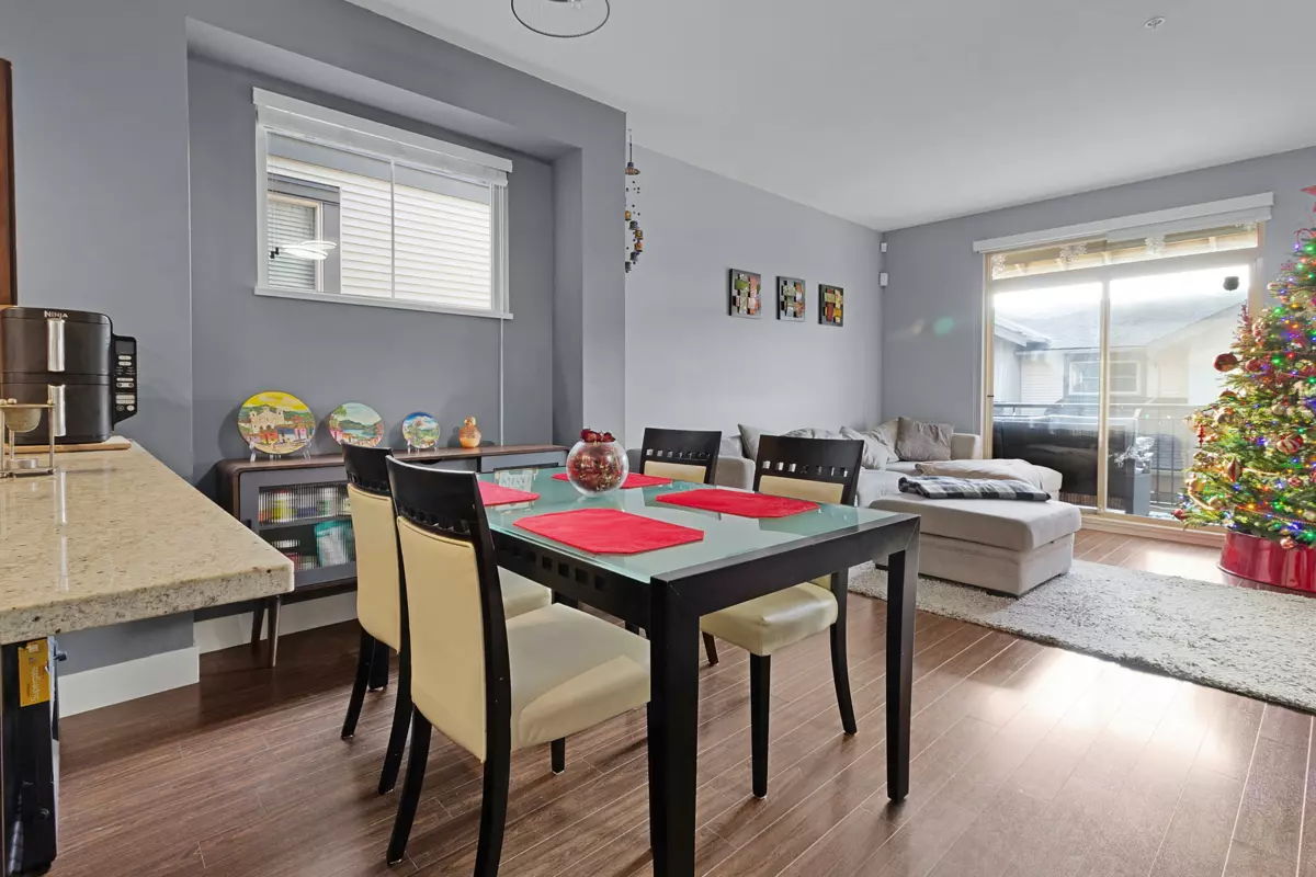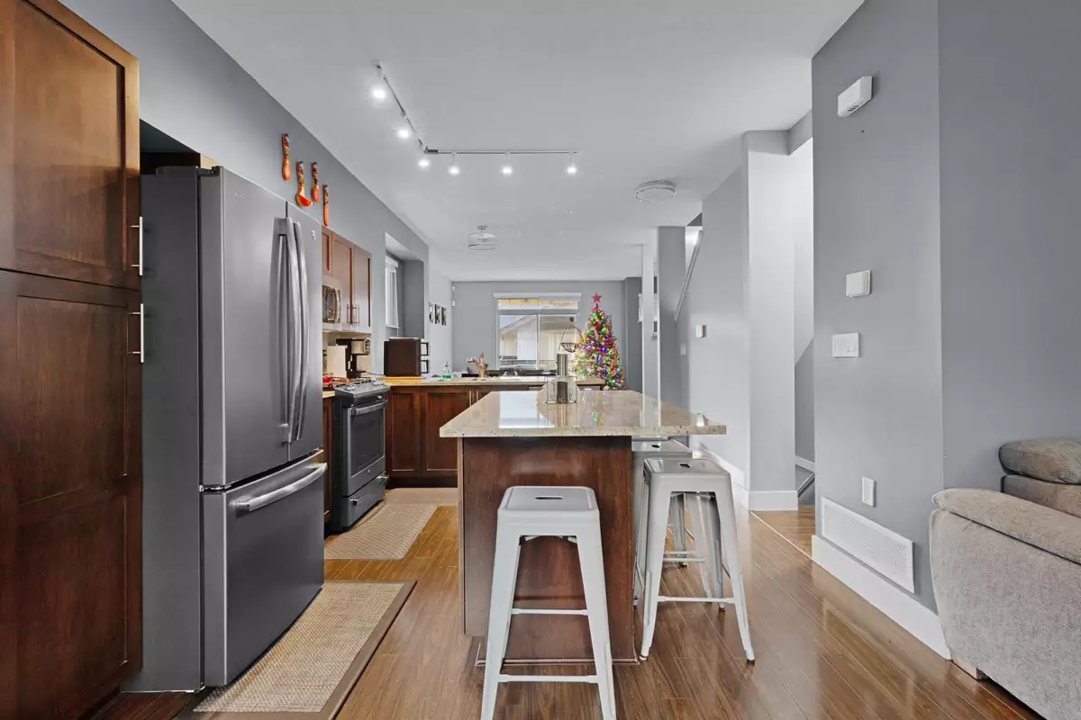 Beautifully maintained 3-bed townhome in the sought-after Sunpointe community of Willoughby Heights! Inside, enjoy a bright, functional layout with a spacious living area and a gourmet kitchen featuring SS appliances and a kitchen island. The bedrooms are well-sized, offering comfort and versatility for families. The patio off the living room was previously updated with epoxy. Updates include fresh paint touch-ups, new closet doors, enhanced lighting, new blinds, and laminate flooring on both staircases and the upper hallway, replacing carpet. The complex features a large children's play area and proximity to walking trail alongside the community. Minutes to shops, schools, recreation, and transit--an ideal central and highly convenient location within Langley!