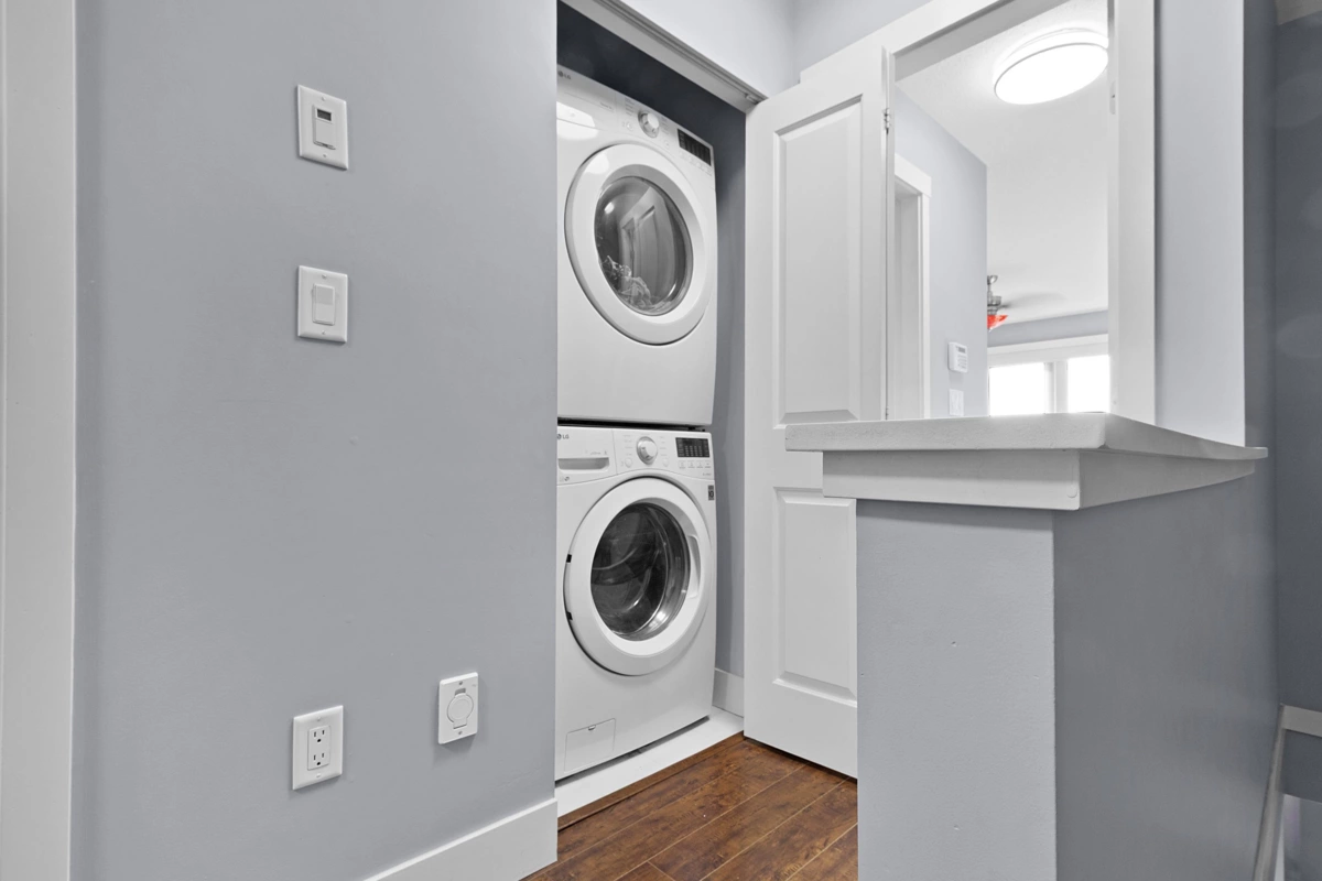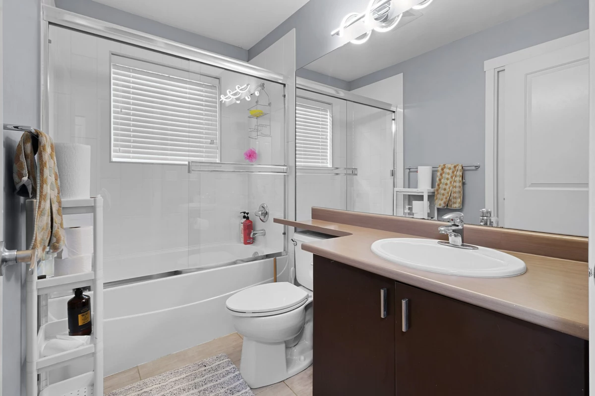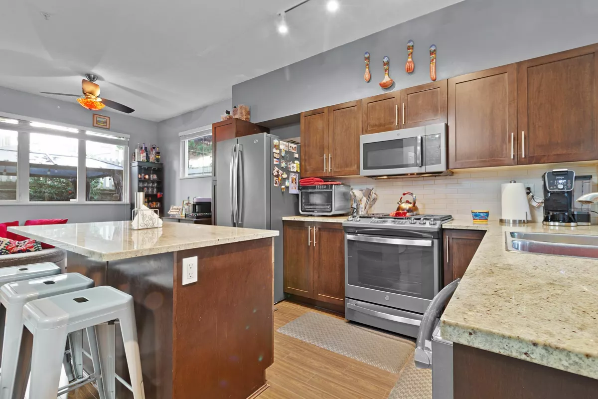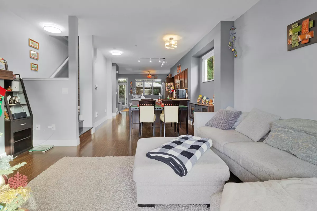 Beautifully maintained 3-bed townhome in the sought-after Sunpointe community of Willoughby Heights! Inside, enjoy a bright, functional layout with a spacious living area and a gourmet kitchen featuring SS appliances and a kitchen island. The bedrooms are well-sized, offering comfort and versatility for families. The patio off the living room was previously updated with epoxy. Updates include fresh paint touch-ups, new closet doors, enhanced lighting, new blinds, and laminate flooring on both staircases and the upper hallway, replacing carpet. The complex features a large children's play area and proximity to walking trail alongside the community. Minutes to shops, schools, recreation, and transit--an ideal central and highly convenient location within Langley!