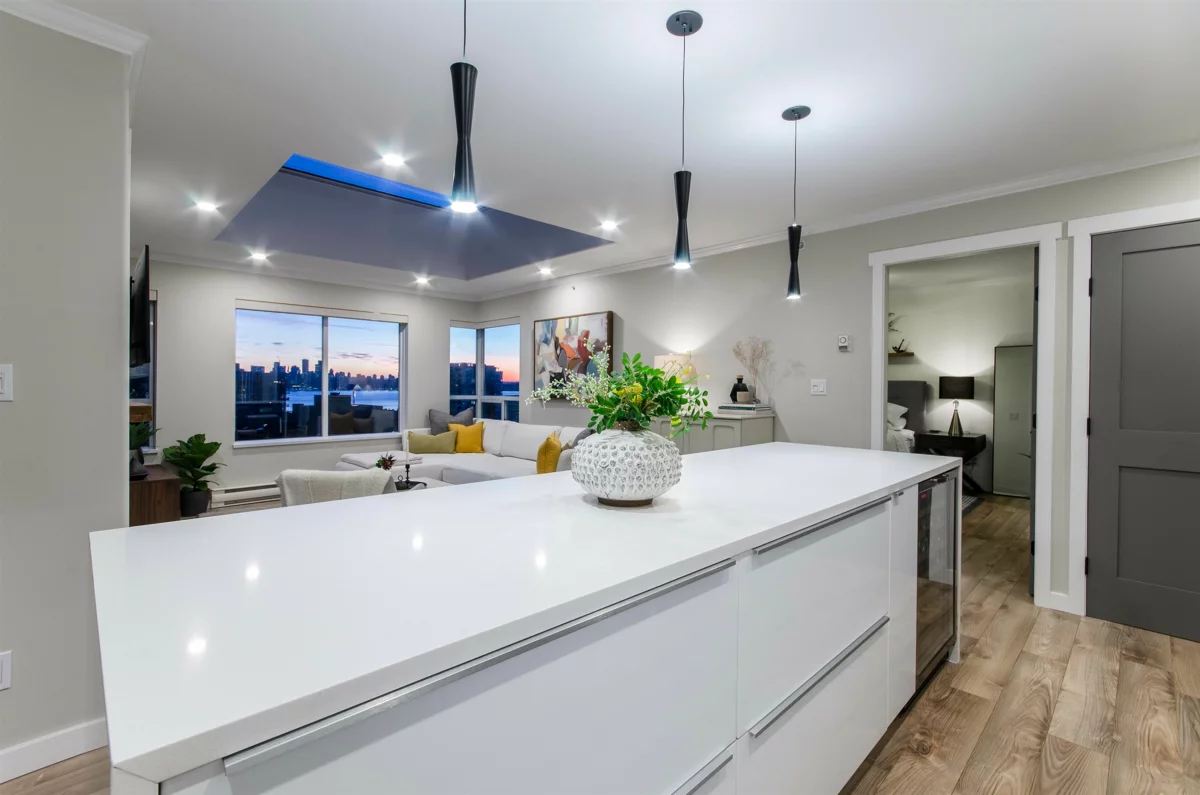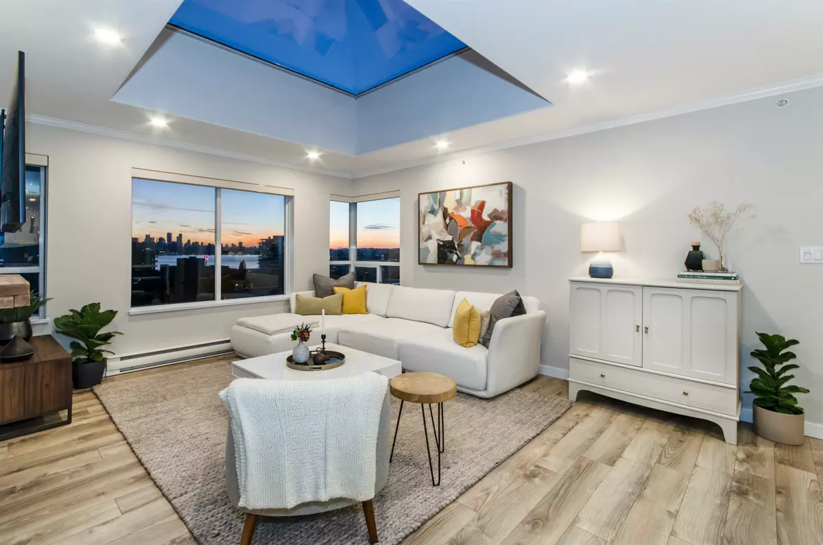 UNIQUE & STYLISH 2 bed, 2 bath PENTHOUSE in The Best Little Boutique Building in vibrant Lower Lonsdale. Carmel Place is comprised of 11 beautifully renovated condos. Views, sunlight & stunning redesign w the perfect blend of beauty and functionality. Quartz counters, pendant lighting, island w seating for 4. Luxurious bathrooms w rain showers, heated flrs, floating vanities, skylight. Windows everywhere as well as 3 skylights fill this home w fab sunlight along w the enjoyment of water views, sunsets & twinkling city lights. Perfect floor plan w inviting open concept living space & bedrooms nicely separated. New appliances, lovely gas F/P, two decks, pet friendly, on quiet side of Lonsdale. Steps to bars, eateries, seabus terminal, yoga, spin, Lonsdale Quay & more. THIS ONE IS SPECIAL!!