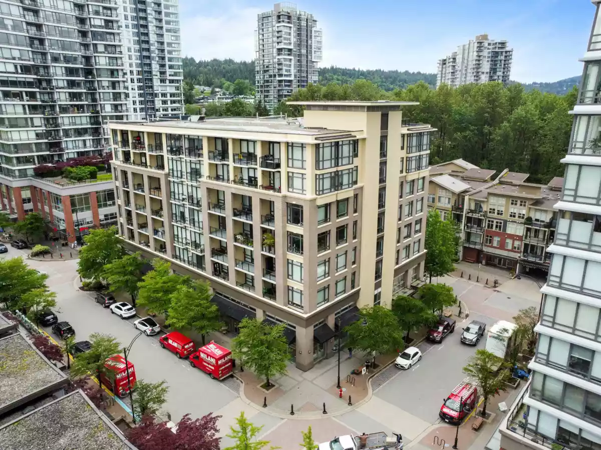 Discover the quintessential Port Moody lifestyle w/ this 730 SQ FT CONCRETE CORNER UNIT in sought after Suter Brook just steps away from shopping, restaurants, Inlet Centre Skytrain, and all Port Moody has to offer. As you enter, you'll be greeted by a bright and spacious living area that is seamlessly blended with an open-concept layout that boasts 10' CEILINGS w/ OVERSIZED ADDITIONAL WINDOWS. Featuring a gourmet kitchen, w/ stainless steel appliances, gas range and granite countertops. Retreat to the tranquil bedroom and enjoy direct access to your private balcony w/ floor to ceiling sliding glass doors. Embrace functionality w/ a generous walk-in closet and in-suite storage. Access to the renowned Aria Club. Schedule a viewing today and experience Port Moody living at its finest!