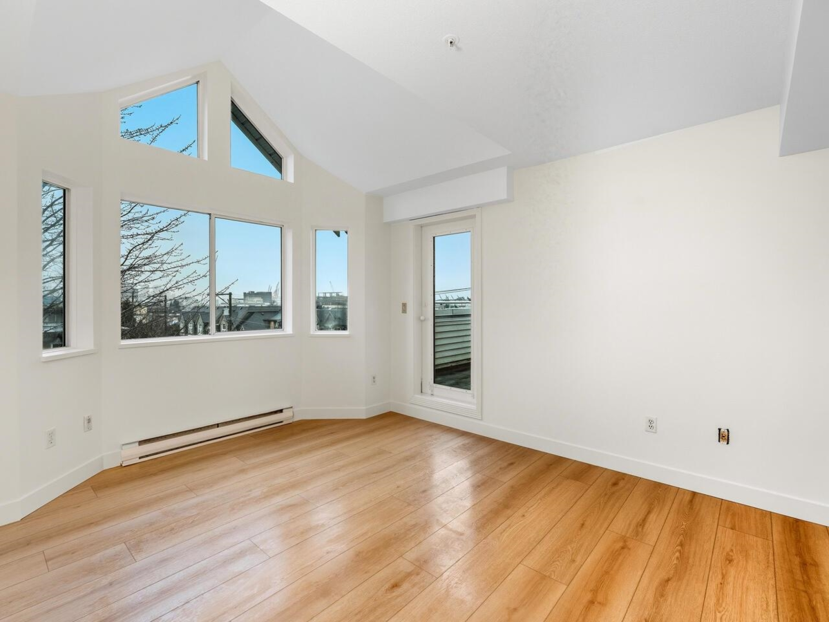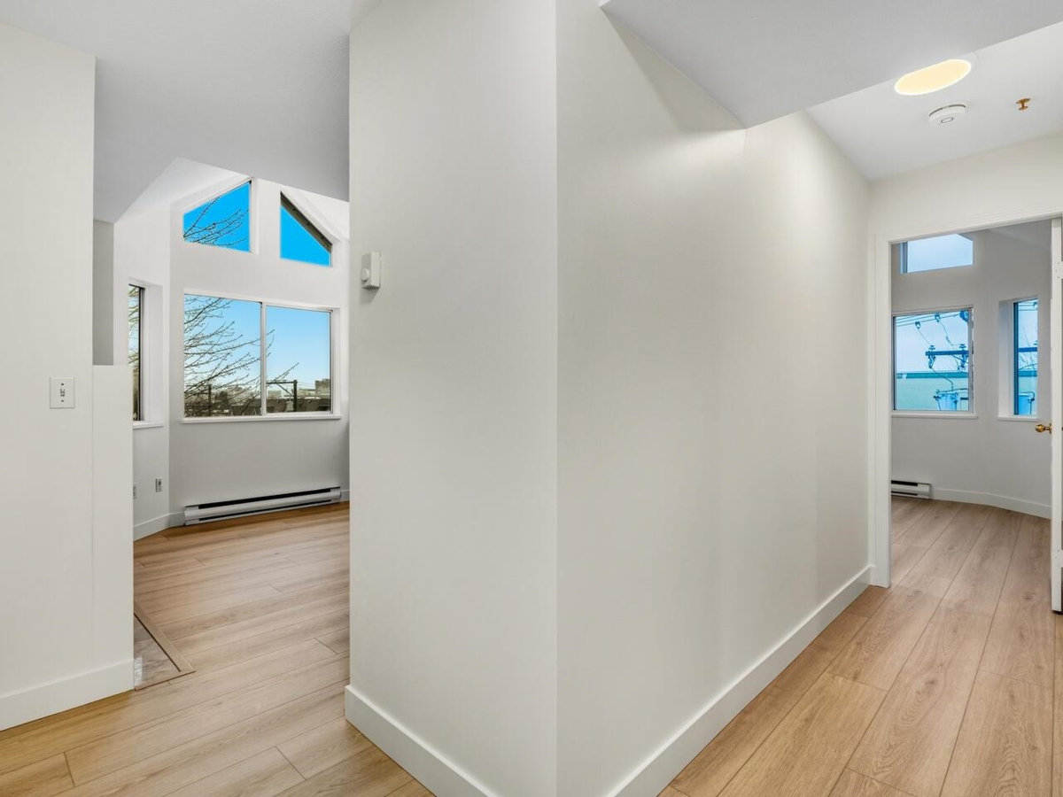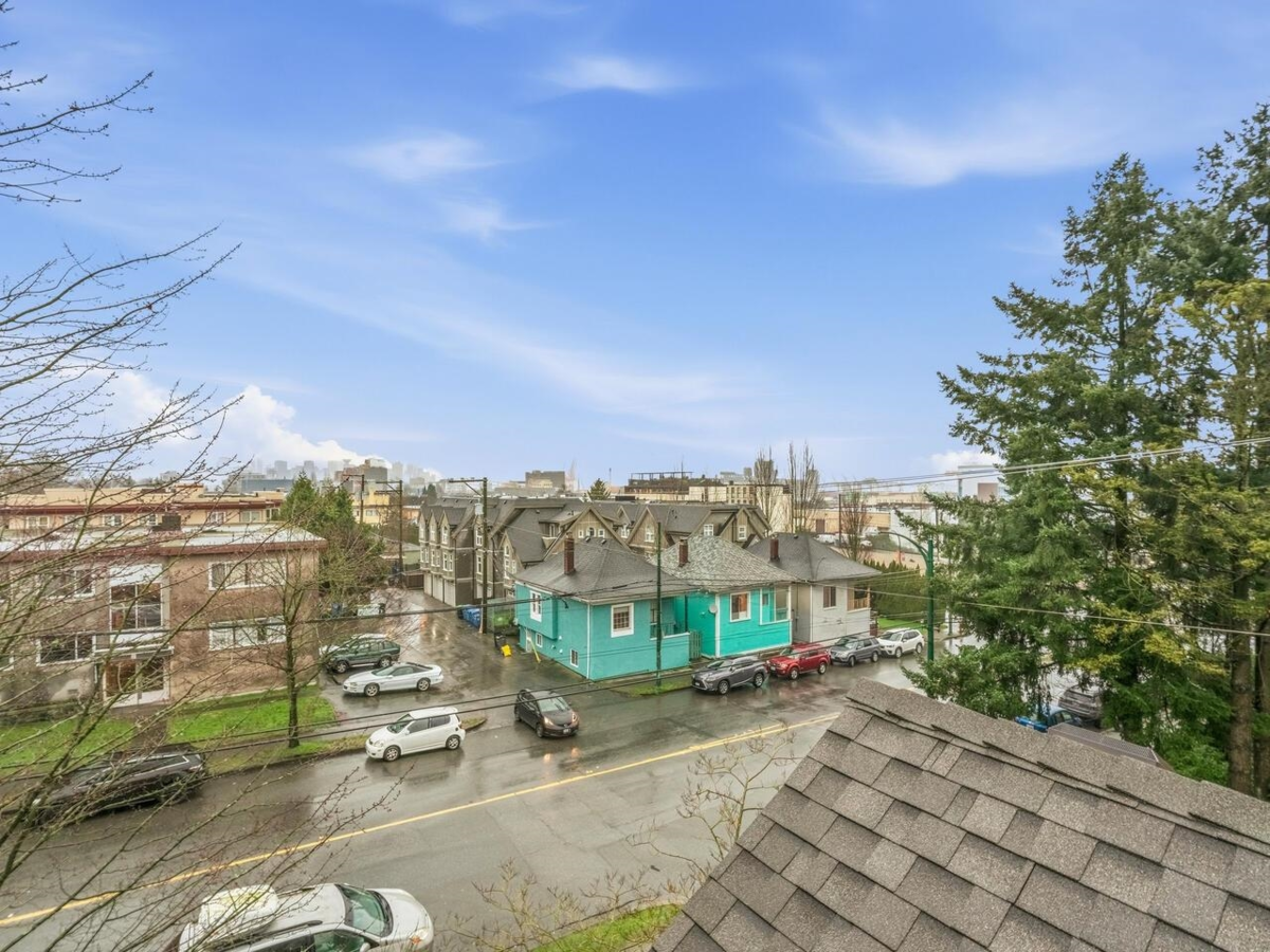 TOP FLOOR, CORNER SUITE WITH A CITY VIEW! This well laid out two bedroom condo is a rare find. With spacious patio, vaulted ceilings, brand new laminate and vinyl flooring throughout, new laundry pair, and fresh paint, it's move in ready, or add value with cosmetic kitchen and bathroom ideas. Very bright with loads of windows facing North and West, enjoy the view and great light all year long. The location is unbeatable - steps to Commercial Drive, The York, The Cultch and all that this desirable pocket of East Vancouver has to offer. Private end unit in a solid, well maintained building with a newer roof and proactive and friendly strata. One pet allowed up to 44 lbs, includes two parking stalls, gym, sauna, and amenity room. Open House Sunday January 25th from 12:30pm - 2:00pm.