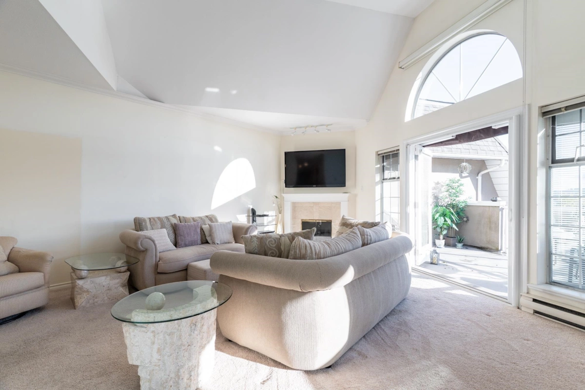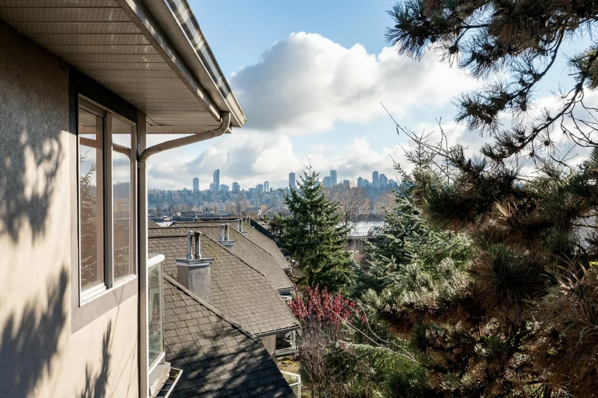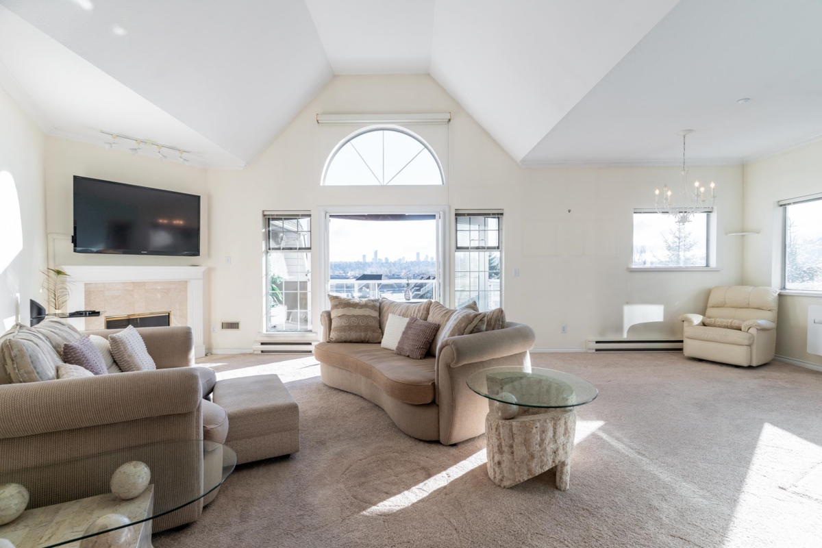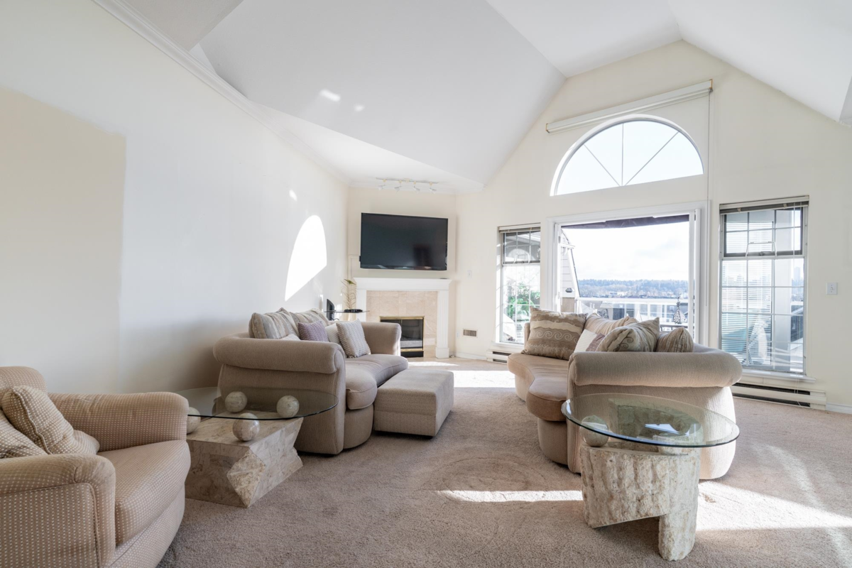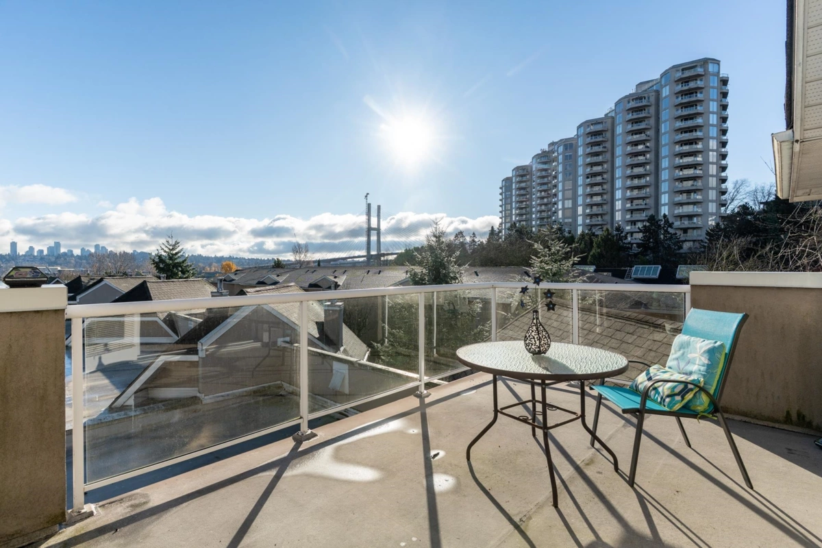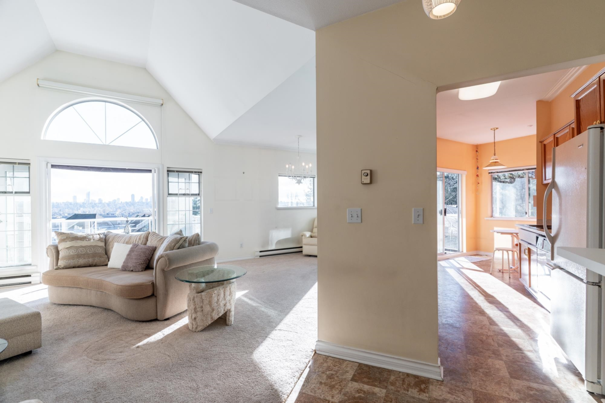 This is a truly unique find for your next home; a top floor, corner unit condo that is the gift that keeps on giving. All benefits, no compromises! Over 1,600 sq ft of grand living space offering a proper foyer to greet your guests, cozy living room to entertain, a dining area for your treasured holiday gatherings, eat-in kitchen, 3 large bdrms w/ vaulted ceilings, 2 full baths, plenty of closets & a storage locker. A/C unit in dining room. If you value views & vantage points; this is the home for you. Stunning & peaceful views to the South, West & North from the bright windows & 4 BALCONIES. Gaze out over the Fraser River towards bridges, waterway activity & impressive sunsets. Walk Score fantastic to SkyTrain, eateries, health amenities, parks & more.