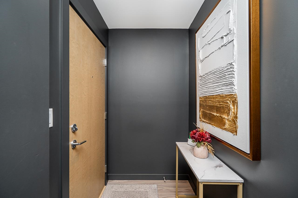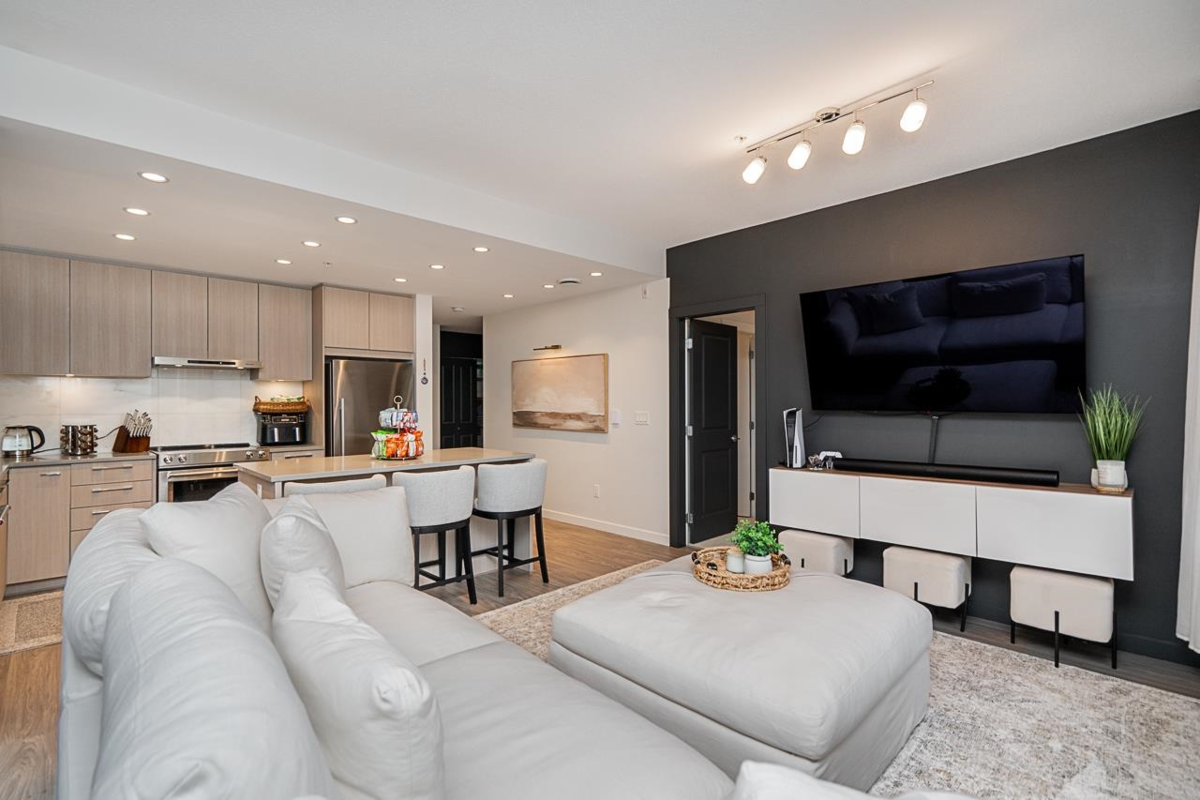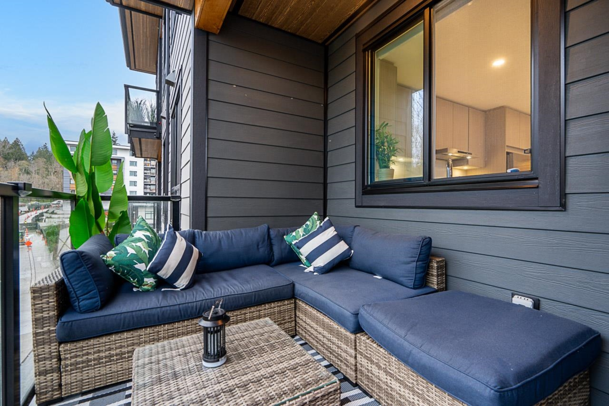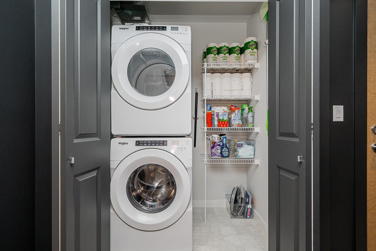 A bright corner-style home in Byrnepark w/panoramic windows & a treed, private outlook. A large kitchen island anchors the modern kitchen w/full-height cabinetry & stainless appliances. The living & dining area flows out to a covered balcony facing greenery, an easy spot for morning routines. The primary bed includes a redesigned closet, custom accent wall, built-in dresser, & a makeup area w/mirror & shelving, plus a spa-like ensuite w/a double vanity & clean stone finishes. The 2nd bedrm sits on the opposite side of the home for added separation. A tucked-away entry & laundry keep everyday clutter out of sight. Soft drapery, smart heat controls, window nets, & a balcony door net add comfort.