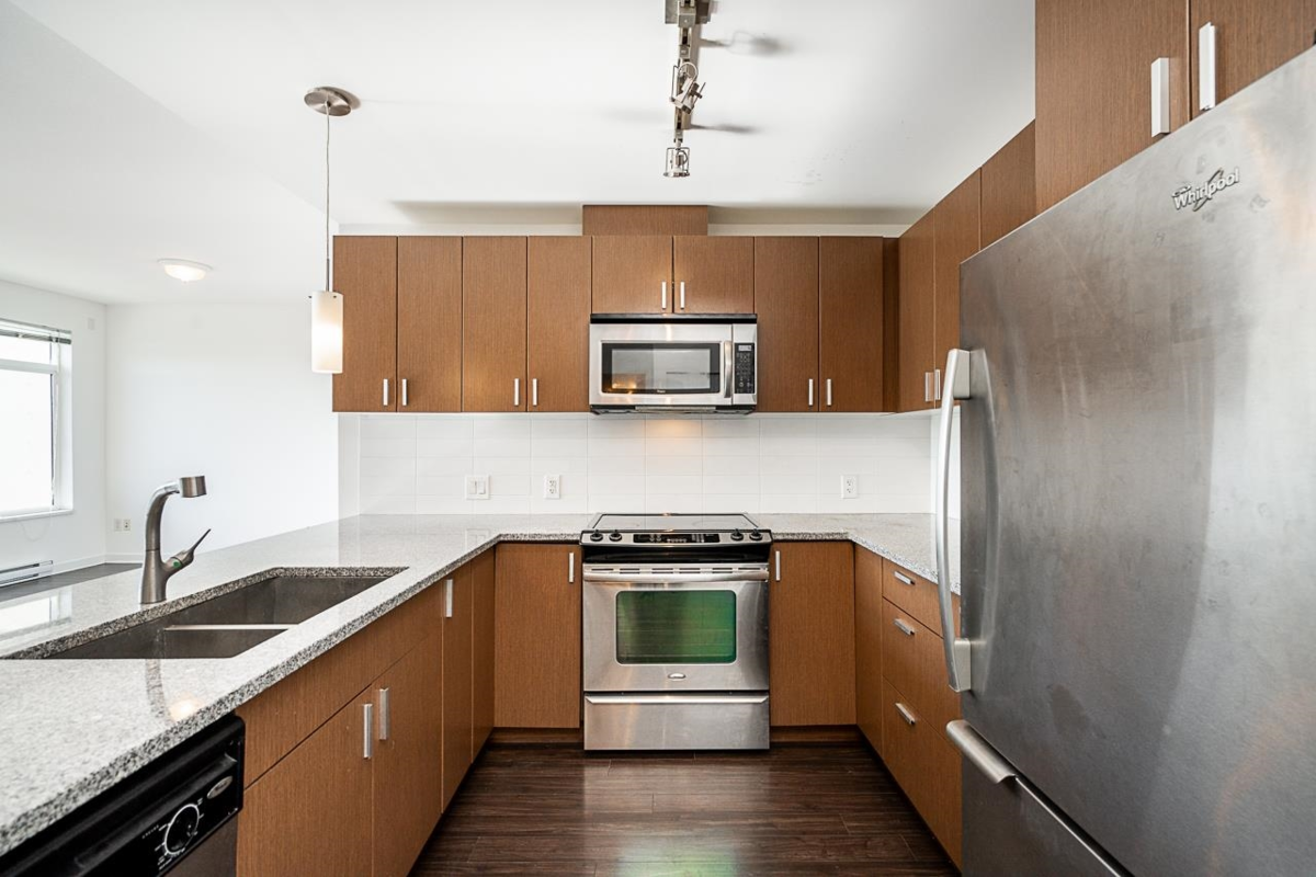 Enjoy unobstructed west-facing views and abundant natural light in this top-floor unit, thanks to its oversized windows and high ceilings. The living room features 9-foot ceilings, while the bedrooms showcase soaring 12-foot ceilings. Granite countertops s/s appliances in the kitchen and laminate flooring throughout. A standout feature is the stunning custom-built loft bed and dresser in the second bedroom. Spacious 19-foot deck where you can enjoy breathtaking sunsets. The condo is situated in a peaceful location within the building, away from Scott Rd, and conveniently close to the elevator. 2 side by side parking spaces and two lockers located in the secure underground garage. Amenities include a clubhouse, rooftop decks, and a well-equipped gym.