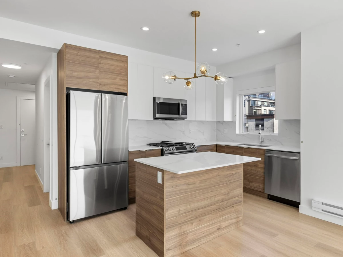 MOVE IN READY! This brand new south facing 904 SF 2 bedroom + Den & 2 bathroom home features an entertainers open concept kitchen with an island & window above the sink, S/S appliances, LED pot lighting throughout, gas stove, durable vinyl plank floors, 9ft ceilings, in-suite laundry, spacious balcony, and walk-through closet in your primary bedroom with a his and her ensuite bathroom. The BUILDING: Welcome to Estella - this beautifully designed building is situated in the thriving Port Coquitlam neighbourhood, walking distance to many shops, services, community centre, nature and more. BONUS INCENTIVES: AC/Heat Pump package to be included and 1 secured parking stall & 1 storage locker.