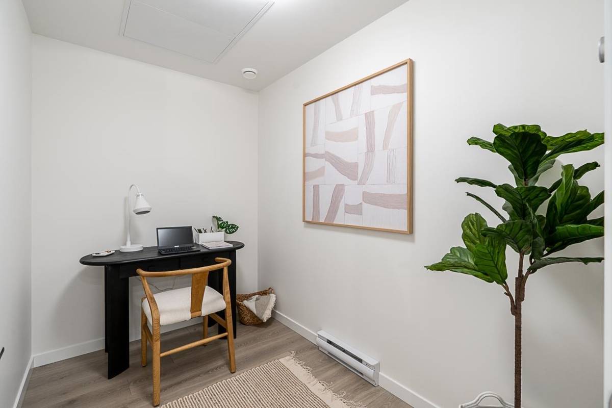 Brand new large move-in ready 1 bed +Den home at Hive 2, Northeast facing, built by award winner Apcon Group. Located in Willoughby Town Centre with restaurants, shopping & across teh street from the indoor Tennis Centre and Elementary school. Shared amenities + fitness center, party room, co-working space and outdoor BBQ and play area. Inspired living space built with igh quality materials and modern design touches. Wide plank laminate flooring, contemporary roller blinds filter natural light. Full size front stacking in-suite laundry, large functional kitchen with full size stainless steel fridge, gas range and dishwasher. Beautiful bathroom with stylish hardware and undermount sink. Full 2/5/10 year new home warranty. One parking and one starage locker included.
