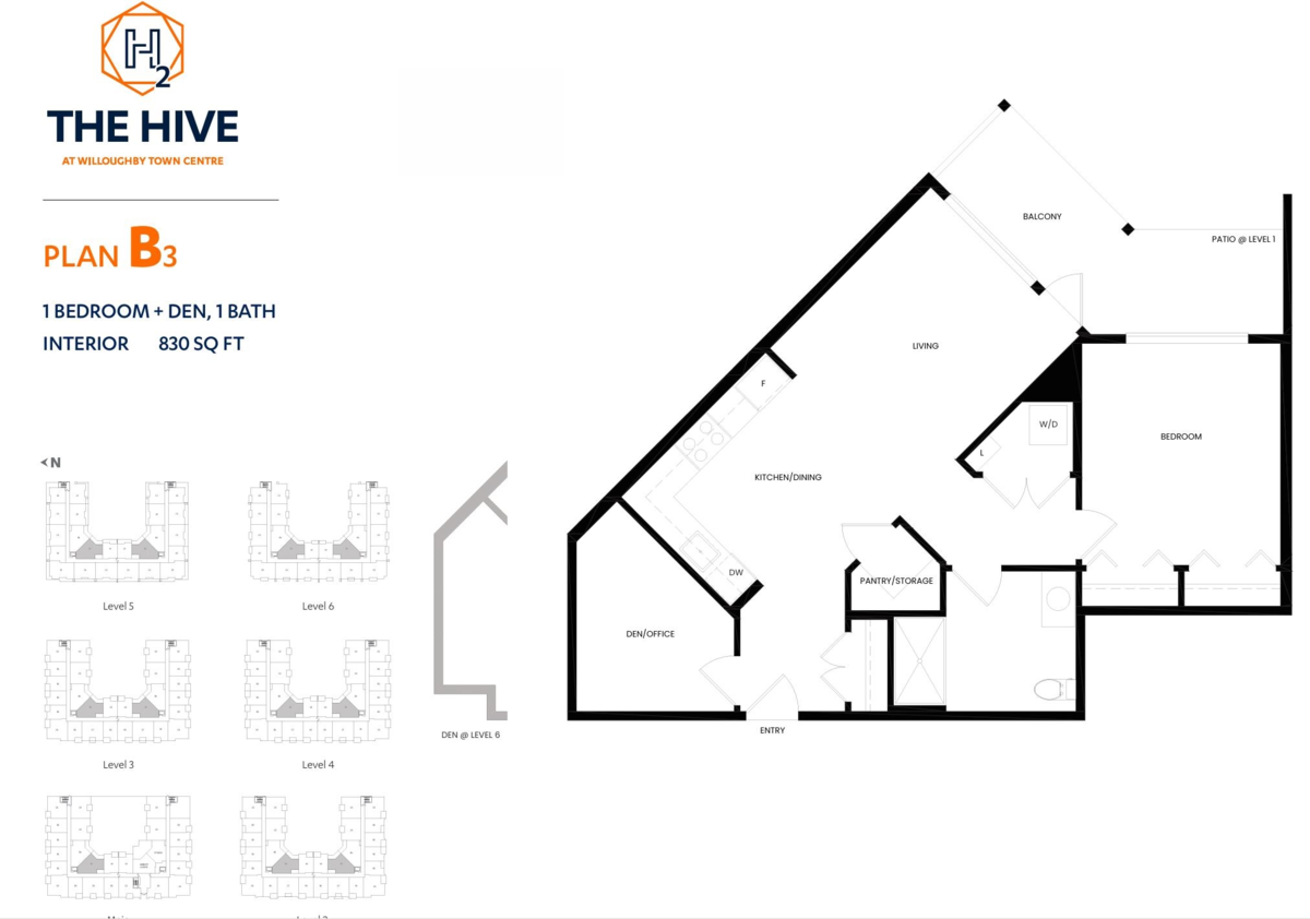 Brand new, large move-in ready 1 bed + den home at Hive 2, NE facing with courtyard view, built by award winner Apcon Group. Located in Willoughby Town Centre with restaurants, shopping & across the street from the indoor Tennis Centre & Elementary school. Amenities- fitness center, party room, co-working space, outdoor BBQ & play area. Inspired living space built with high quality materials & modern design touches. Wide plank laminate flooring, contemporary roller blinds, full size front stacking in-suite laundry, large functional kitchen with island, full size stainless steel fridge, gas range & dishwasher. Beautiful bathroom with stylish hardware & undermount sink. Full 2/5/10 year new home warranty. One parking & one starage locker included. Pets- no size or breed restrictions.