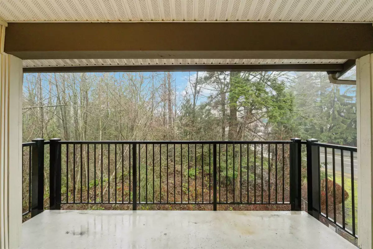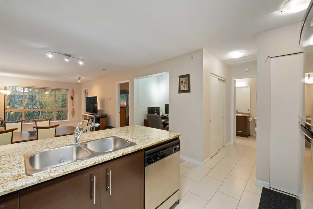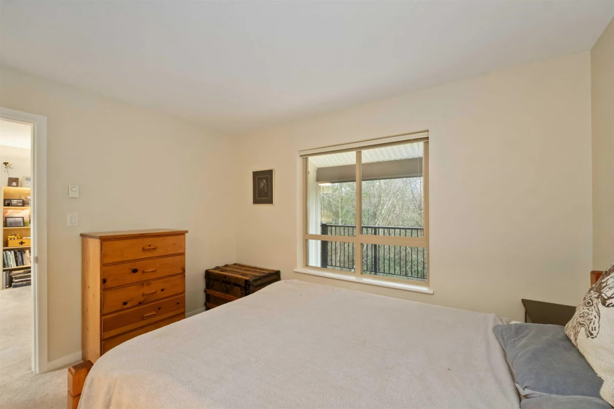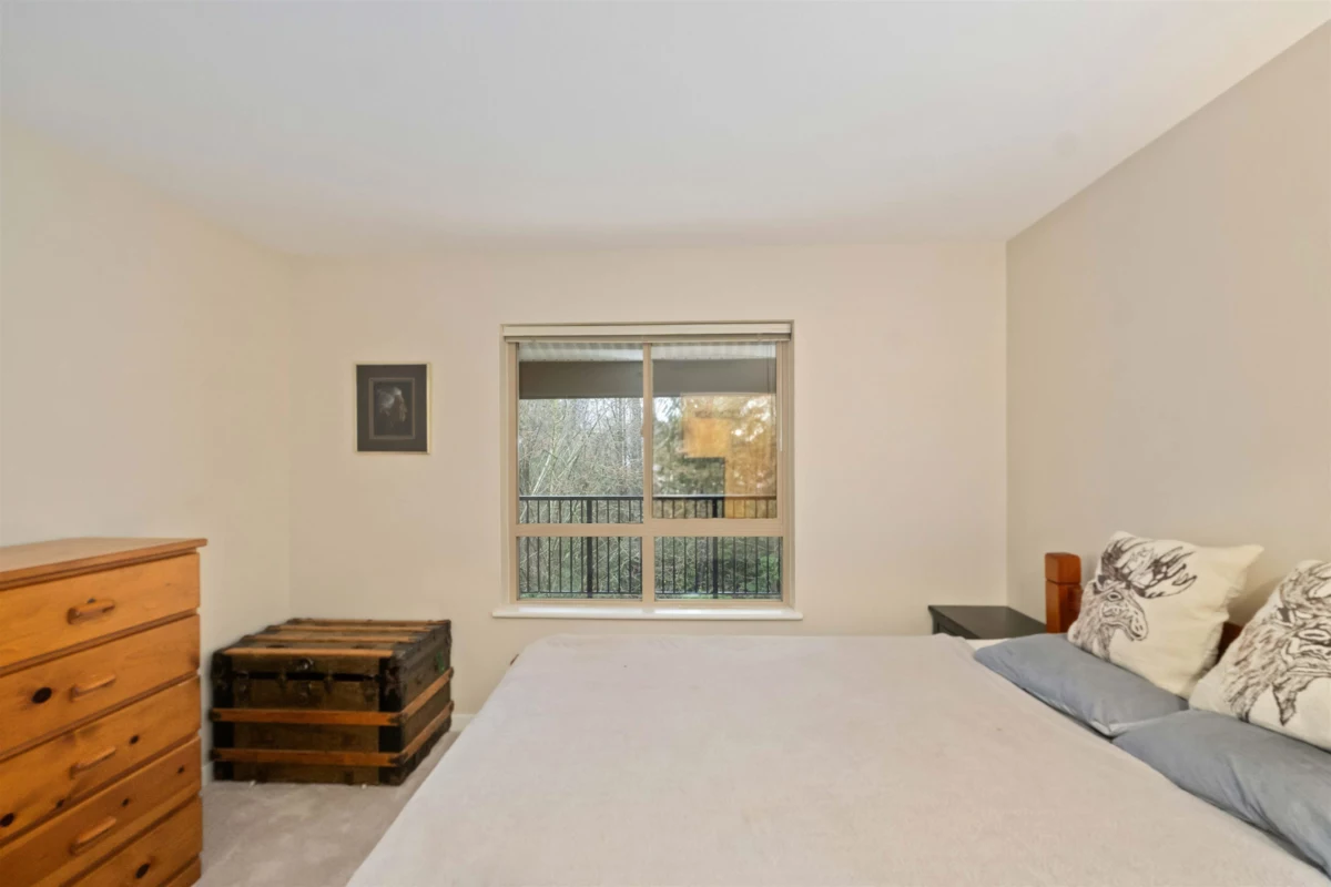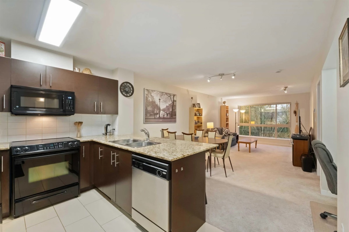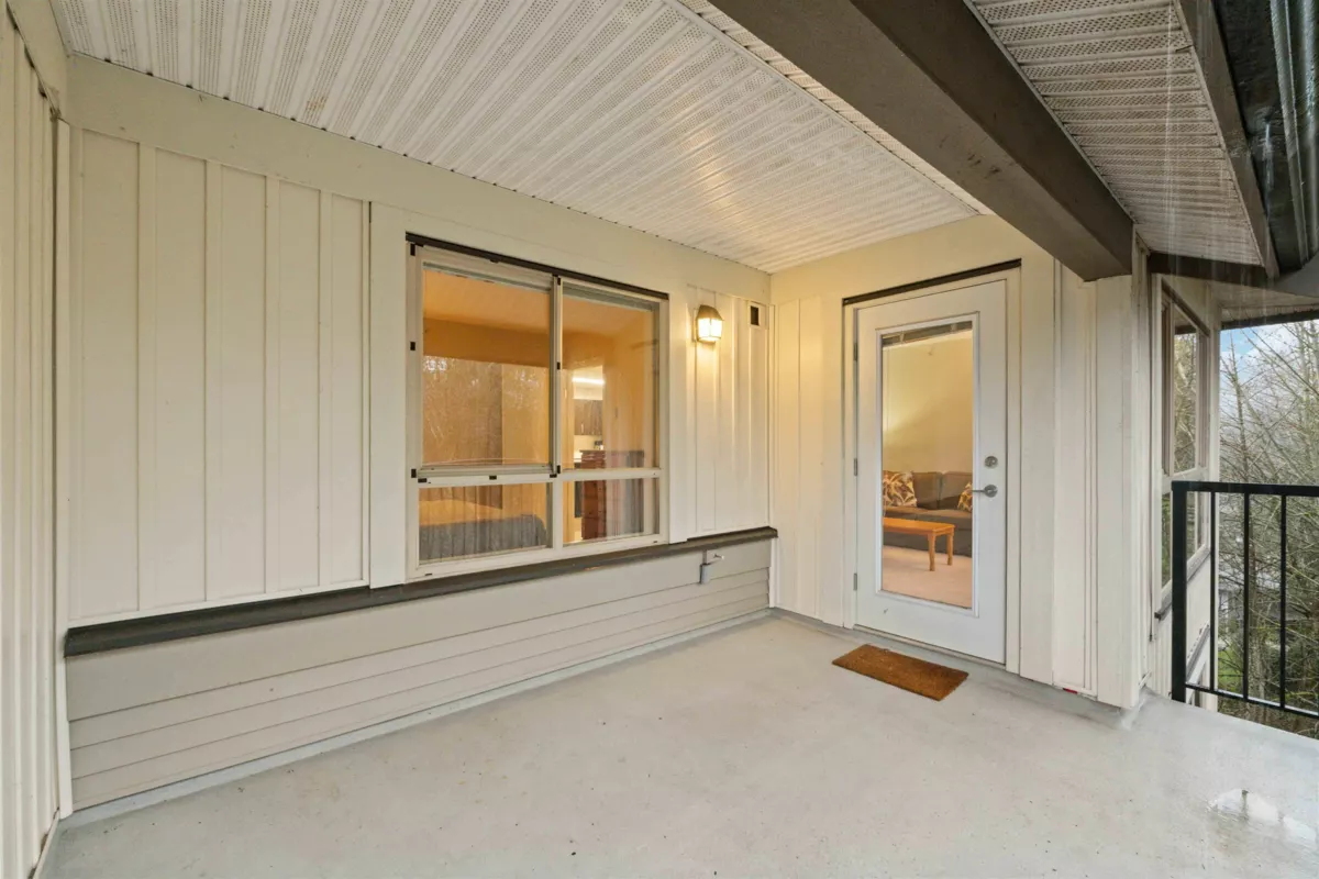 Spacious top-floor 1 bedroom plus den home featuring a well-designed open-concept floor plan and peaceful greenbelt exposure. With over 700 sqft the modern kitchen is equipped with granite countertops and stainless steel appliances, ideal for everyday living and entertaining. Large windows bring in natural light, while the generous balcony overlooks the greenbelt, offering added privacy and a tranquil outdoor retreat. Conveniently located within walking distance to town, transit, West Coast Express, and recreation amenities. Includes a storage locker and 1 parking stall for added convenience.