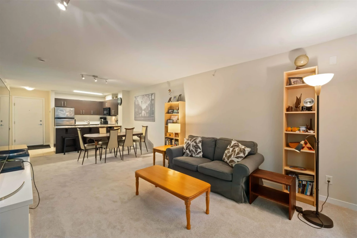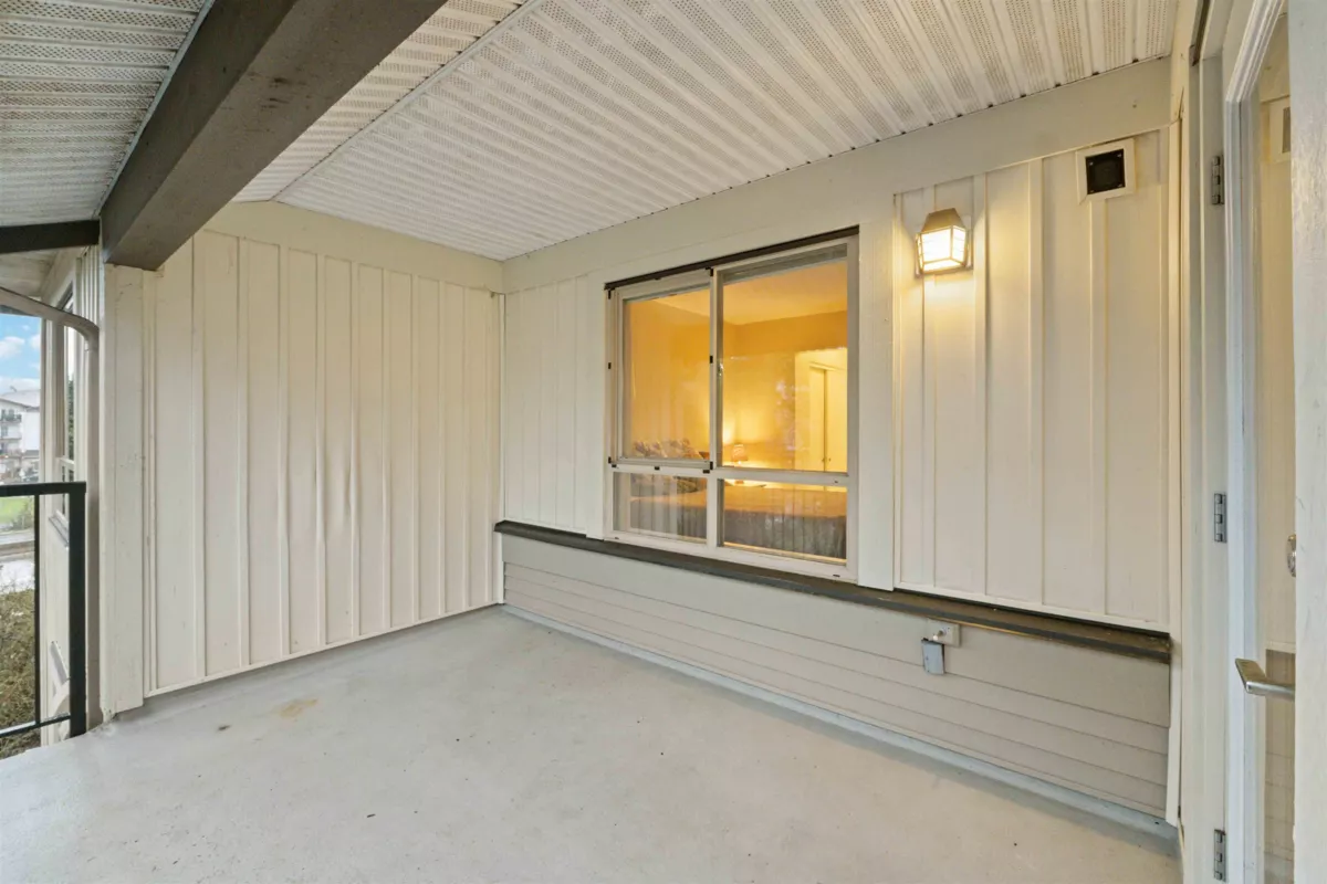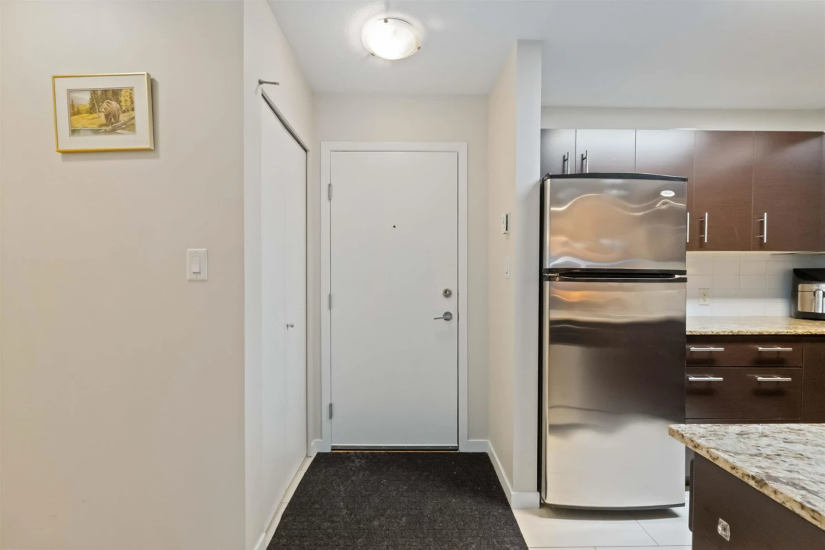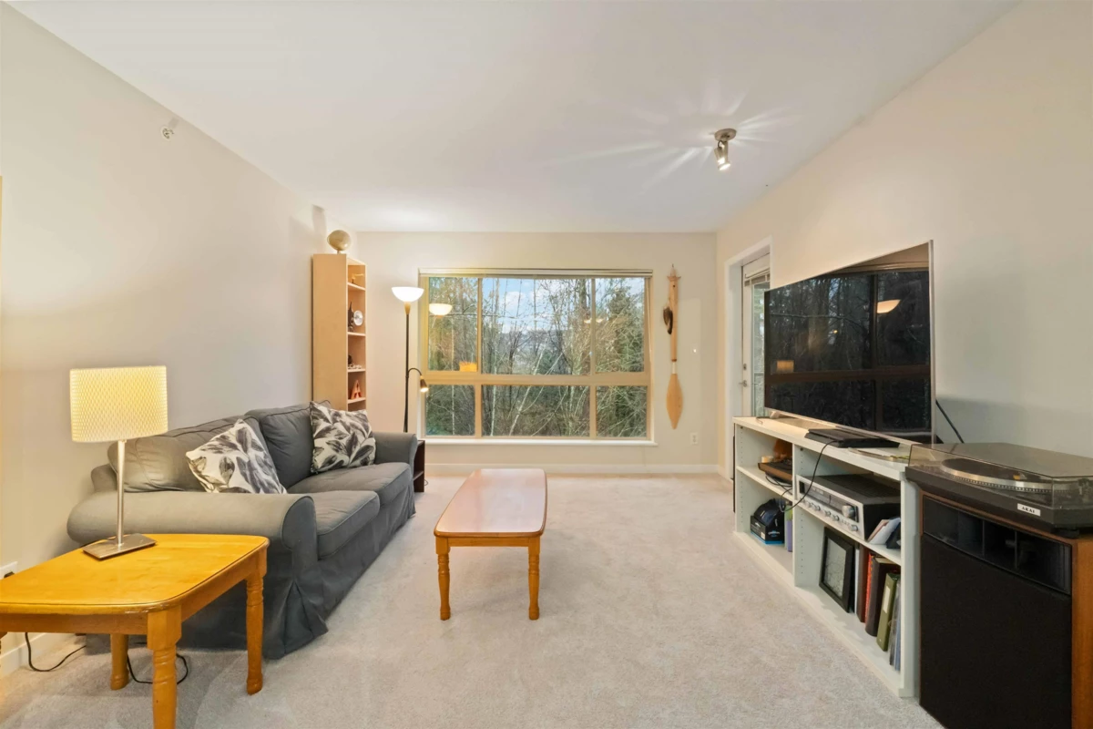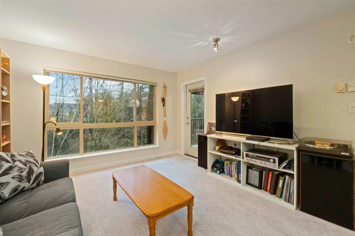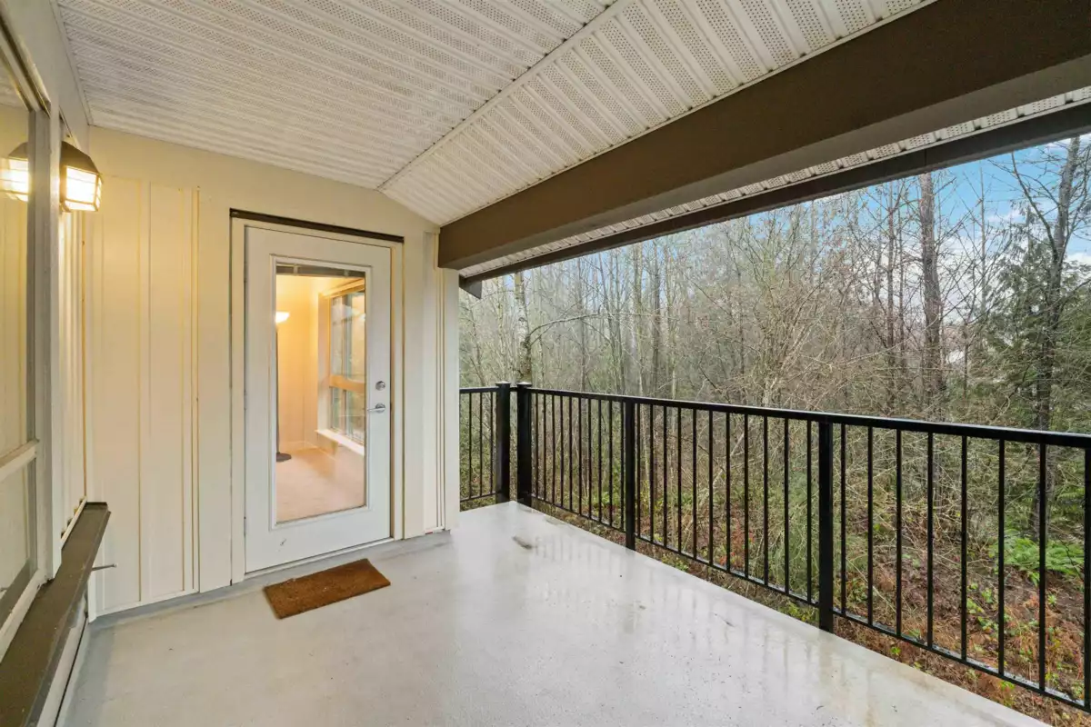 Spacious top-floor 1 bedroom plus den home featuring a well-designed open-concept floor plan and peaceful greenbelt exposure. With over 700 sqft the modern kitchen is equipped with granite countertops and stainless steel appliances, ideal for everyday living and entertaining. Large windows bring in natural light, while the generous balcony overlooks the greenbelt, offering added privacy and a tranquil outdoor retreat. Conveniently located within walking distance to town, transit, West Coast Express, and recreation amenities. Includes a storage locker and 1 parking stall for added convenience.