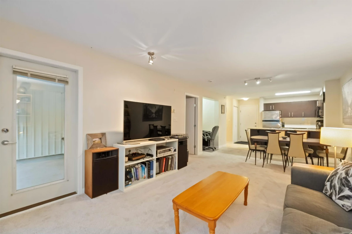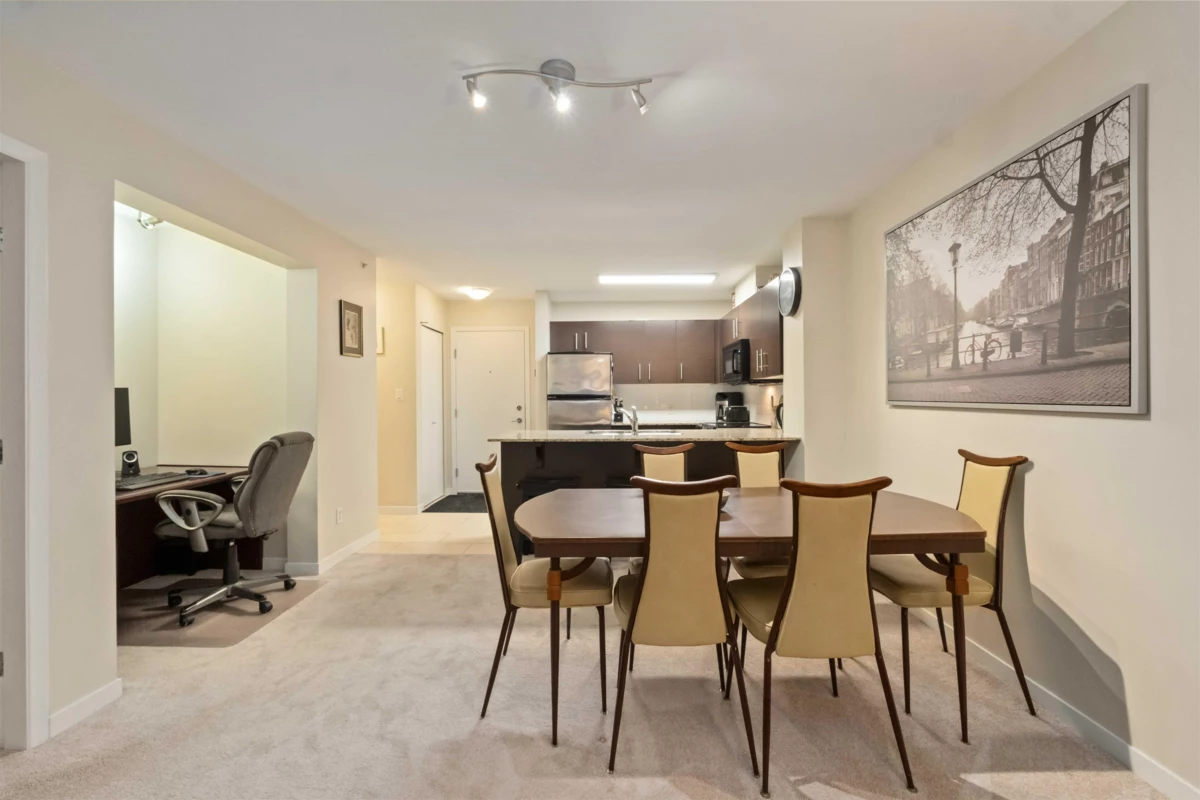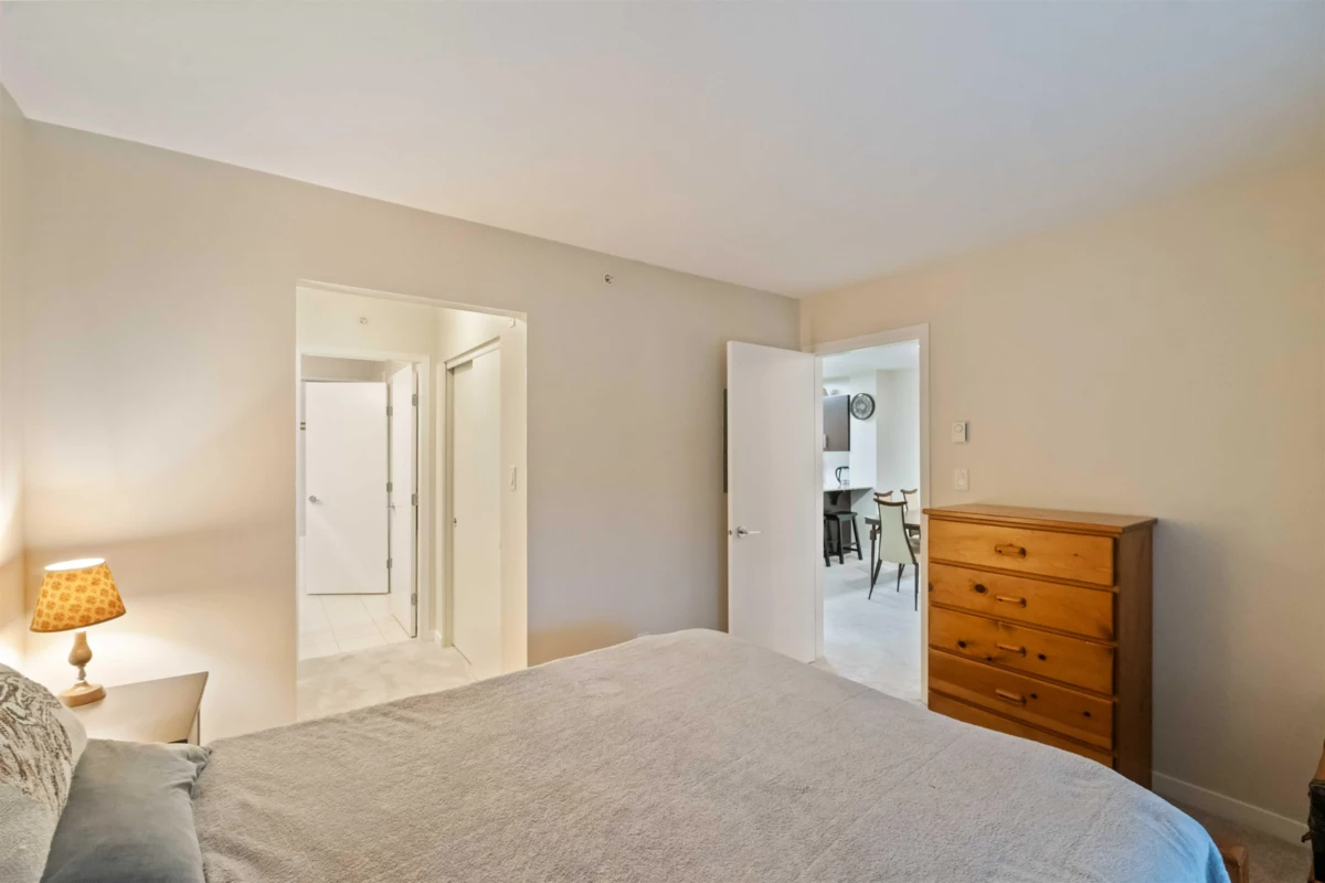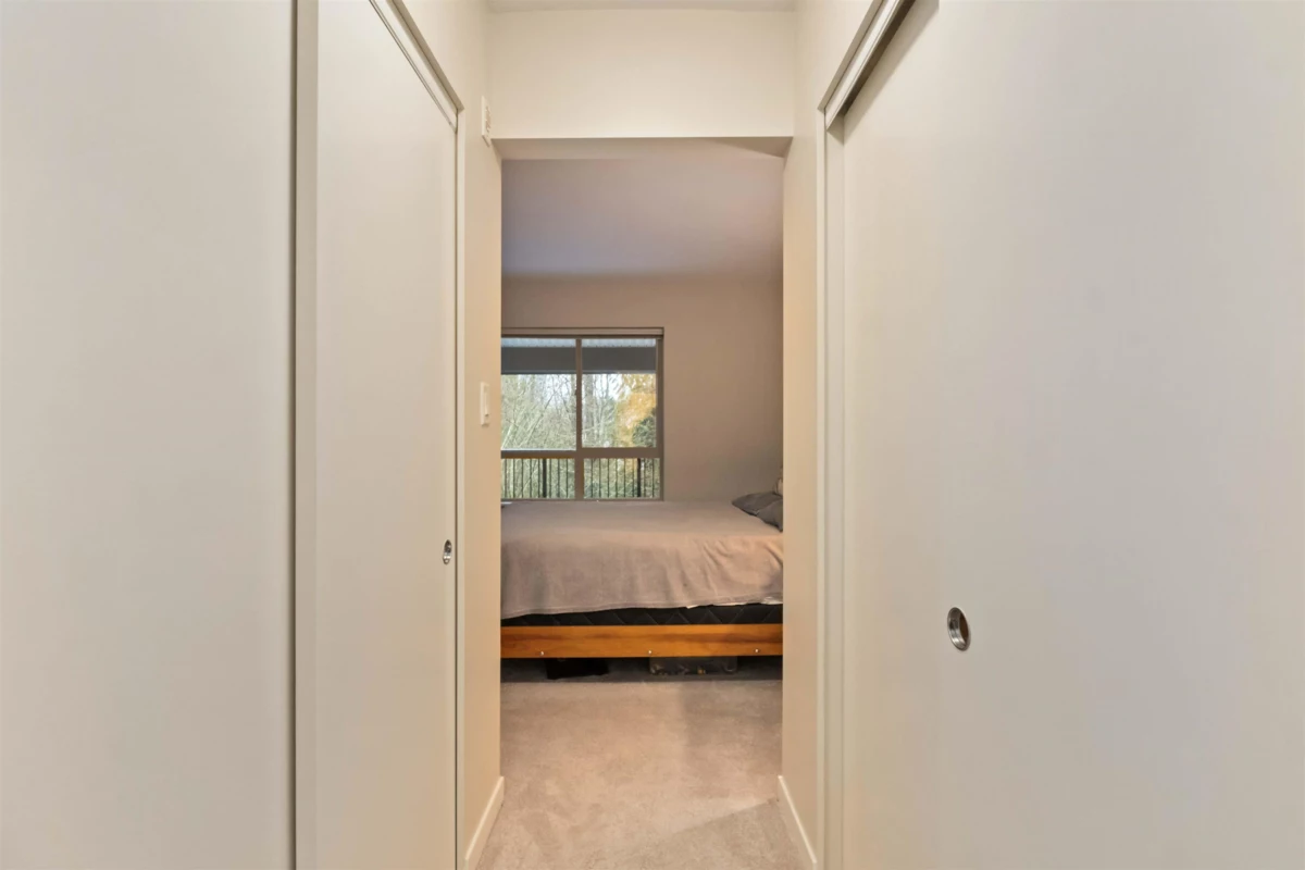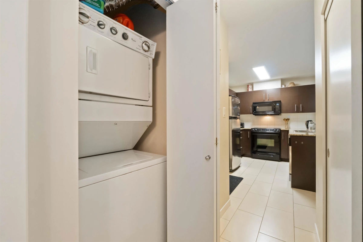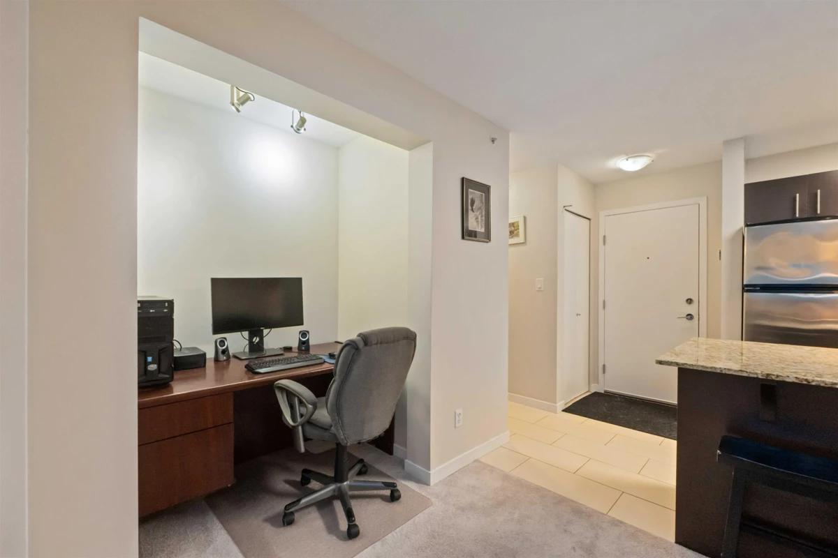 Spacious top-floor 1 bedroom plus den home featuring a well-designed open-concept floor plan and peaceful greenbelt exposure. With over 700 sqft the modern kitchen is equipped with granite countertops and stainless steel appliances, ideal for everyday living and entertaining. Large windows bring in natural light, while the generous balcony overlooks the greenbelt, offering added privacy and a tranquil outdoor retreat. Conveniently located within walking distance to town, transit, West Coast Express, and recreation amenities. Includes a storage locker and 1 parking stall for added convenience.