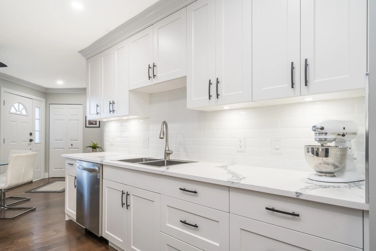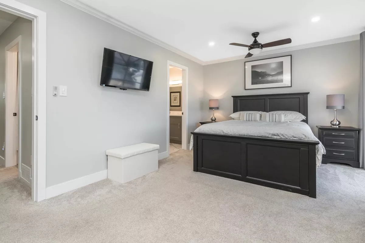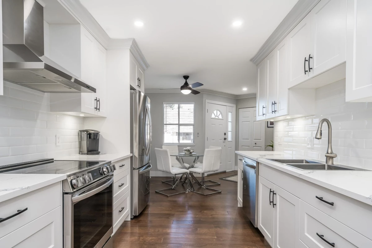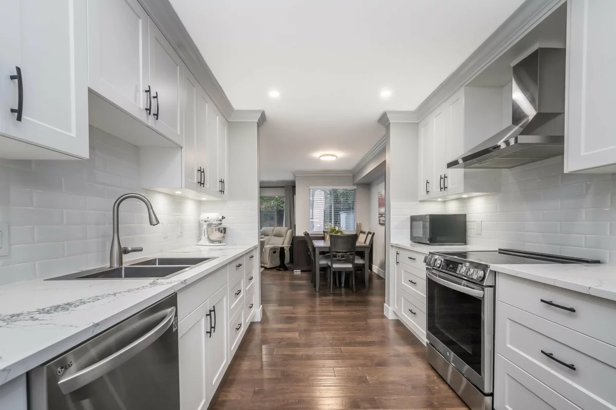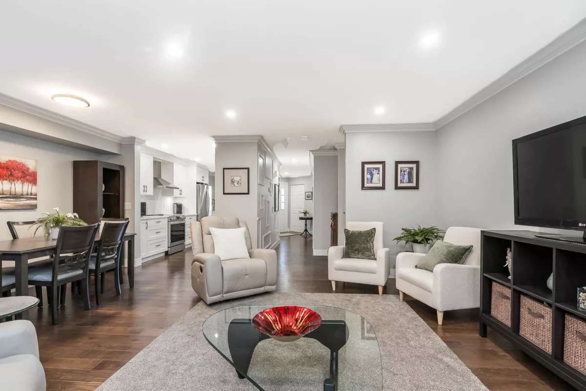 Absolutely beautifully updated from top to bottom! Rich hardwood floors flow throughout the main level, complementing a timeless white kitchen loaded with quartz counters and new quality appliances. The living room features a newer gas f/place with surround and hearth, plus sliders to a private backyard and newly poured patio—perfect for entertaining. A powder room and laundry/storage with new washer and dryer complete the main floor. Upstairs, the spacious primary bedroom offers an updated ensuite and private sundeck, along with new carpets throughout. All bathrooms have been fully renovated, and major upgrades include updated PEX plumbing, new furnace, A/C, hot water tank, crown mouldings, millwork, light fixtures, door hardware, window coverings, and garage door opener. Simply put WOW!