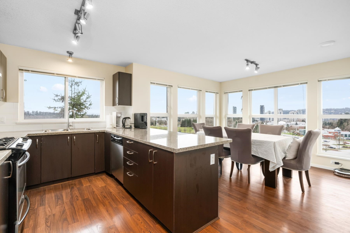 Nestled in the heart of Coquitlam's most desired neighborhood, this expansive PENTHOUSE LEVEL 1,333 sqft, SE corner unit, offers the largest floor plan in the West Coast-inspired complex. Featuring a versatile 3B/2B layout w/ panoramic views from every room, centered by a bright + spacious living + dining room. The gourmet kitchen boasts granite counters, SS appliances, ample counter + storage space that seamlessly flow into a stunning eating area + over sized covered patio. BONUS 2 parking + XL lobby access storage. Enjoy resort amenities in a 7,500sqft club house w/ outdoor pool/hot tub, gym, floor rink, theatre, game rm. + dog-washing station. Blending serenity + modern convenience living, w/ easy access to shopping, dining, parks, school, transit!