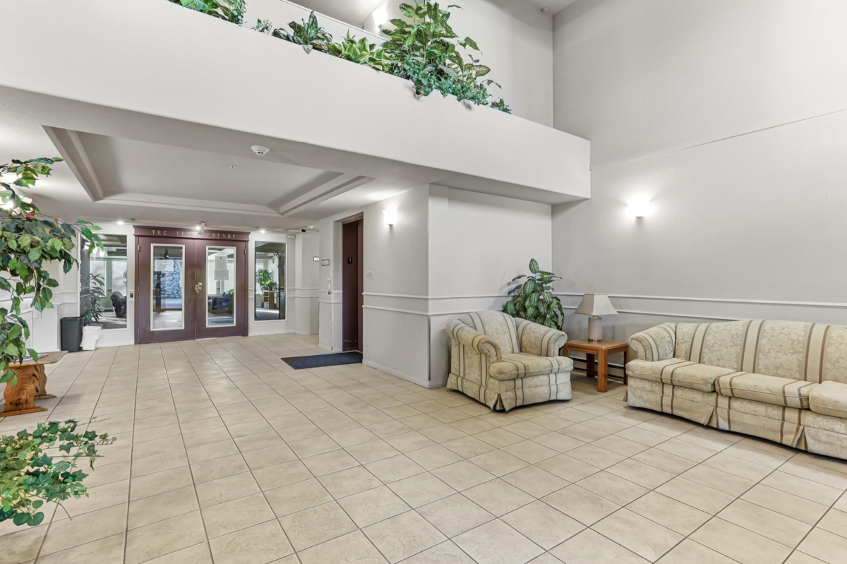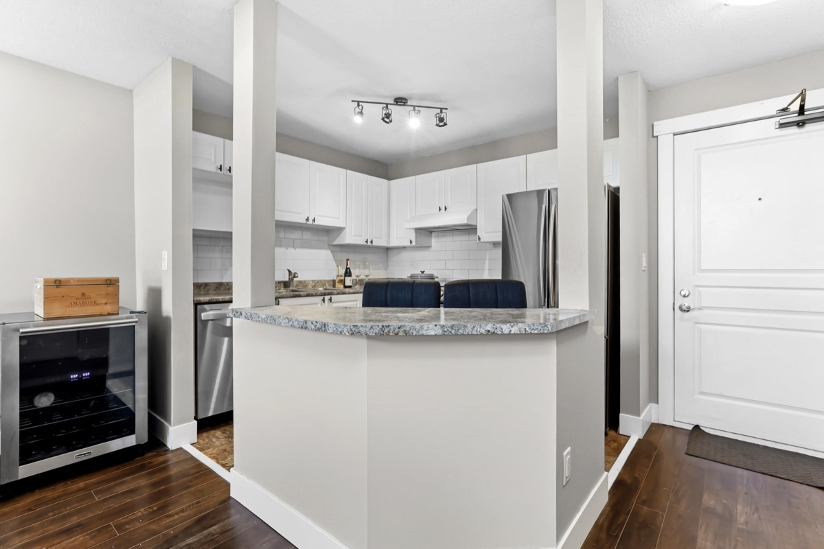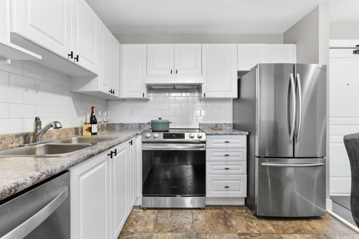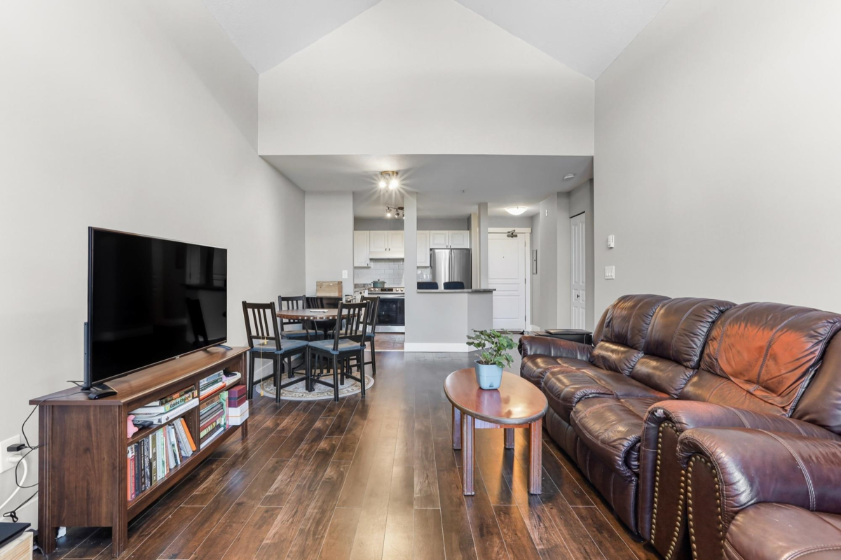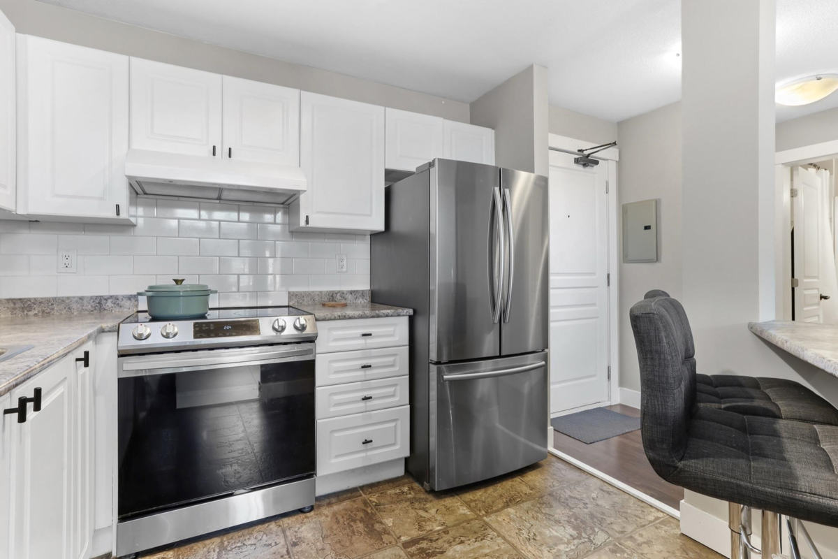Welcome home to this inviting top-floor corner retreat, flooded with natural light and showcasing northwest-facing views. Soaring 14-ft vaulted ceilings create an open, airy atmosphere, while the cozy gas fireplace (included in strata fees) makes it the perfect place to unwind. Step outside to your generous 126 sq. ft. patio—ideal for enjoying warm summer evenings. The kitchen shines with stainless steel appliances, including a stylish double French-door refrigerator. The spacious bedroom easily accommodates a king-size bed and features walk-through closets leading to a convenient ensuite with cheater access. Enjoy the added convenience of a fitness centre located on the same floor, plus a beautifully landscaped common outdoor area overlooking the ravine. Pet-friendly building.