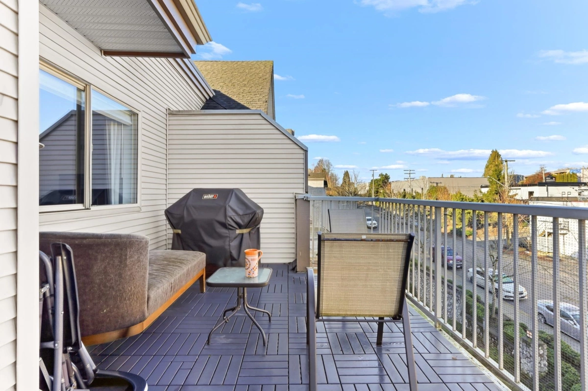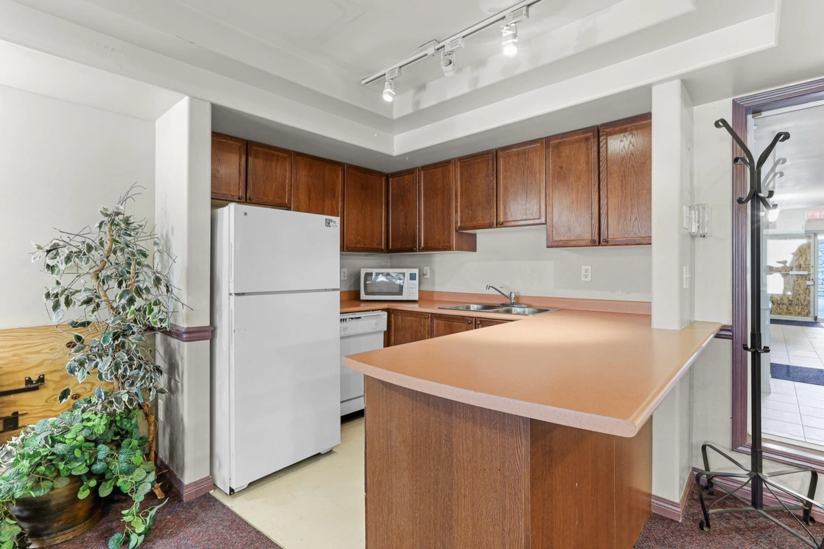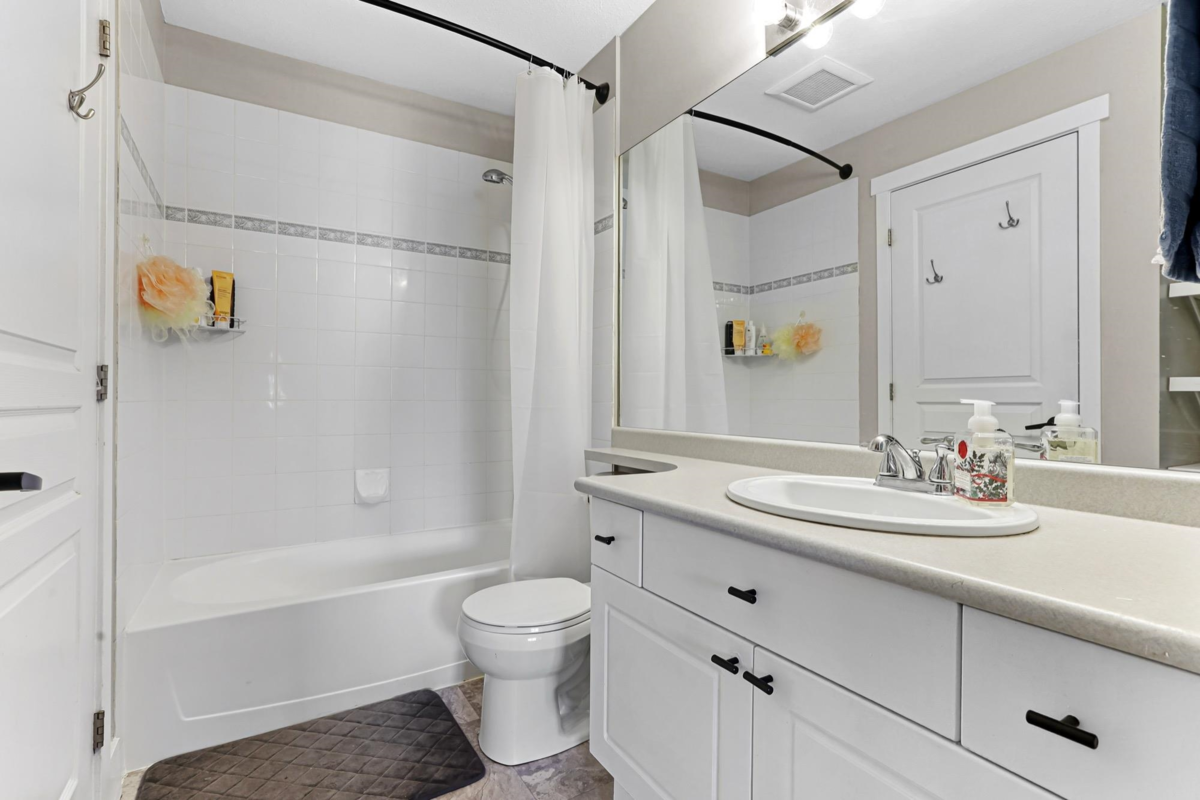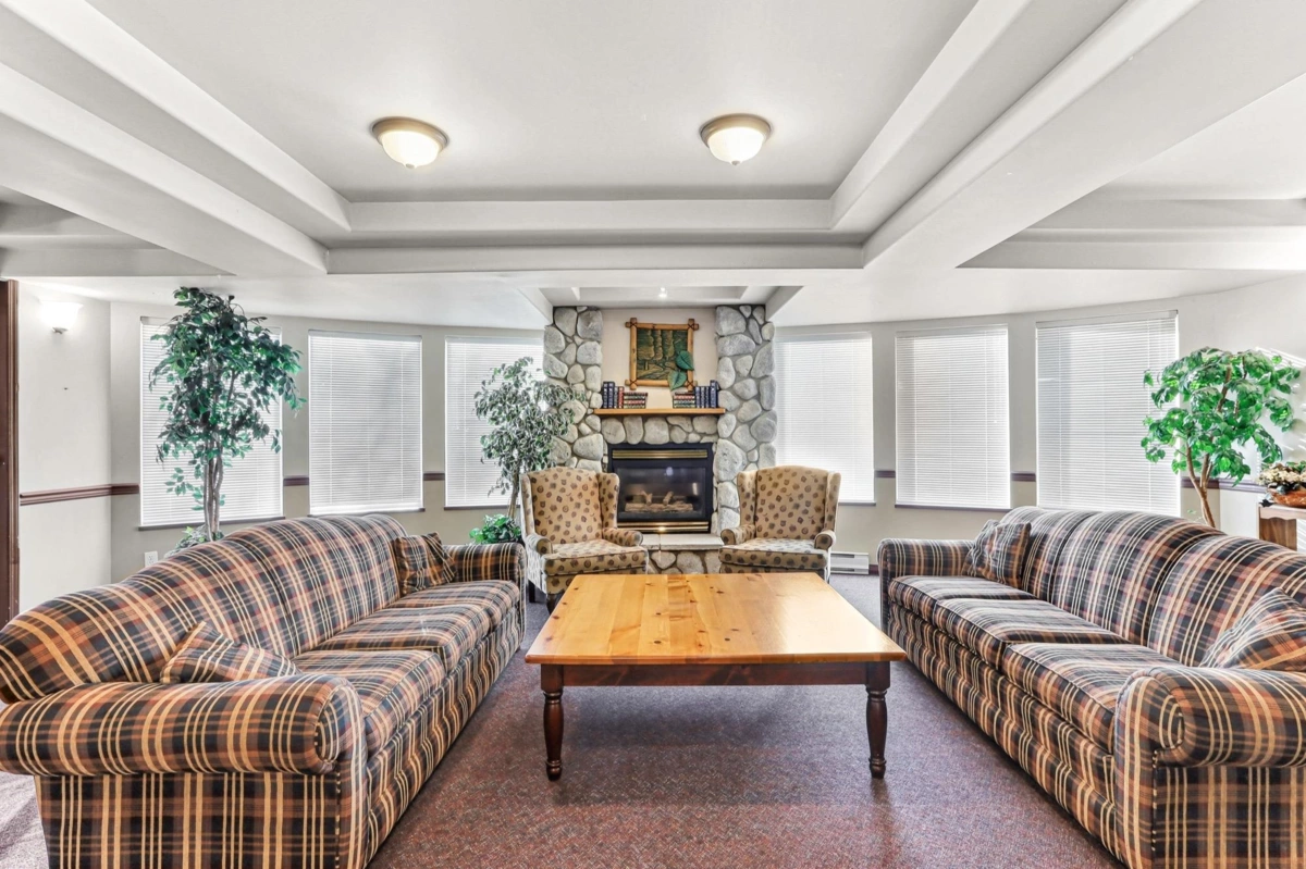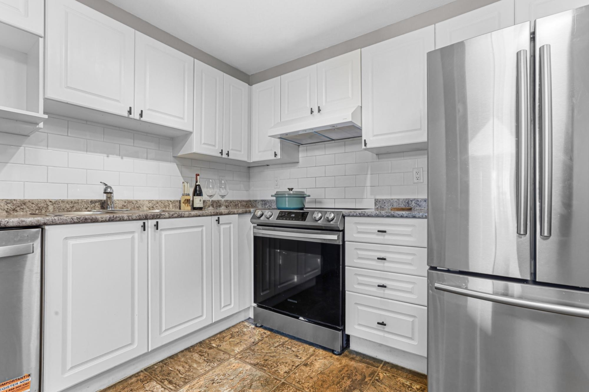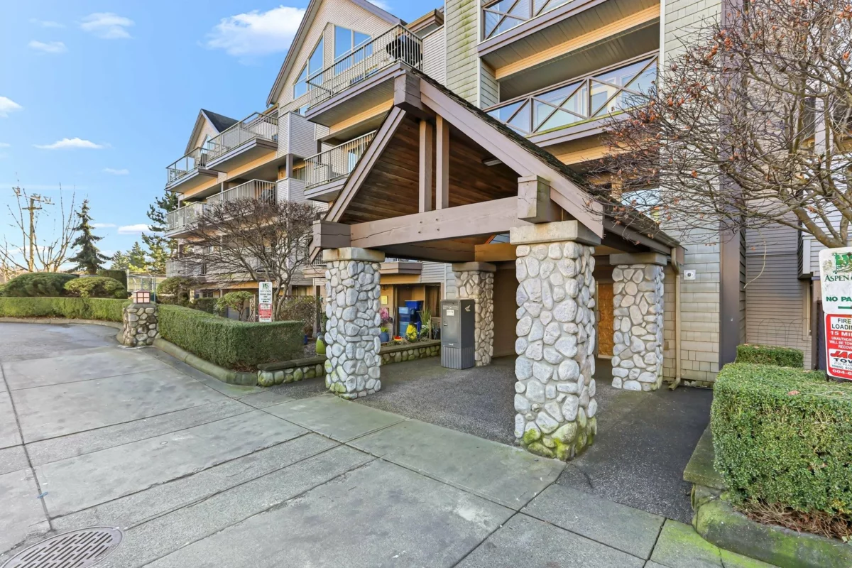 Welcome home to this inviting top-floor corner retreat, flooded with natural light and showcasing northwest-facing views. Soaring 14-ft vaulted ceilings create an open, airy atmosphere, while the cozy gas fireplace (included in strata fees) makes it the perfect place to unwind. Step outside to your generous 126 sq. ft. patio—ideal for enjoying warm summer evenings. The kitchen shines with stainless steel appliances, including a stylish double French-door refrigerator. The spacious bedroom easily accommodates a king-size bed and features walk-through closets leading to a convenient ensuite with cheater access. Enjoy the added convenience of a fitness centre located on the same floor, plus a beautifully landscaped common outdoor area overlooking the ravine. Pet-friendly building.