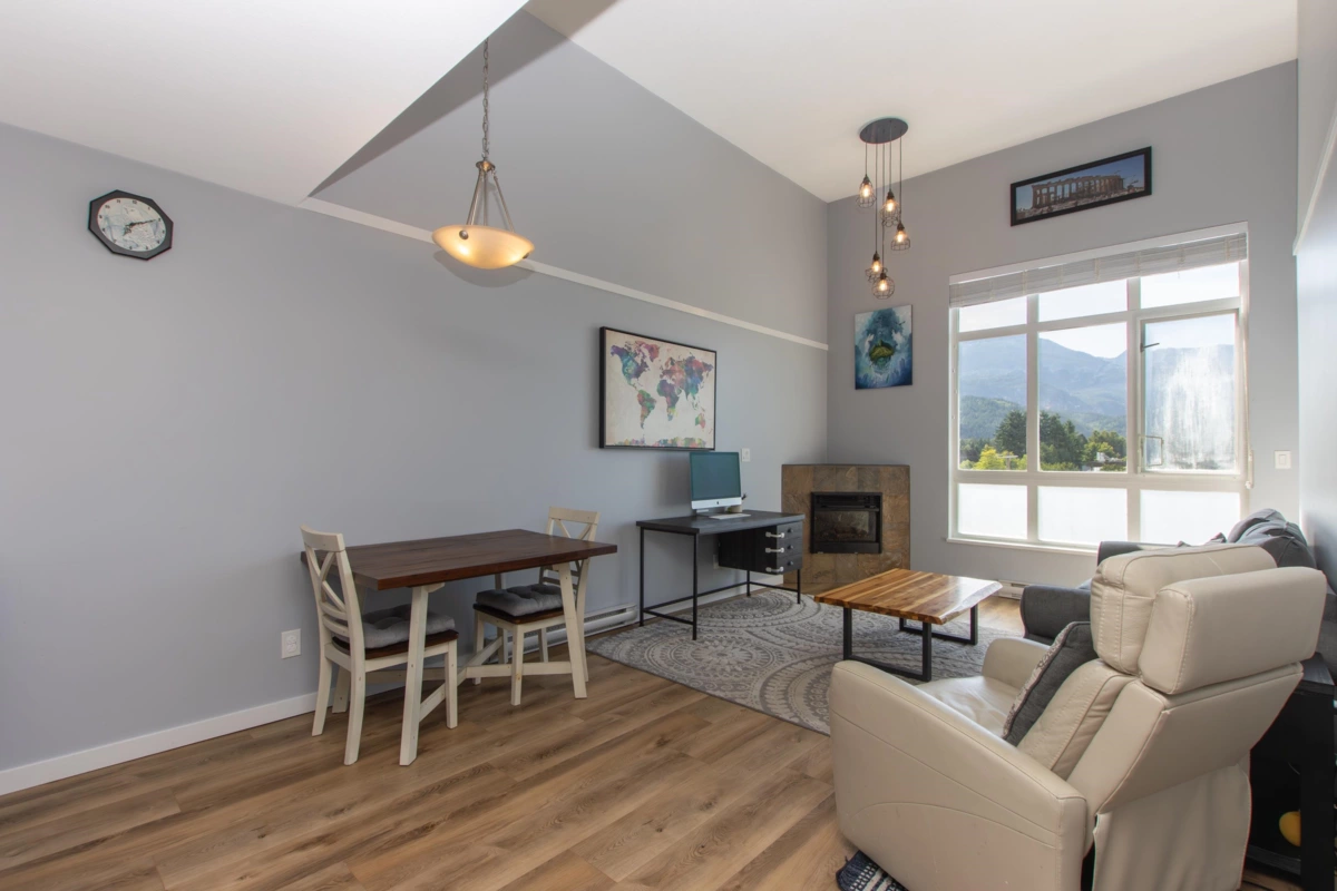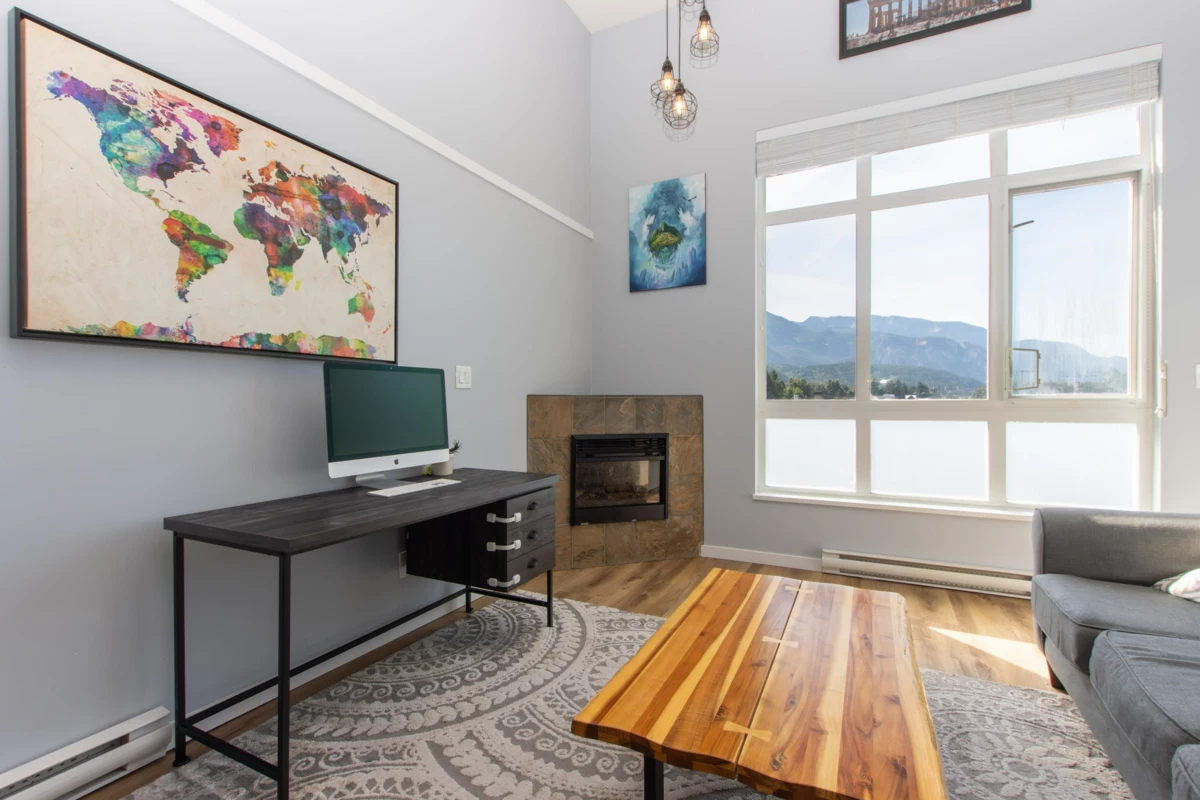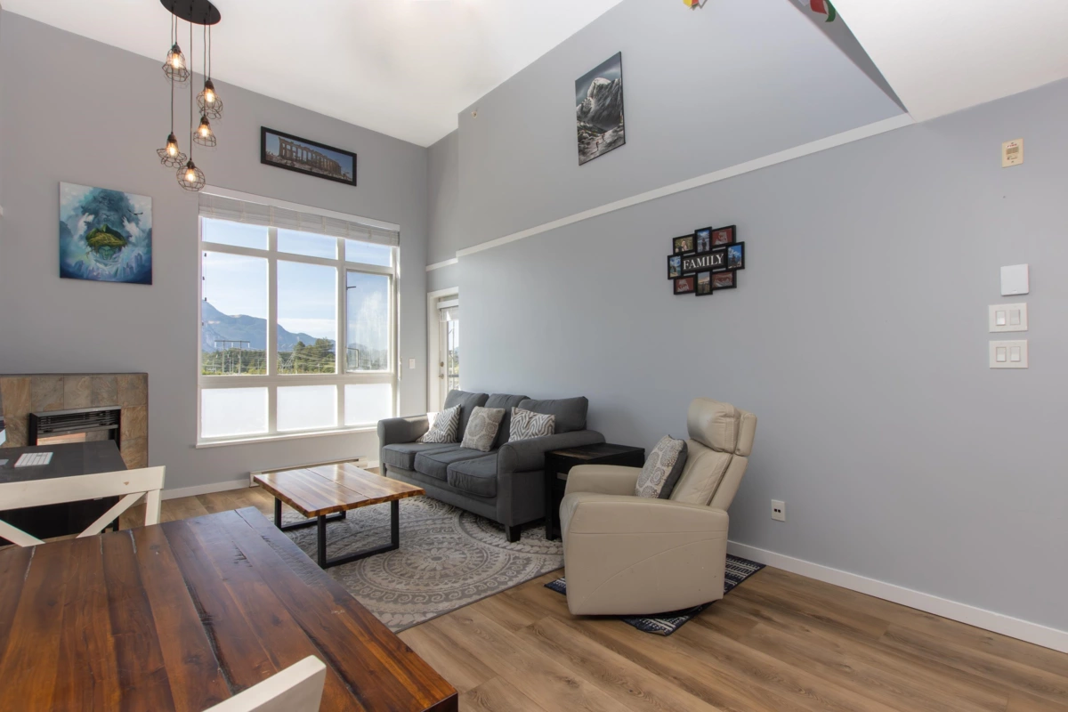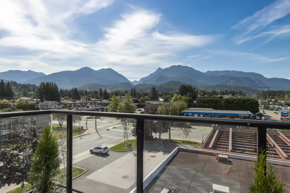 Enjoy stunning panoramic views of The Stawamus Chief, Sky Pilot & Coast Mountains from this top floor Spectacle condo. The spacious 2 bdrm, 2 full bath home boasts an open concept layout with 14' ceilings, a living room flooded w/ natural light & warmed by a corner fireplace, easy care laminate & tile floors, a primary suite with walk-in closet, 3 pce ensuite & extra room for an office area or additional storage, in-suite laundry, efficient kitchen & balcony. To make your active lifestyle a bit more convenient, enjoy the common area fitness center, secure bike storage and walking/biking distance to all amenities - shopping, restaurants, cafes, world class hiking & biking trails, Squamish Valley Golf, Squash & Curling Clubs. A short 35 minutes to both Whistler & North Vancouver.