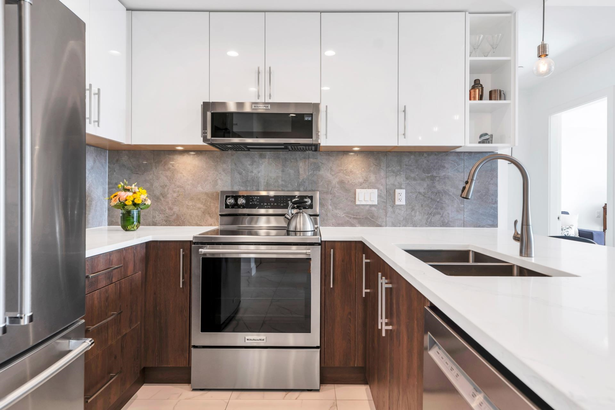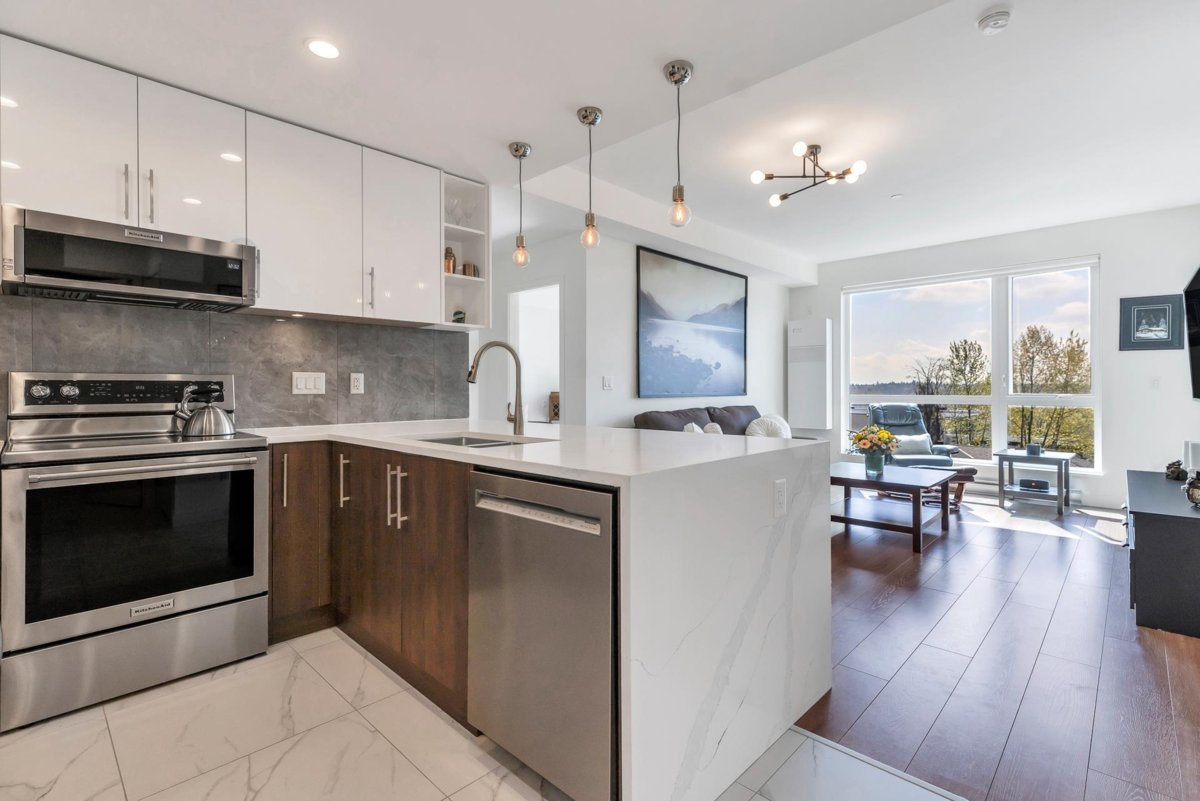 Welcome Home to Sierra Ridge! Beautiful 2 bedroom, 2 bath plus Den, Top Floor Condo in the Heart of Maple Ridge. Enjoy the Chef inspired kitchen modern cabinets, stainless appliances, huge sit-up island w/waterfall quartz counters. Open living space w/over size windows & and plenty of room for full size furniture. Primary suite will accommodate a king size bed, has a walk-in closet & ensuite with oversize shower. Second bedroom, is as big, with walk-in closet & cheater door to the main bath. Large den could be bedroom for young one. 9' ceilings, a/c, floor to ceiling windows, storage locker, 1 parking. Private balcony w/ gas hook up & breath taking views of the River, Mt. Baker & Sunsets. Roof top amenity w/lounge, gas fire pits & BBQ. Steps to all amenities, River and West Coast Express!