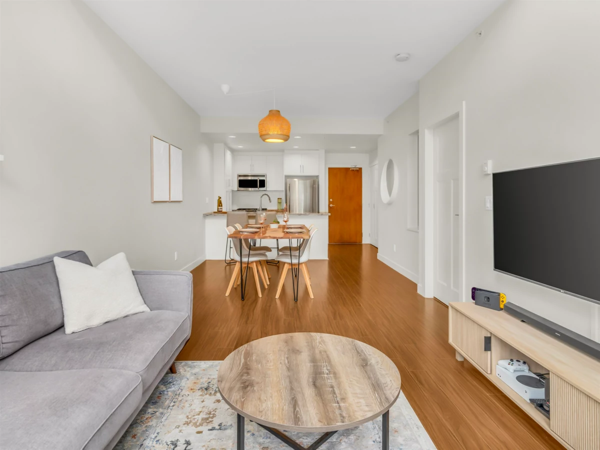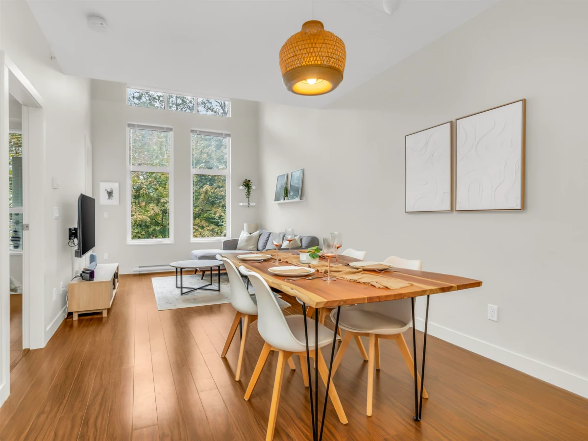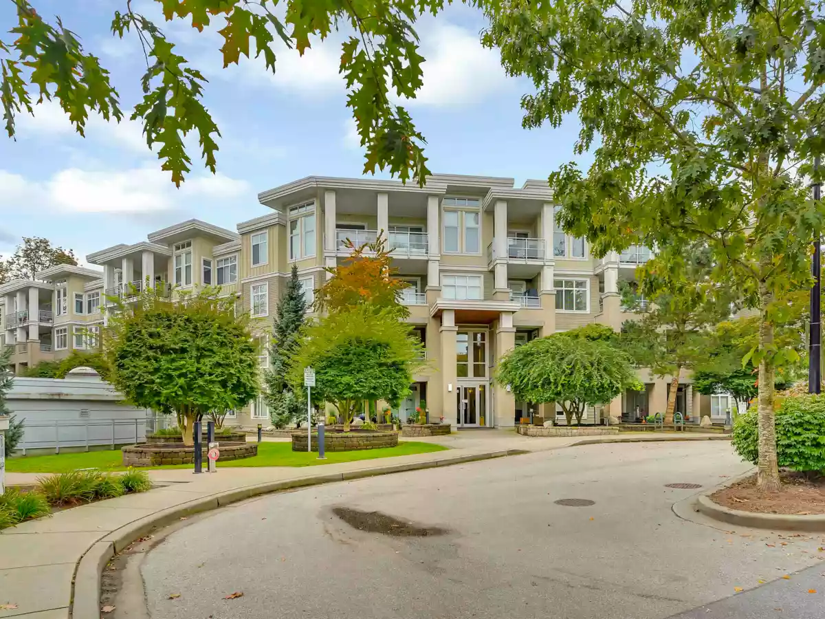 Bright & quiet top floor suite with large covered south-facing deck, overlooking the greenbelt(protected greenbelt area). Featuring: laminate floors, granite countertops, s.s. appliances, gas range, washer/dryer. GRAND 13'5" high ceiling w/extra large windows that cheer up the living room. Dining area can accommodate large table. Perfect built in desk area adjacent to the bedroom. Rentals & pets allowed. One dedicated hand wash car bay. New e-charge stations. New Roof. Great amenities: Indoor Gym Building, Recreation Room, Business Offices for Rent, secured bike room, close to schools, shopping, amazing walking trails at your doorstep, & easy access to Hwy 99! Bonus:1 parking stall plus 2 large lockers included.