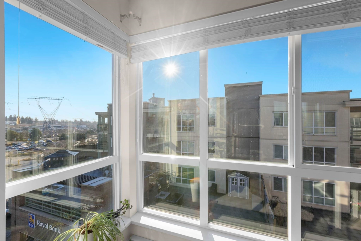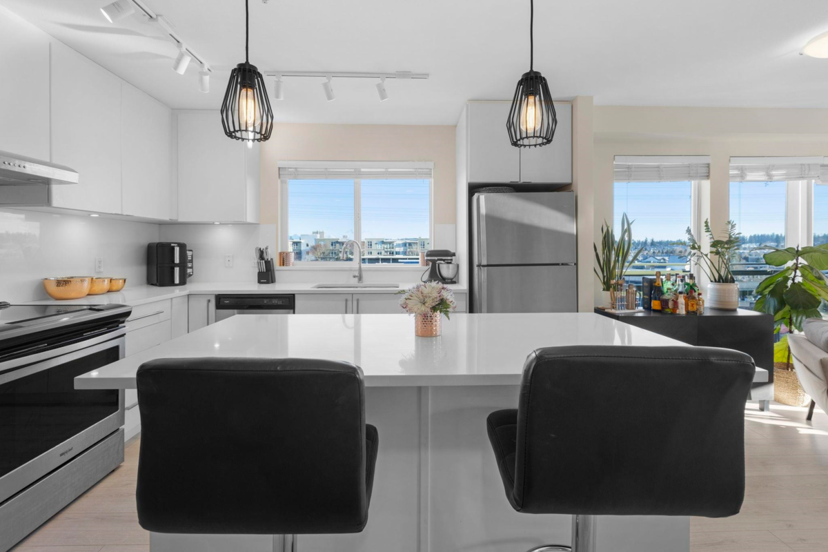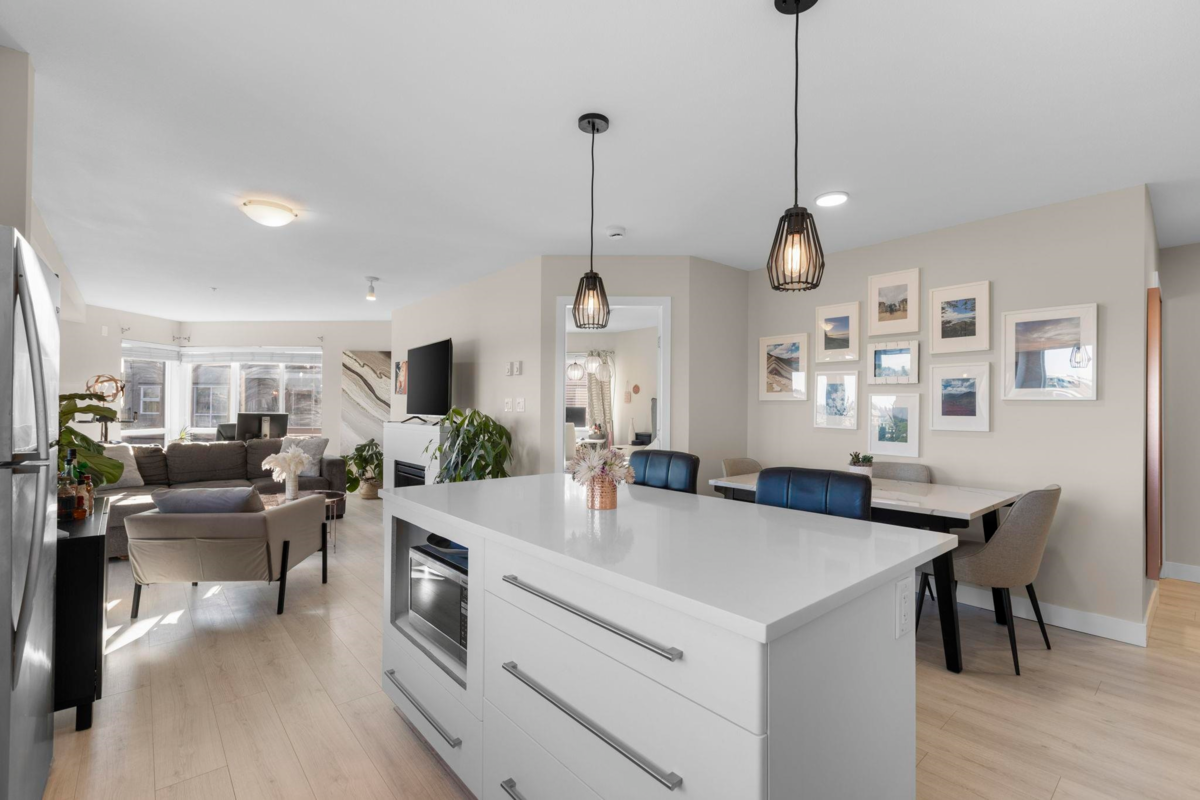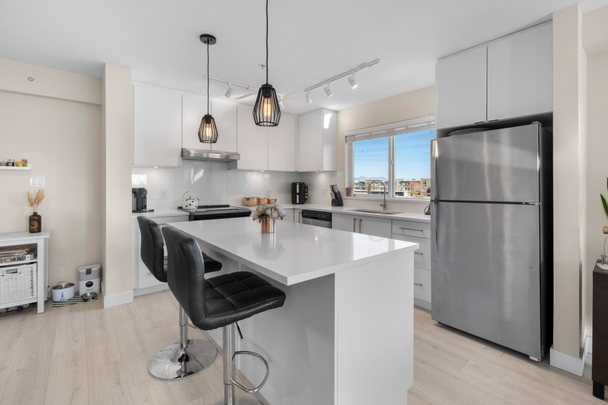 Welcome to PIVOT in Morgan Crossing - Situated on the top floor, this bright corner 1-bedroom home offers nearly 800 sq ft of well-designed living space. Expansive north and east windows bring in abundant natural light, enhancing the open layout. The kitchen features quartz counters, a generous island, and stainless steel appliances. A flexible bonus area easily accommodates a home office, bar setup, or added storage. Step outside to a roomy patio, perfect for outdoor dining. One secure parking stall close to the entrance and a large storage locker are included. Two pets welcome with no size limits and rentals allowed. Walk to shops, groceries, and restaurants just outside your door.