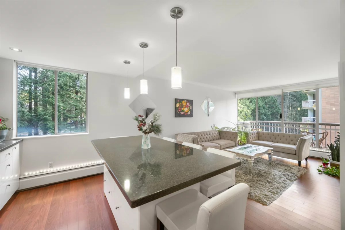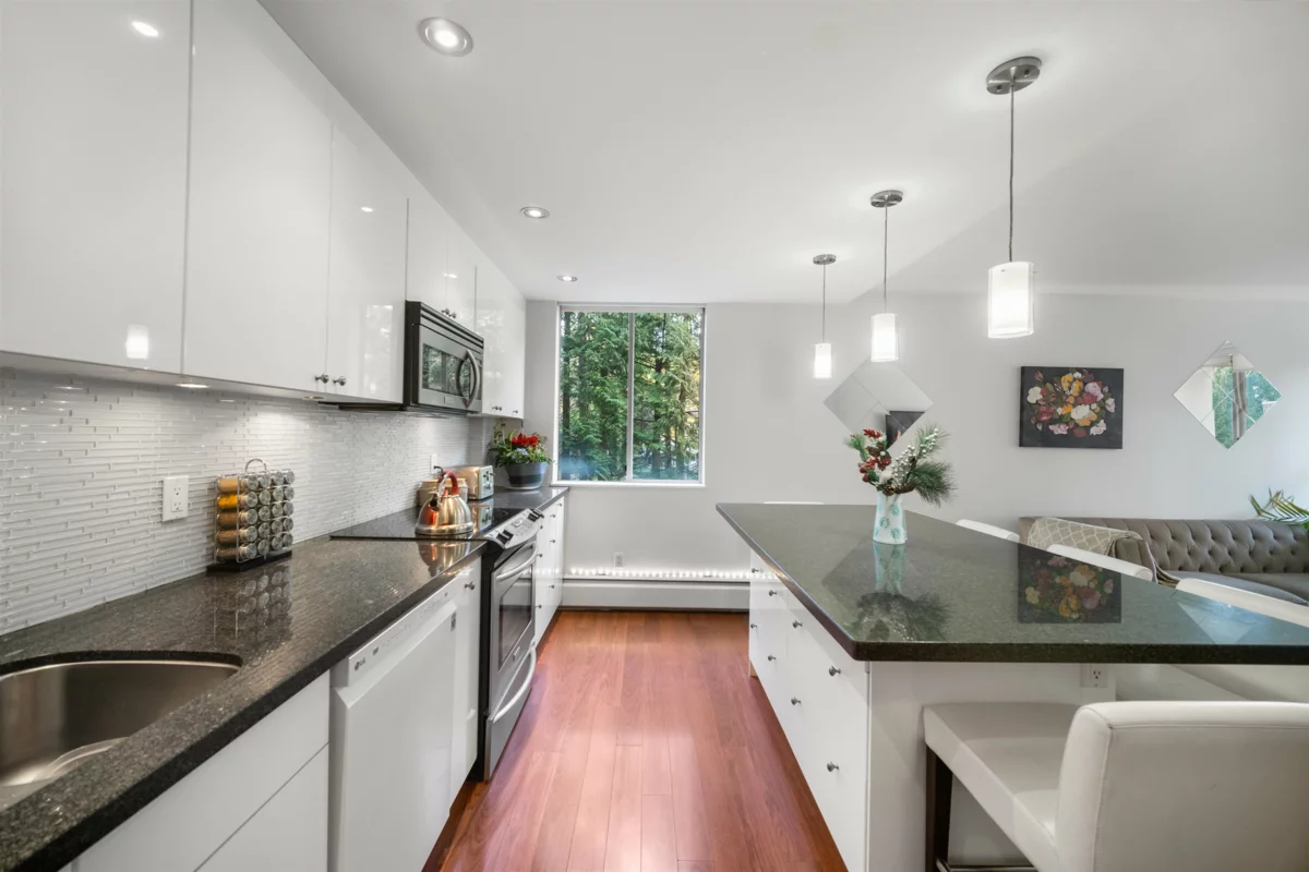 Introducing the Lilloet building at Woodcroft Estates! This spacious, OVERSIZED CORNER UNIT boasts top-of-the-line glossy white cabinetry, a stunningly huge granite kitchen island that can accommodate 8 people, a deep soaker tub in the bathroom, and a lovely southeast-facing green view. This exceptional package includes a parking stall, locker, indoor pool, library, and gym. With gated access and 24-hour security, Woodcroft is conveniently located at the entrance of the vibrant Lions Gate Village, offering easy access to Park Royal, Ambleside Beach, Capilano Trails, Lonsdale Quay, and just a 12-minute drive to Downtown. Ideal for INVESTORS & FIRST TIME HOMEBUYERS. This property is a must-see! Join us for the first Open House on Saturday& Sunday, January 27th& 28th, from 2-4PM.
