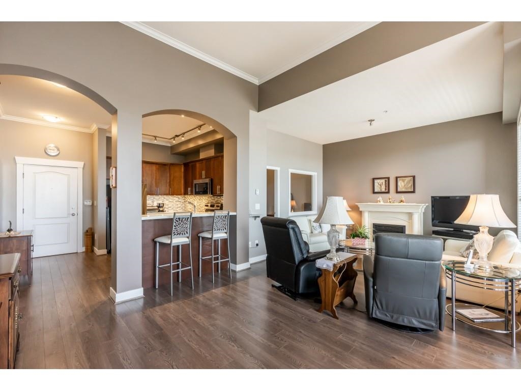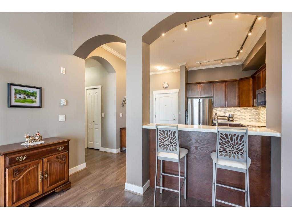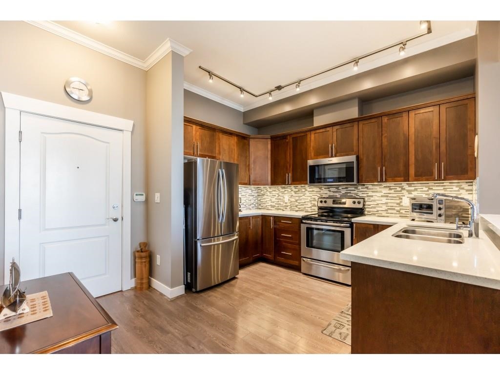 Stunning 1258 square foot, top floor home with soaring ceilings, 2 balconies and large oversized windows for an abundance of natural light. Terrific floor plan with no wasted space and a large den that provides for a variety of uses. Gorgeous kitchen boasting espresso wood cabinets, quartz counters plus a spacious master bedroom which features a deluxe ensuite & walk-in closet. Outstanding central location with a walk score of 92 offering a wide array of amenities at your door step. This includes shopping, specialty food market, coffee house, transit, craft brewery, Poco Recreation Centre, Poco trail, off-leash dog park, banking, restaurants and more! You don't want to miss this one!