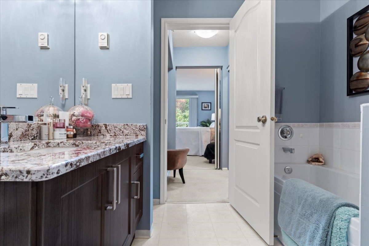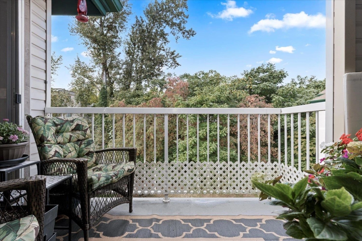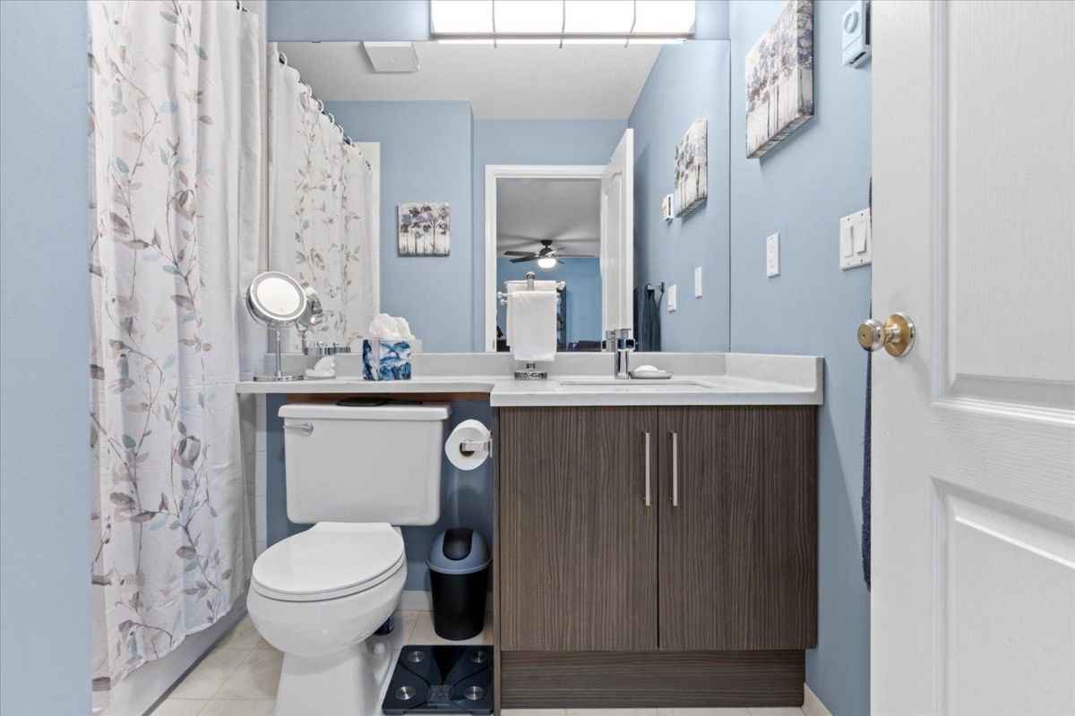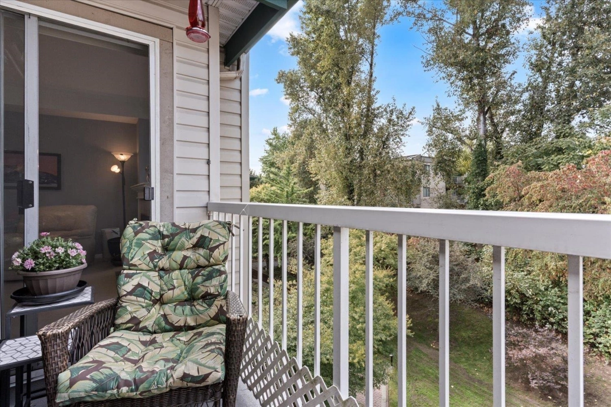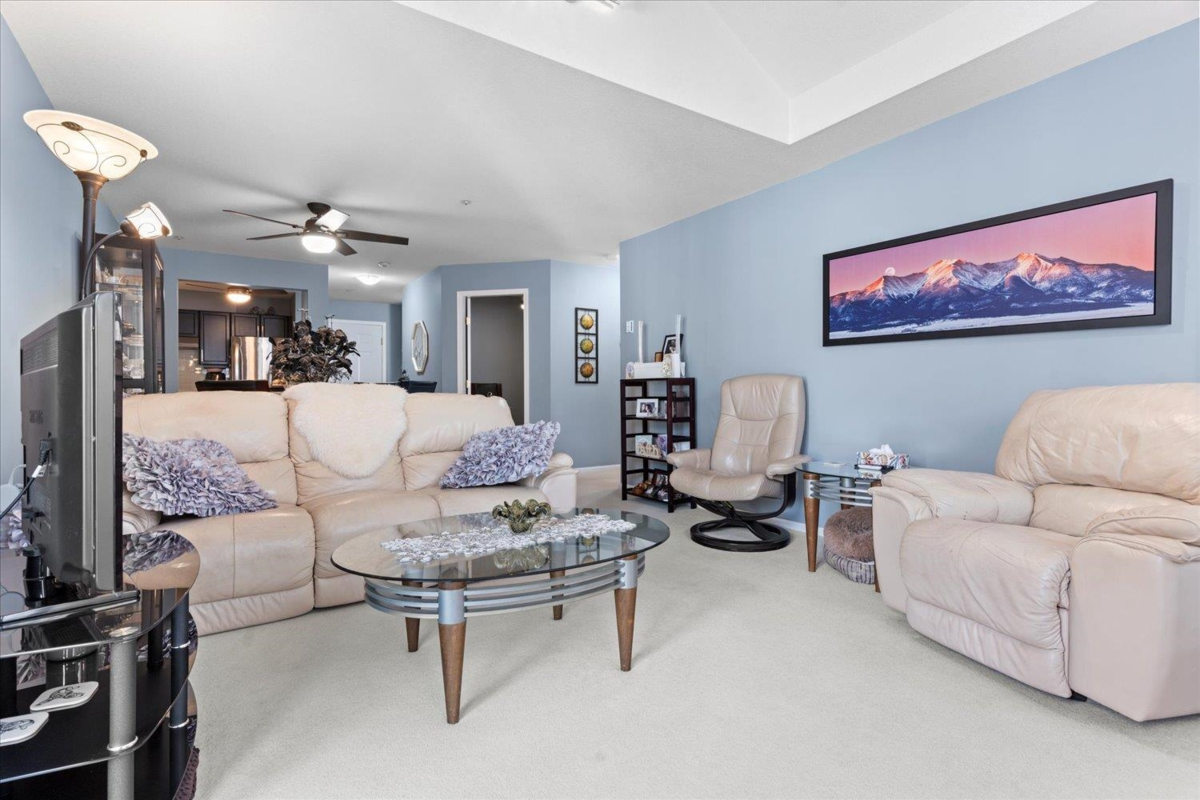Top floor, west-facing 2 Bed + Den Condo in Bramblewoods by the Stream! Updated and move-in ready, this bright and spacious unit features a custom maple kitchen with granite countertops, stainless steel appliances and vaulted ceilings in the open-concept living area. Enjoy a natural gas fireplace (gas incl. in strata fee!) and covered deck perfect for year-round use. Primary bedroom has balcony access and a beautifully updated ensuite with separate tub/shower. Second bath also fully updated. Bonus den, oversized laundry/storage room and a storage locker in the underground area. Quiet 55+ building with a small pet allowed. Prime central location on a cul-de-sac—steps to Horn Creek Nature Path, Mill Lake and shopping. This condo offers downtown convenience without the noise!