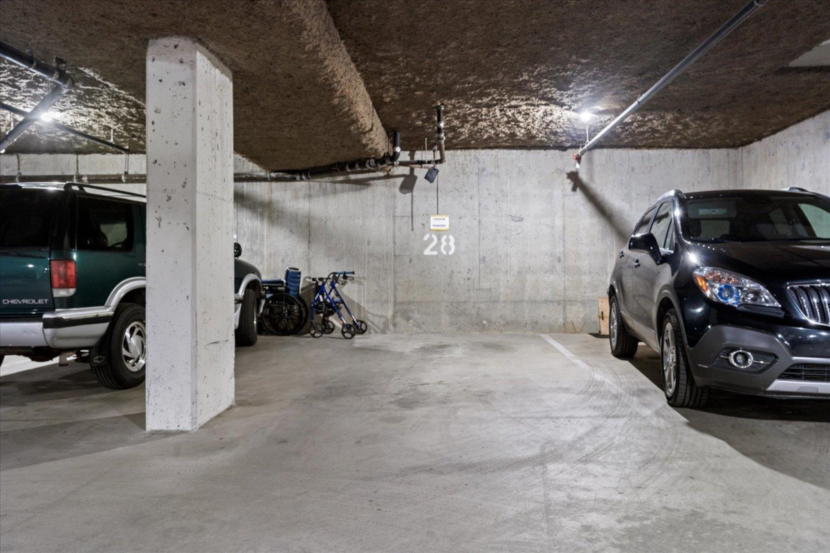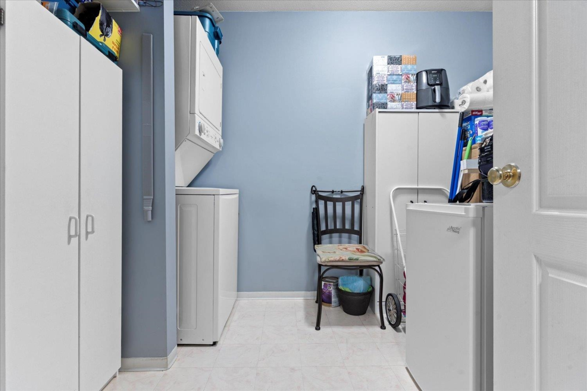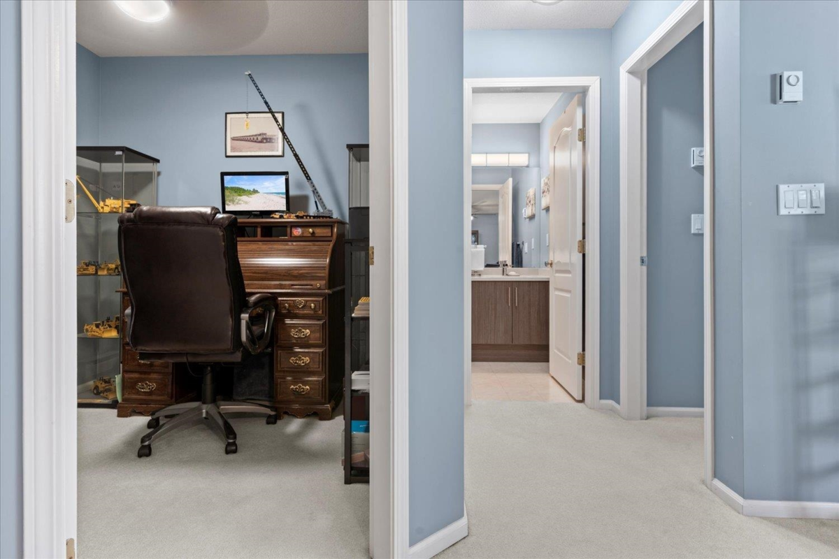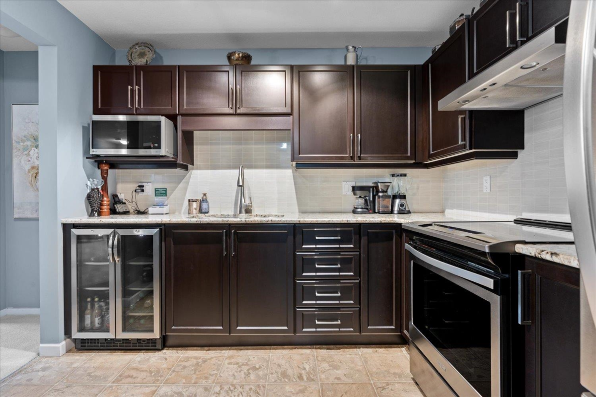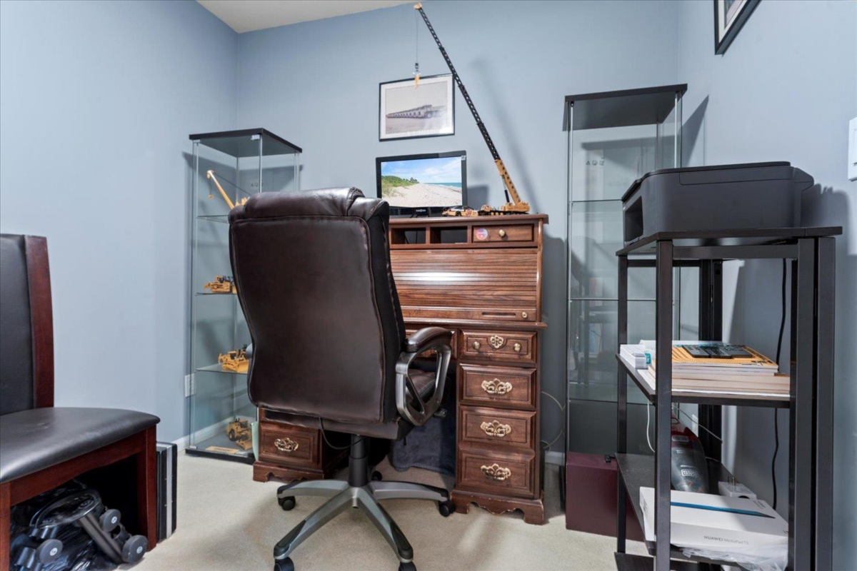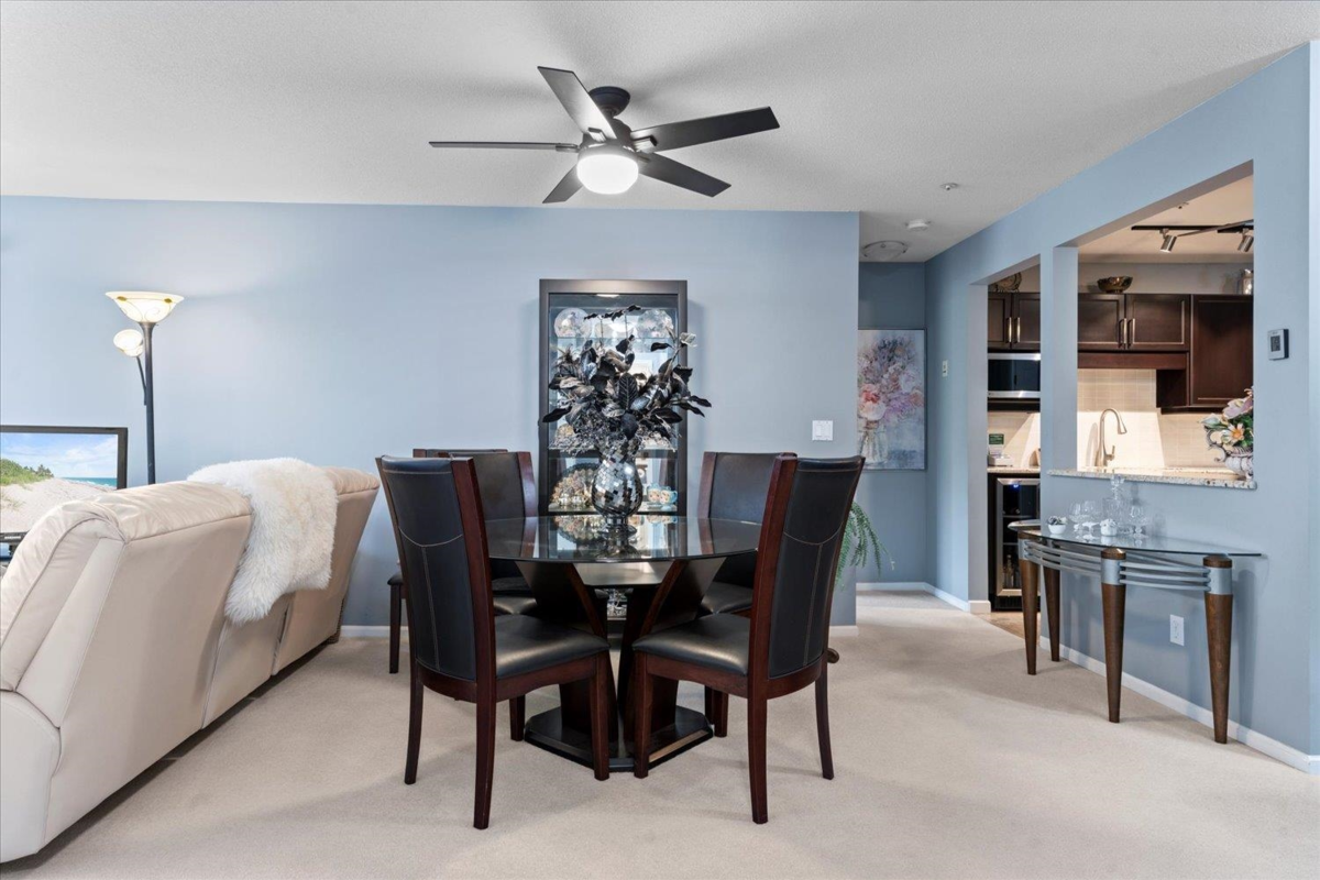 Top floor, west-facing 2 Bed + Den Condo in Bramblewoods by the Stream! Updated and move-in ready, this bright and spacious unit features a custom maple kitchen with granite countertops, stainless steel appliances and vaulted ceilings in the open-concept living area. Enjoy a natural gas fireplace (gas incl. in strata fee!) and covered deck perfect for year-round use. Primary bedroom has balcony access and a beautifully updated ensuite with separate tub/shower. Second bath also fully updated. Bonus den, oversized laundry/storage room and a storage locker in the underground area. Quiet 55+ building with a small pet allowed. Prime central location on a cul-de-sac—steps to Horn Creek Nature Path, Mill Lake and shopping. This condo offers downtown convenience without the noise!