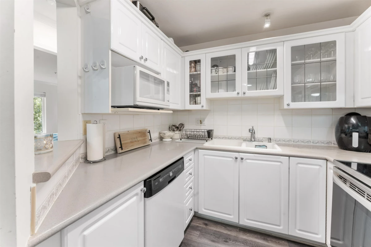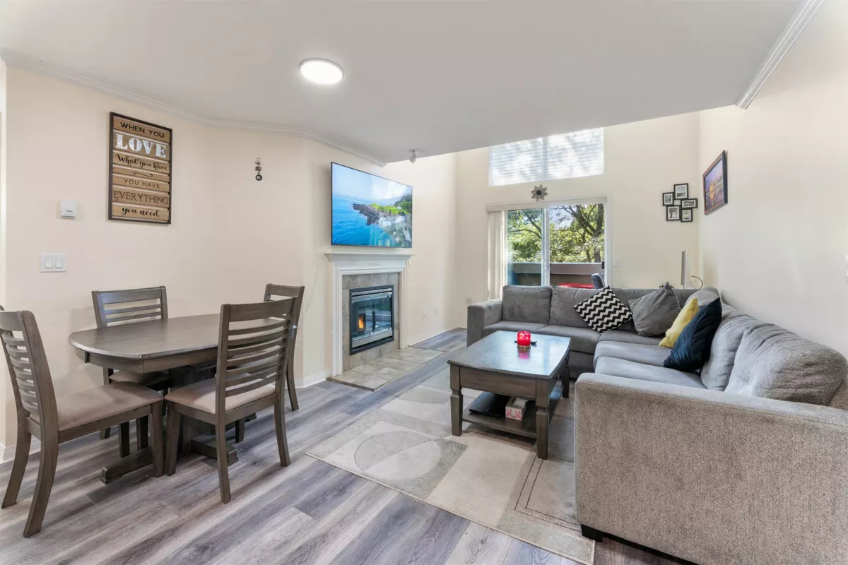 Welcome to this immaculate, bright and spacious TOP FLOOR, END UNIT which offers 2 bed & 2 bath, living room with vaulted ceiling and upgrades including floor, washer/dryer, Dish washer, hot water tank, lighting and more. Roof replaced in 2020. Unit comes with two parking spots. Well maintained building with car wash in parking. Spacious storage locker. Close to transit, shopping, Restaurants, Banks, Library & Movie Theaters. All of this yet the condo is tucked in a quiet residential setting, pets allowed and strata fee includes Radiant-Heat and Gas fireplace.