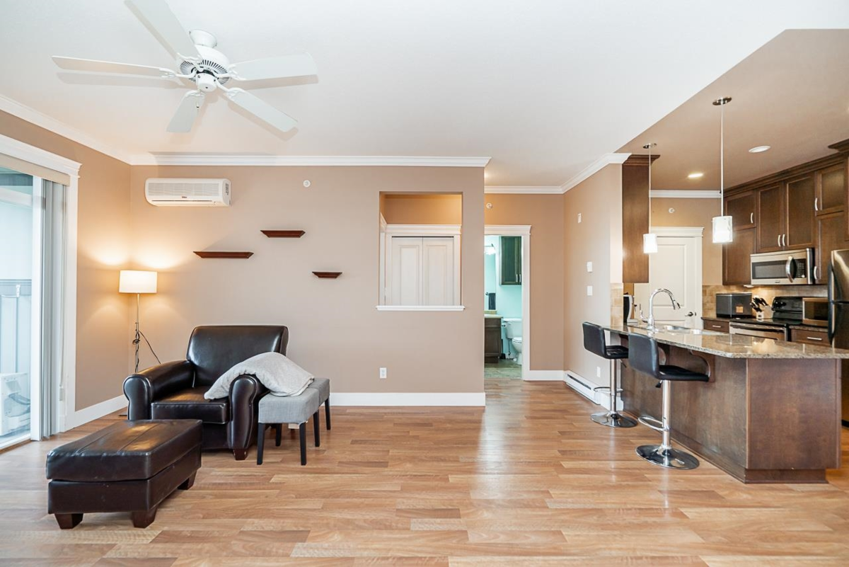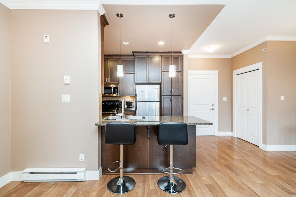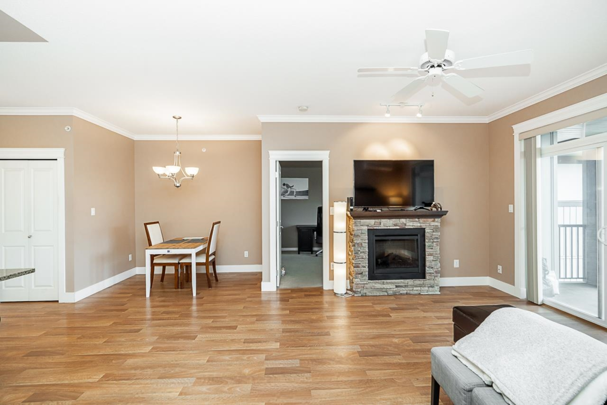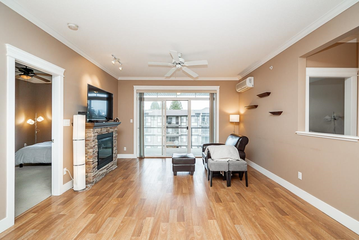 Stunning top floor condo at The Sterling complete with 2 bedrooms & 2 bathrooms. Enjoy the 9' ceilings and open concept floorplan maximizing the 1058 sqft of living space. Features include floor to ceiling kitchen cabinets with pull out shelves, granite counters, crown mouldings, laminate floors, and cozy carpeted bedrooms. Stay comfortable year-round with a heat pump and an electric fireplace. Relax on the spacious deck with room for outdoor seating. Comes with 2 side by side parking stalls and a storage locker. Perfectly situated near Mill Lake Park, shopping amenities, UFV, Abbotsford Regional Hospital, and convenient Hwy #1 access. Pets allowed.