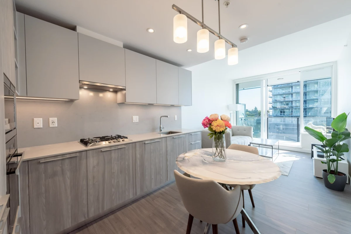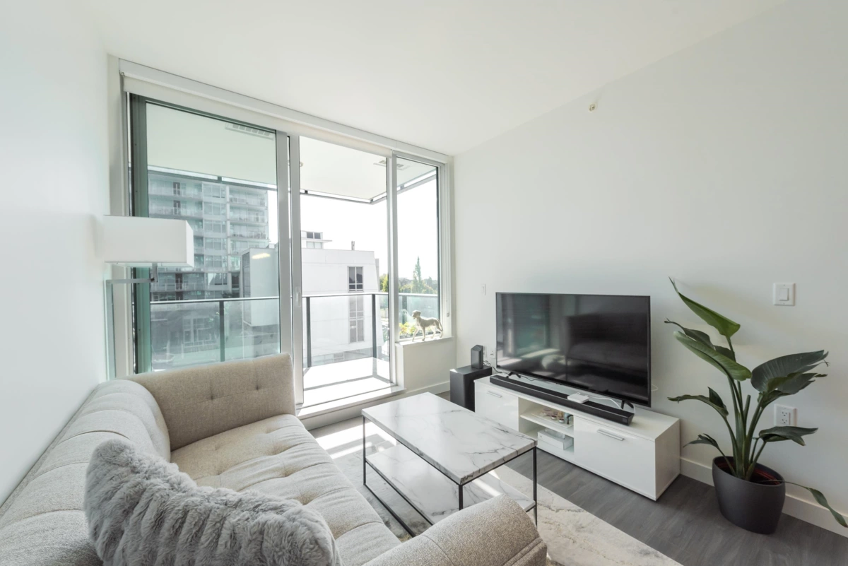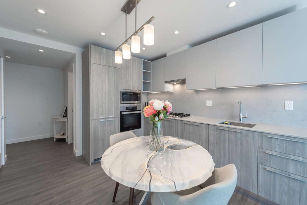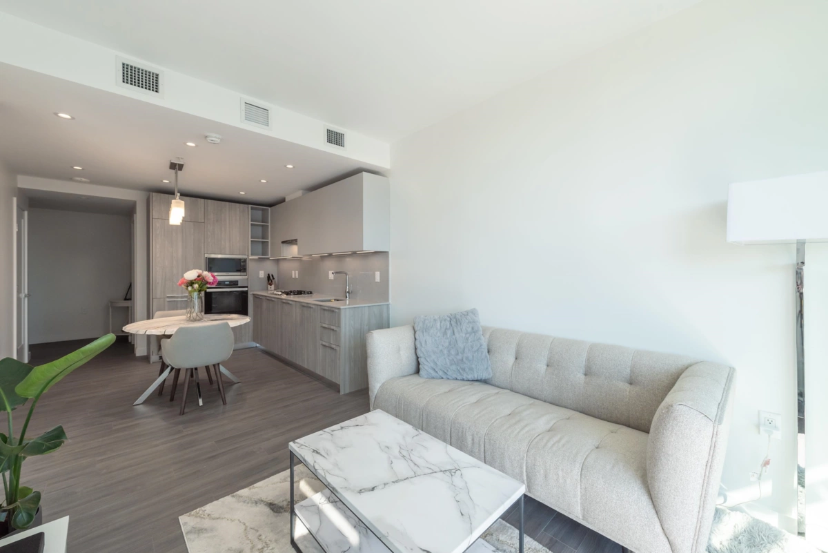 POLARIS AT METROTOWN - HIGH END FINISHING AND AIR CONDITIONED 1 BEDROOM + FLEX - Features: MIELE Appliances, Contemporary kitchens Italian-made cabinetry, quartz stone countertops/ backsplashes, Wide-plank laminate wood flooring throughout, Privacy roller shades throughout with room darkening roller shades in bedroom and Large Balcony. Amenities include: Double-height amenity space features a social lounge, virtual golf simulator, table tennis room, and meeting room, outdoor garden with fire-pit, and covered outdoor patio with BBQ. guest suite, garden plots and Gym. Steps to Bonsor Park and minutes to Metrotown shops, restaurants, Metrotown Skytrain, transit and bike lanes. 1 PARKING + 1 LOCKER.