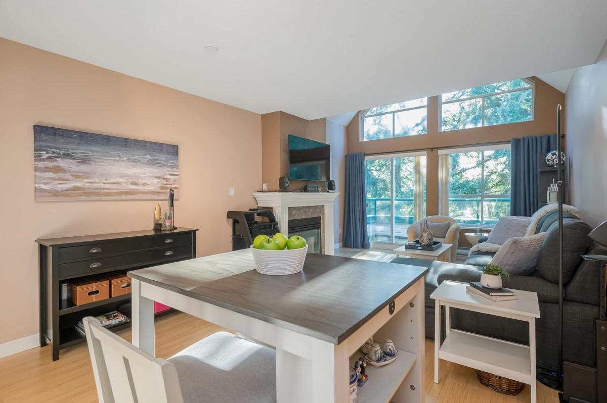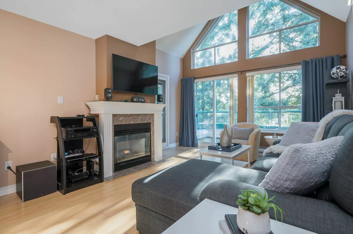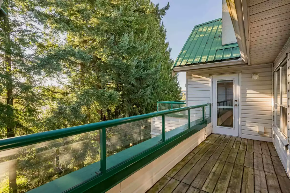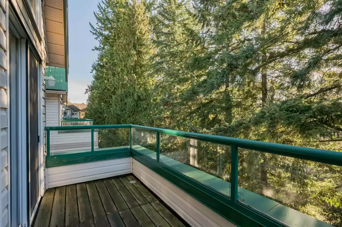 TOP FLOOR, VAULTED CEILING at Emerald Springs! Ideally located at the back of the complex with serene views of the garden and trees. This exceptional 2-BDRM, 2-BATH home is bathed in natural light and one of the best in the building, offering 967 sq ft of quiet and peaceful living. The contemporary kitchen offers excellent functionality & opens to the living room with gas F/P. Enjoy outdoor living with TWO private sundecks—perfect for soaking up daytime sun or stargazing at night. 1 Locker, 1 Parking (can rent add. parking from strata). Strata fees include gas & hot water. Amenities: rec room w kitchen, exercise room, workshop, & bike storage. Pet friendly. Located on the bus route, close to all levels of schools. Easy walking distance to nature at Mill Lake Park, shops, services & dining.