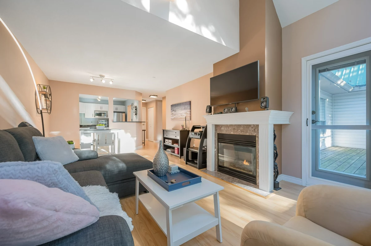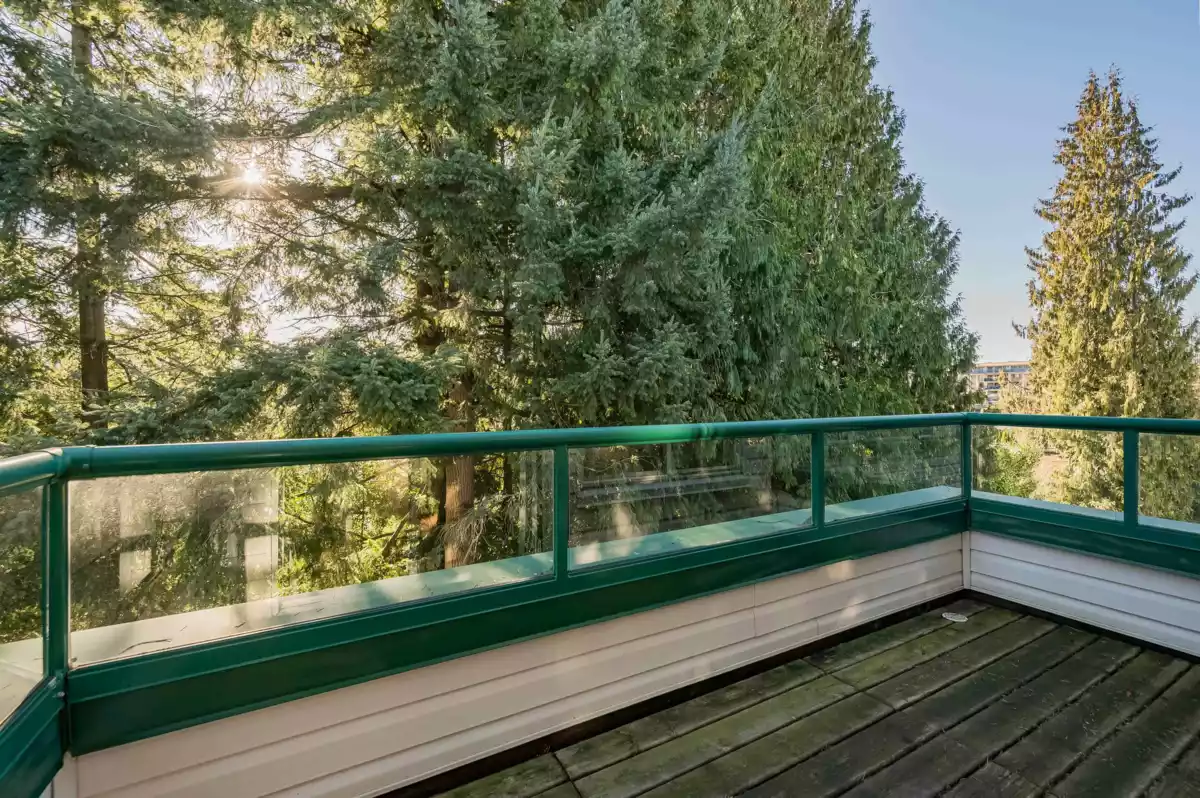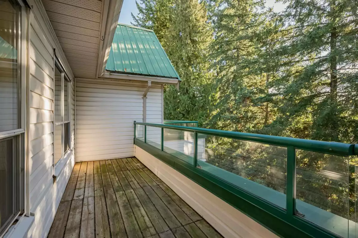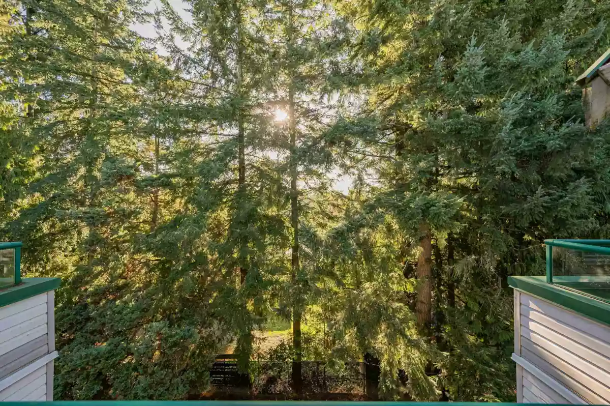 TOP FLOOR, VAULTED CEILING at Emerald Springs! Ideally located at the back of the complex with serene views of the garden and trees. This exceptional 2-BDRM, 2-BATH home is bathed in natural light and one of the best in the building, offering 967 sq ft of quiet and peaceful living. The contemporary kitchen offers excellent functionality & opens to the living room with gas F/P. Enjoy outdoor living with TWO private sundecks—perfect for soaking up daytime sun or stargazing at night. 1 Locker, 1 Parking (can rent add. parking from strata). Strata fees include gas & hot water. Amenities: rec room w kitchen, exercise room, workshop, & bike storage. Pet friendly. Located on the bus route, close to all levels of schools. Easy walking distance to nature at Mill Lake Park, shops, services & dining.