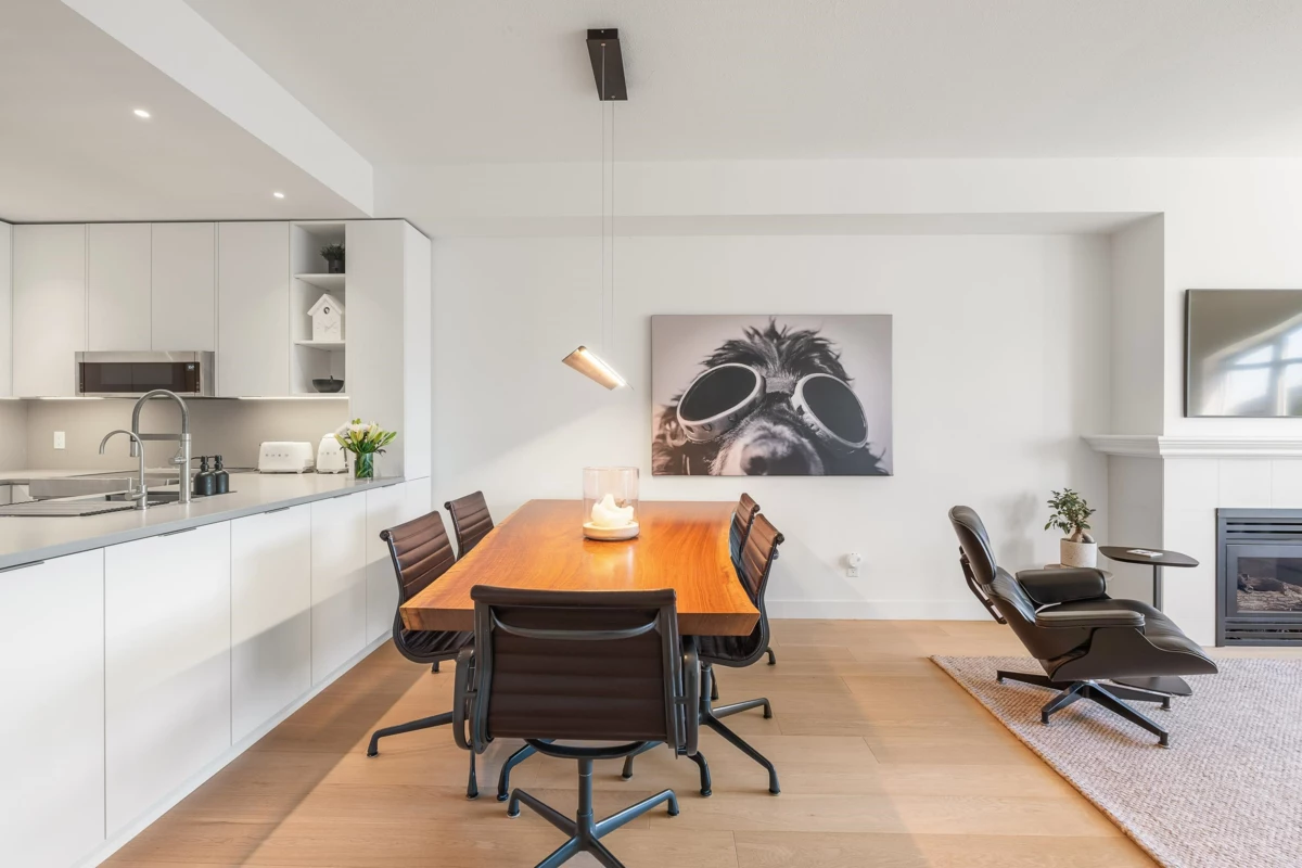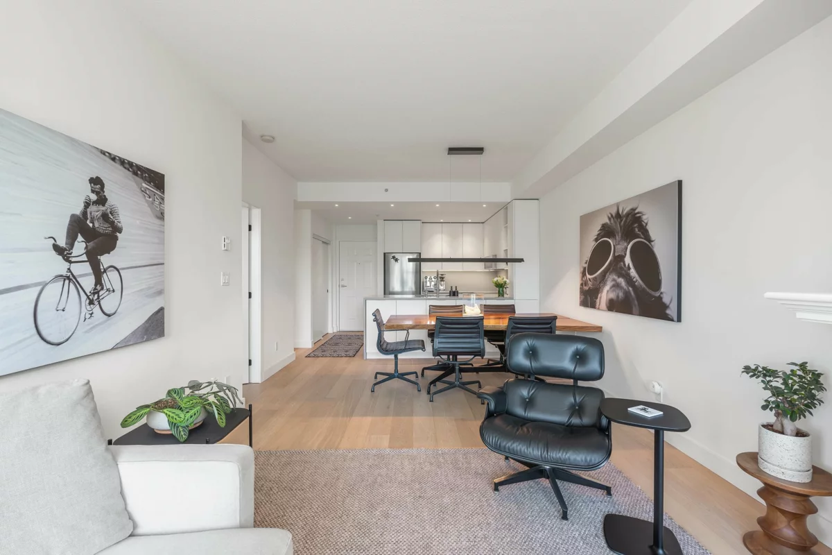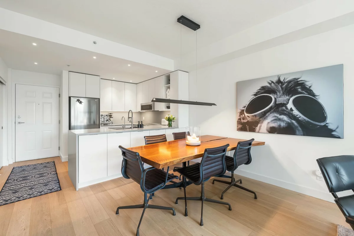 Experience elevated coastal living in this beautifully renovated 2 bed, 2 bath condo in the serene Raven Woods community. With 1,003 sq. ft. of open-concept living space, this move-in ready home features a stunning renovation: Caesarstone quartz counters throughout, high-end custom cabinetry, designer lighting, and spa-inspired bathrooms. Enjoy a southwest-facing deck with ocean inlet views, spacious primary bedroom with walk -in closet, in-suite laundry, plus 2 parking stalls, storage locker, exercise room, bike room, and car wash. This concrete building is pet friendly and offers direct access to world-class hiking and biking trails, excellent schools, and the Deep Cove waterfront. Surrounded by nature and a vibrant community, this home offers the very best of North Shore living.