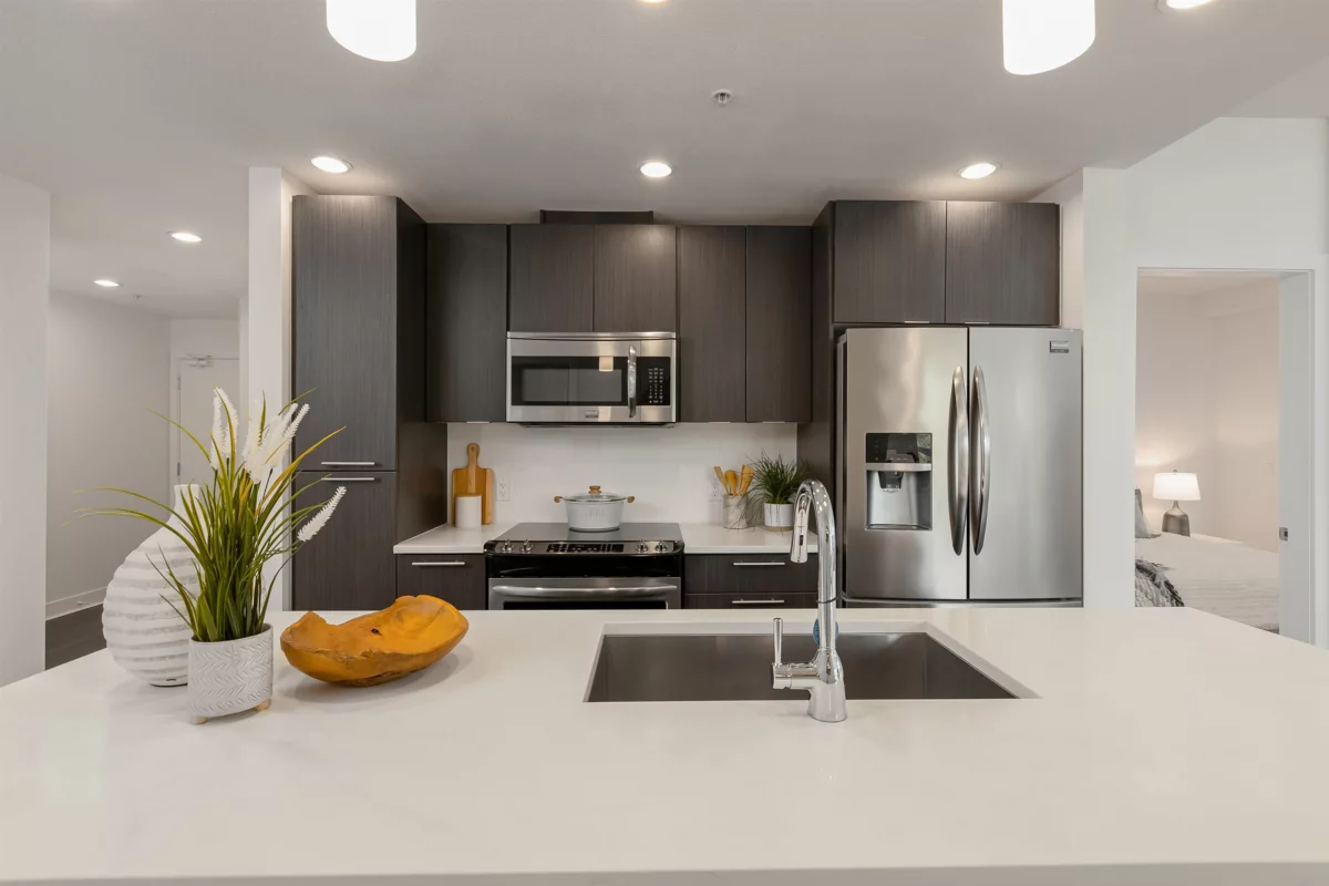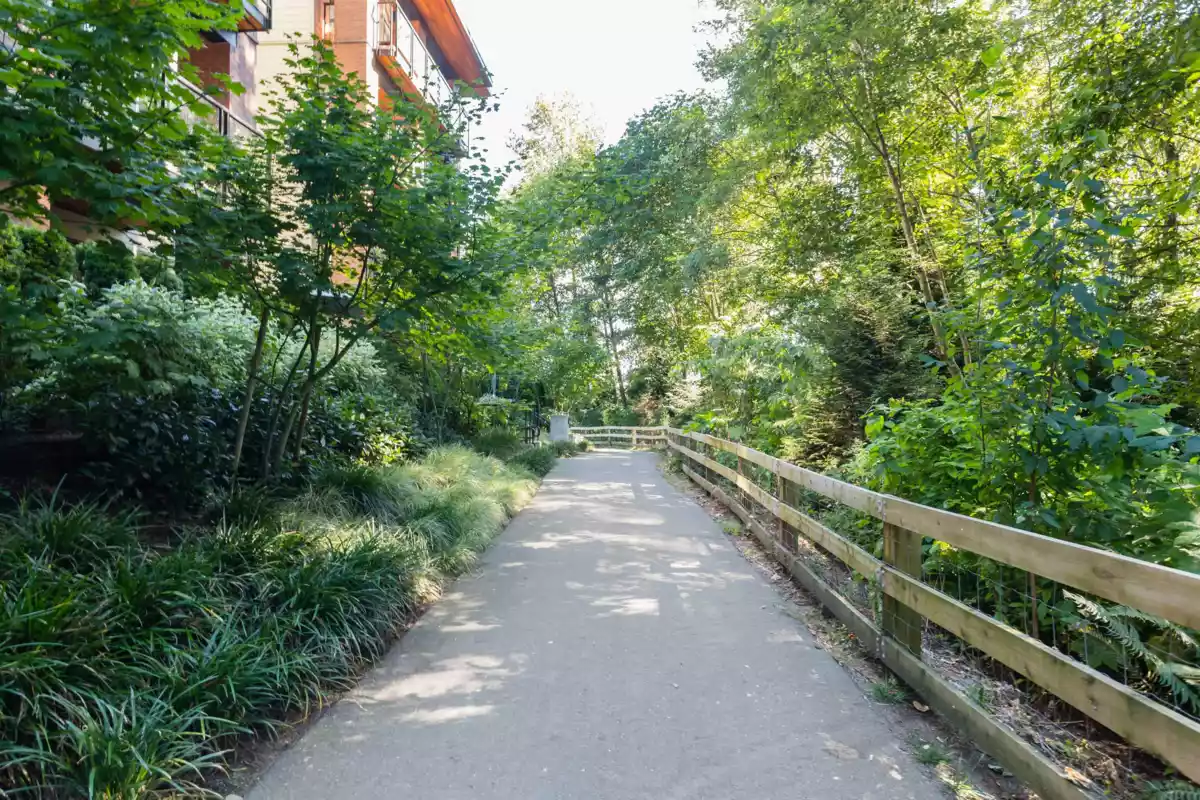 Incredible opportunity to own a rare 3 bedroom corner suite at "The Shore" by Adera. Positioned perfectly, you'll enjoy the privacy & peaceful views of Mosquito Creek from two oversized patios. Featuring an open concept floor plan w/ floor-to-ceiling windows, the home is flooded with natural light. The kitchen offers an island w/ bar seating, ideal for those that love to entertain & enjoy casual meals. Separate primary bedroom w/ gorgeous ensuite bathroom. Further features incl. radiant in-floor heating, s/s appliances & fresh paint. Complex offers an impressive patio area w/ water feature, gym, yoga room & kid's play area. Located in a thriving community w/in steps of the North Shore Spirit Trail, future Harbourside waterfront community, shopping, restaurants & more!