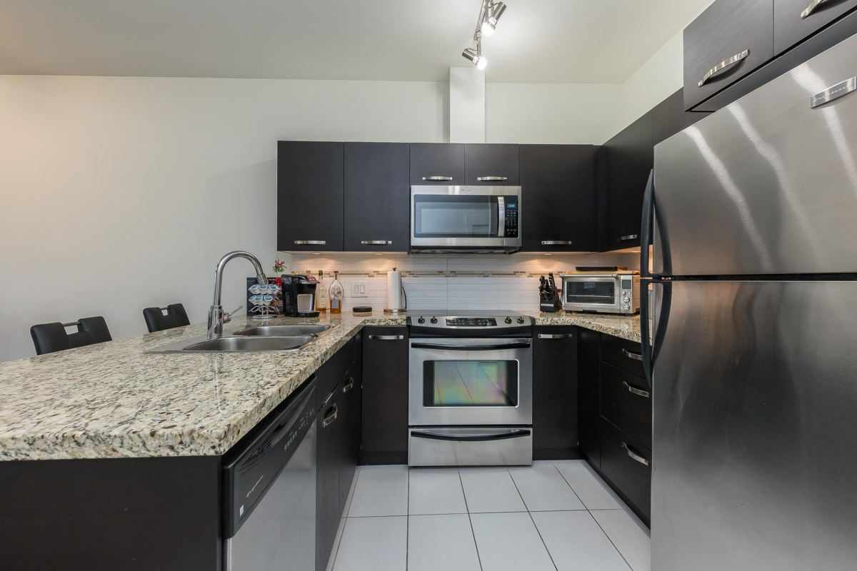 TOP FLOOR PENTHOUSE.....Vaulted ceilings. This 2 bedroom, 2 bath unit has a gourmet kitchen with granite counters and stainless steel appliances. Abundant natural light streams through the tall windows that open up to a generous sundeck. Secure complex offers a gym, storage locker and 2 parking stalls. Ideal location is within walking to distance to Abbotsford Entertainment Spots Center, the University of the Fraser Valley, Hospital and Shopping and Dining. Easy access to Highway 1. No Age Restrictions and 1 cat allowed.