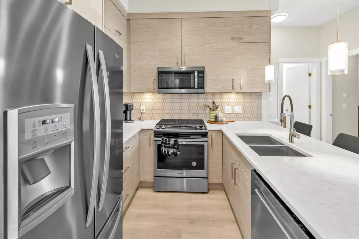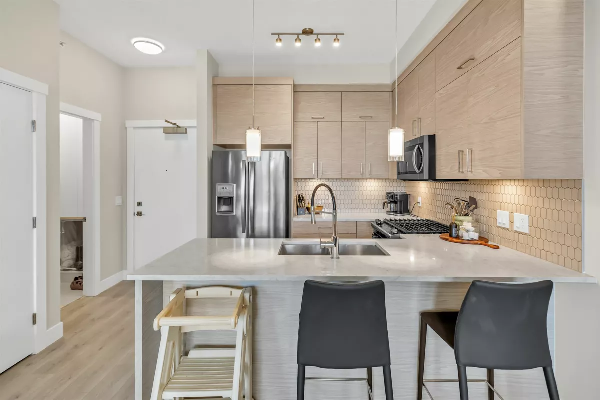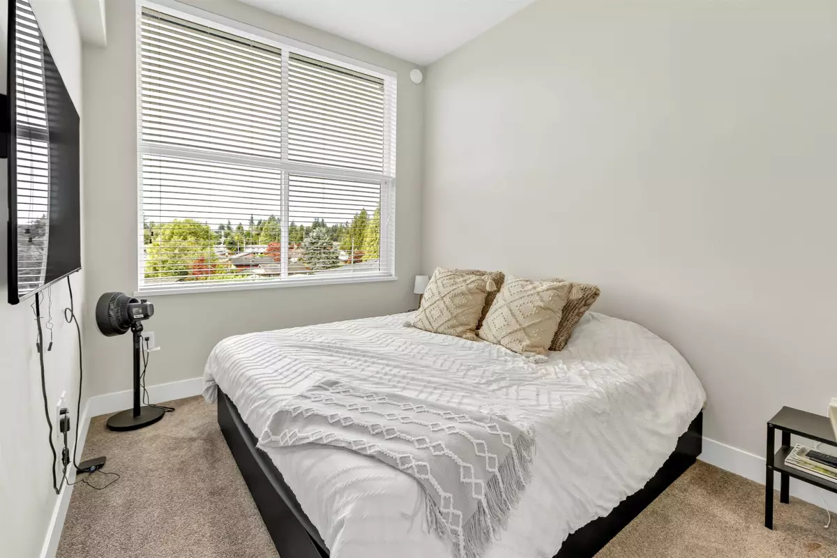 Welcome to the Onyx — a centrally located Abbotsford condo community offering exceptional convenience and comfortable contemporary living. This top-floor 2-bedroom plus den, 2-bath residence gives you both privacy and light, with the added advantage of being on the building’s 4th (top) level for quieter living and great sightlines. Step inside to an inviting layout designed for everyday life and entertaining. The flexible den is perfect as a dedicated home office, study, or small guest room. Two full bathrooms mean mornings are simpler for everyone. The bedrooms are well-proportioned and separated from the living area for added privacy. Gas range, and stainless steel appliances bring this kitchen to life, and bring your morning coffee out on the patio to enjoy the beautiful views.